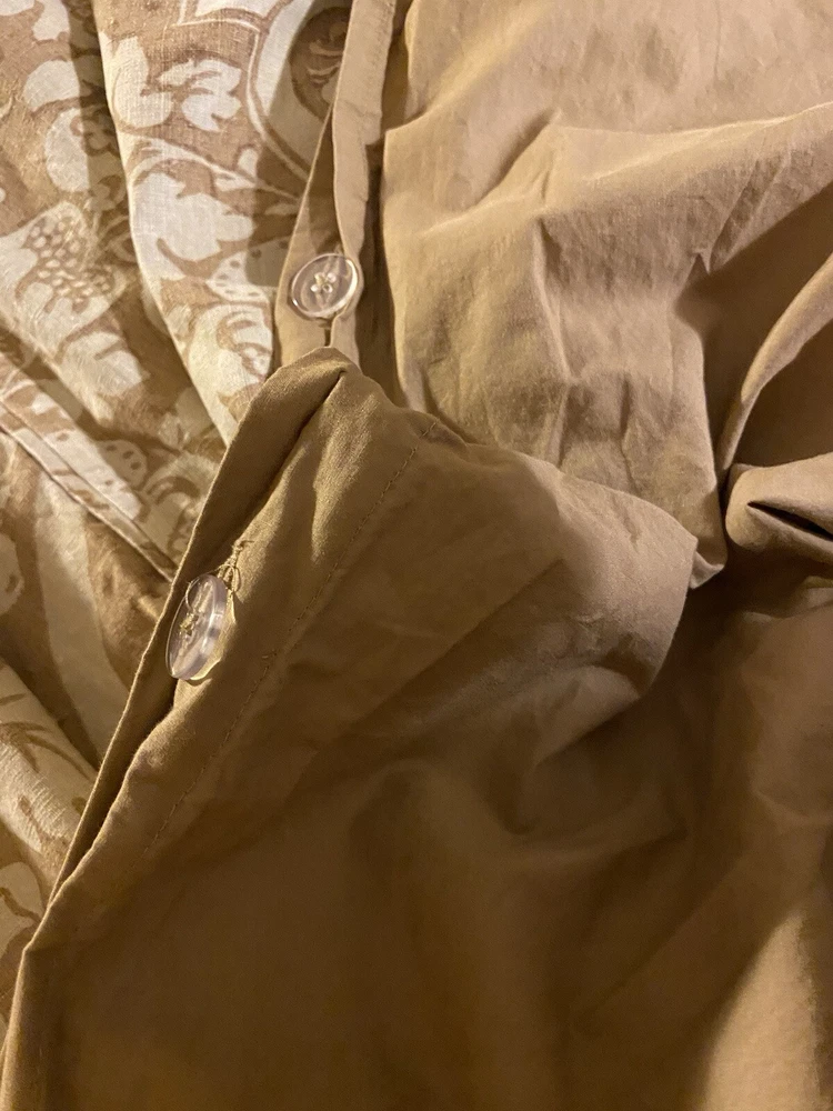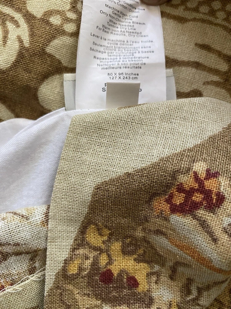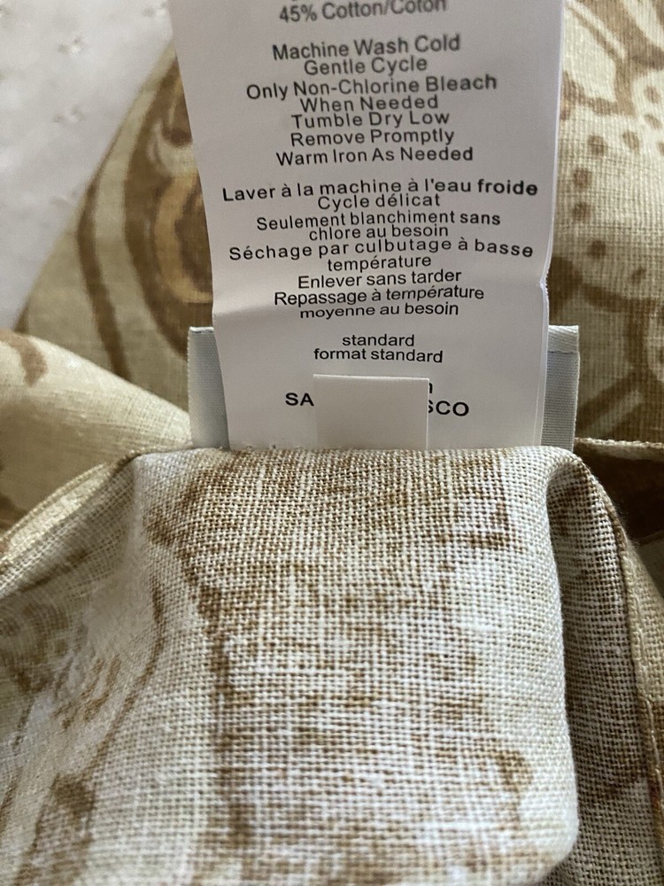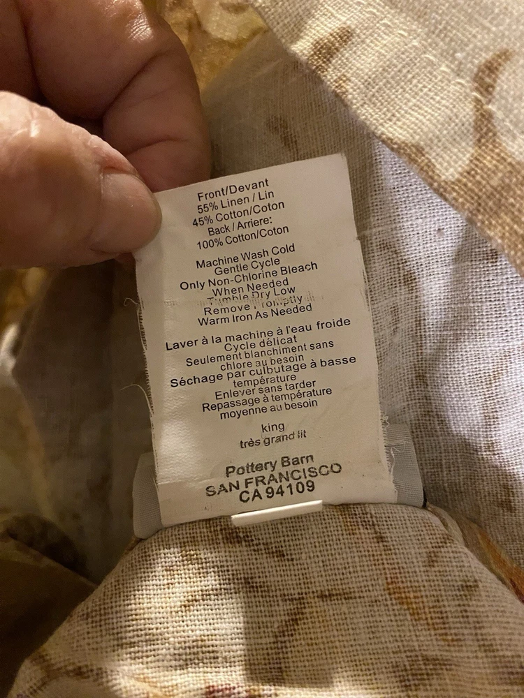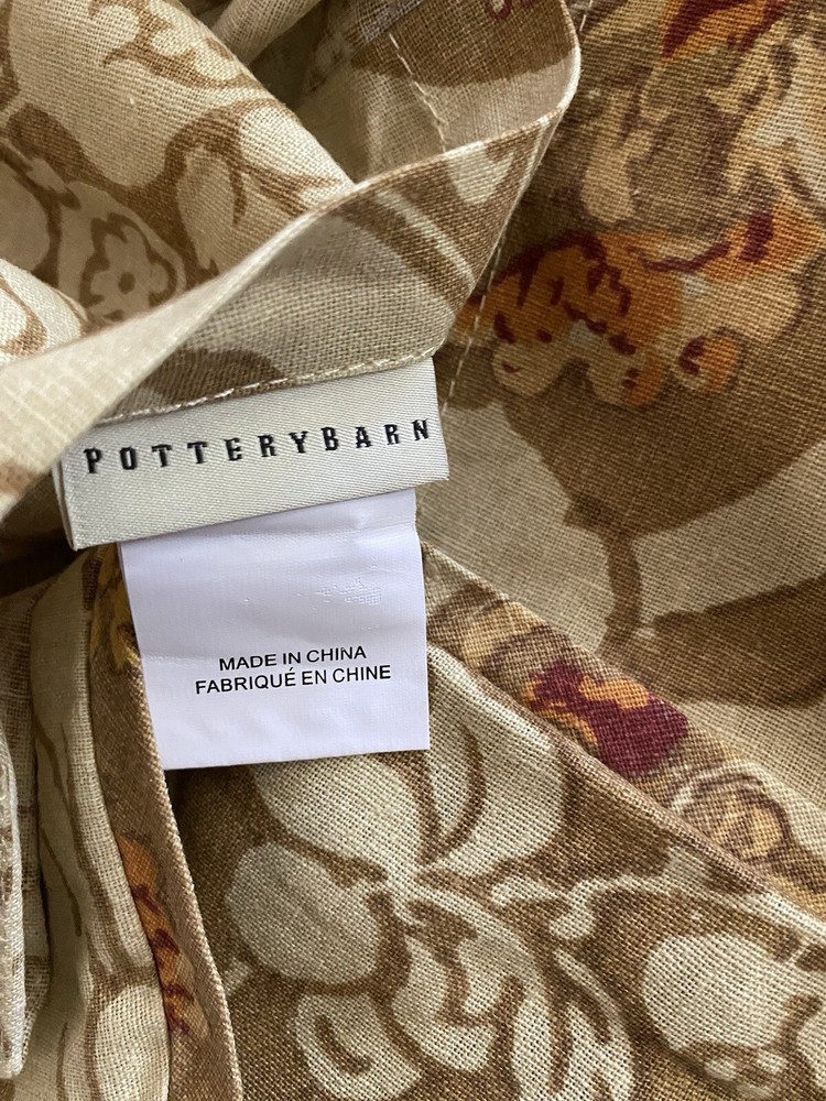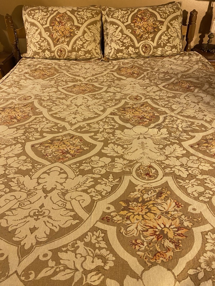 Add a touch of luxury to your bedroom with this beautiful Pottery Barn King Duvet Cover in the stunning Camilla pattern with gold/tan flowers. The cover is made of a blend of cotton and linen which is very natural and breathable. The set includes king duvet cover, two stand pillow shams and a pair of lined matching drape panels adding a cohesive touch to your bedding collection. Machine wash and tumble dry for easy care instructions. All cleaned and ready for use.