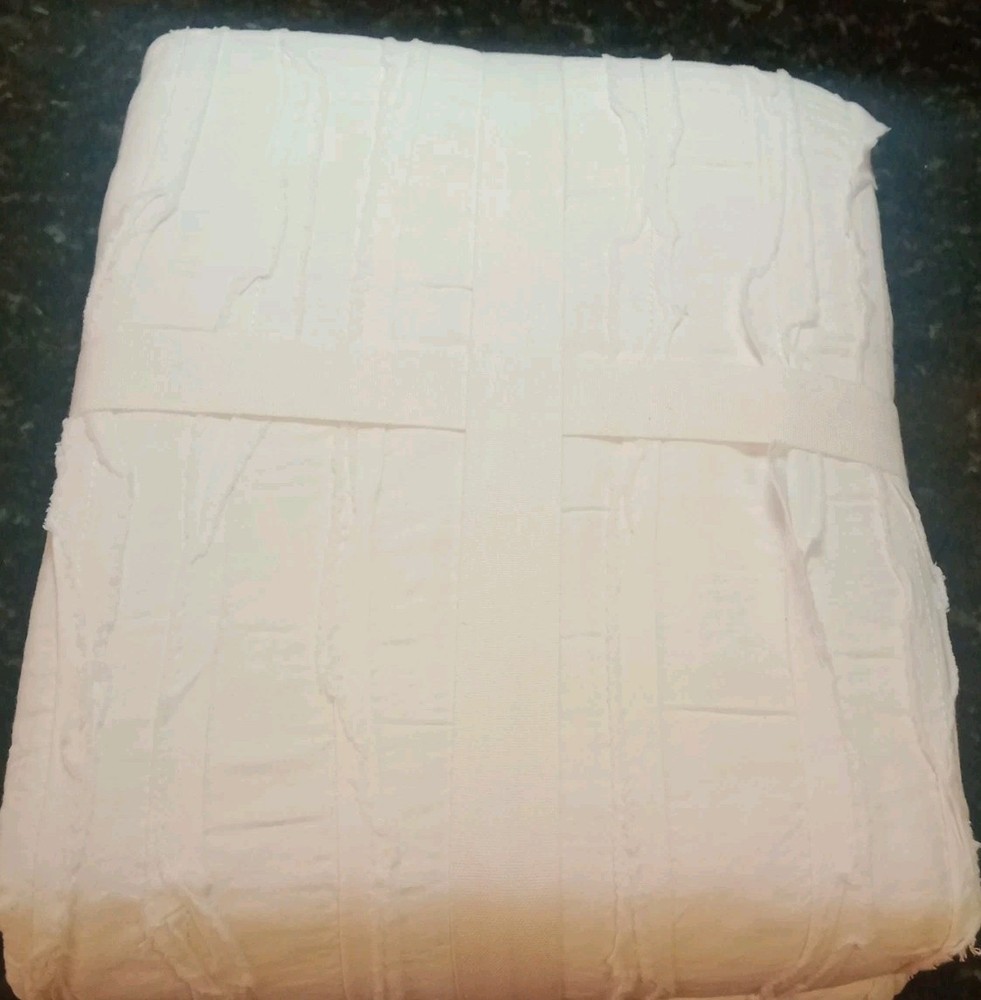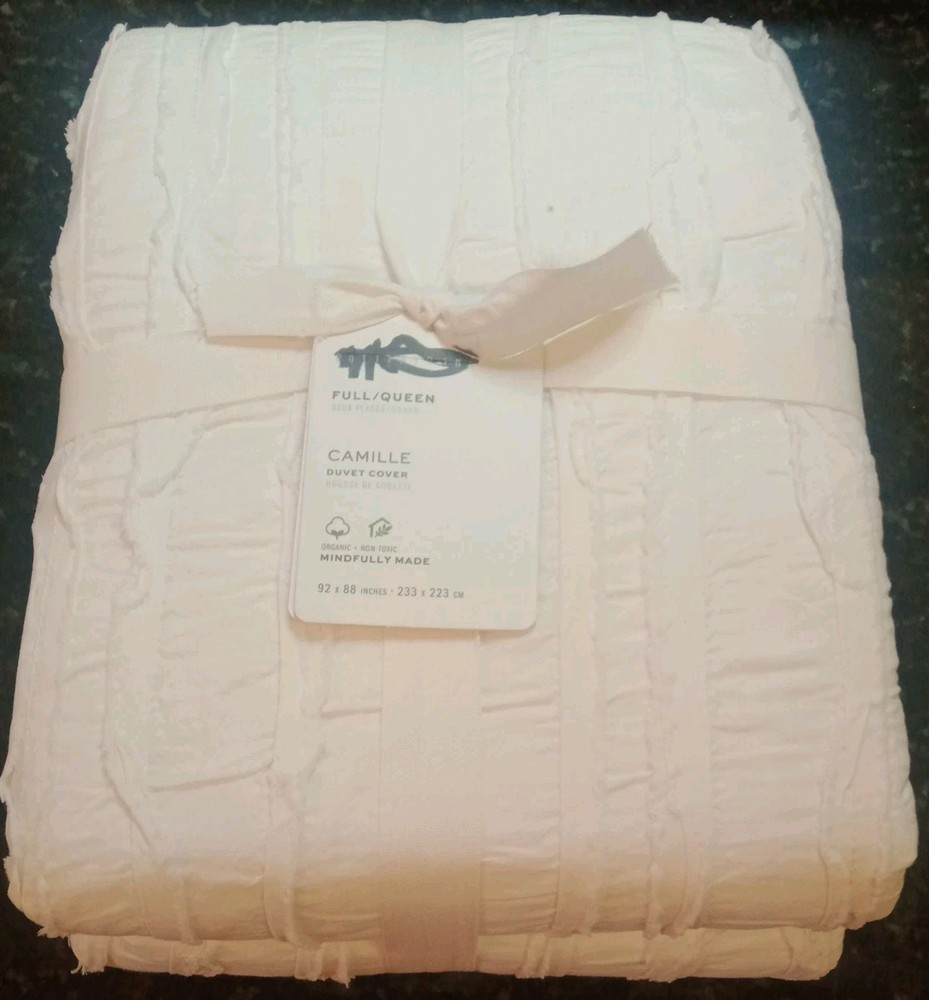 The Pottery Barn Camille Duvet Cover in Full/Queen size is a luxurious and stylish addition to any bedroom. Made from 100% cotton with a solid white color, this duvet cover exudes modern elegance. It is machine washable for easy care and includes the duvet cover itself, perfect for creating a cozy and indulgent atmosphere in your space. The Pottery Barn Camille Duvet Cover is a high-quality and timeless piece that will elevate your bedroom decor.
