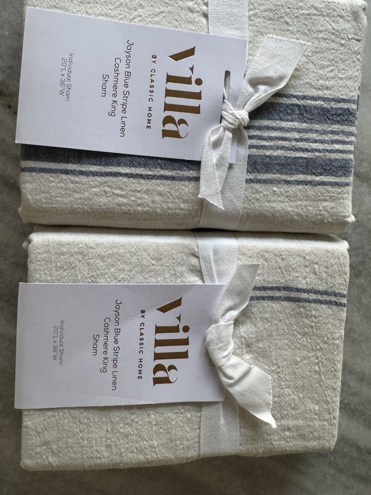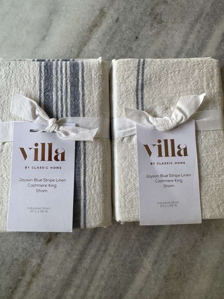 Two king shams : 20" w x 36" l Expertly crafted of 70% linen, 25% cotton, and 5% cashmere. Blue striped Pottery Barn Caprina Linen Cashmere Striped Sham or also known as Villa home Jayson Stripe Linen Cashmere King Sham Yarn-dyed fiber has incredibly rich color that holds its vibrancy over time. Imported. Linen will get softer with every wash. Machine wash in cold water separately on gentle cycle. Use only non-chlorine bleach, if needed. Line or tumble dry on a low temperature.