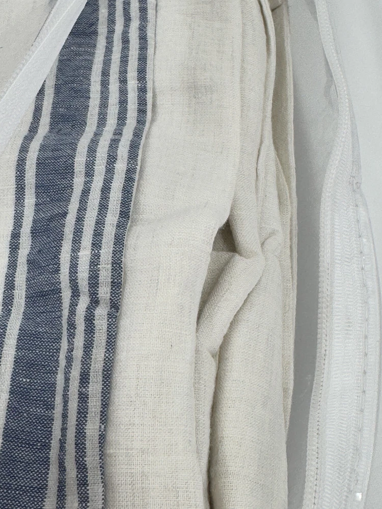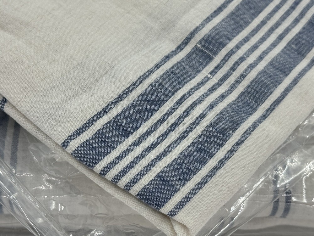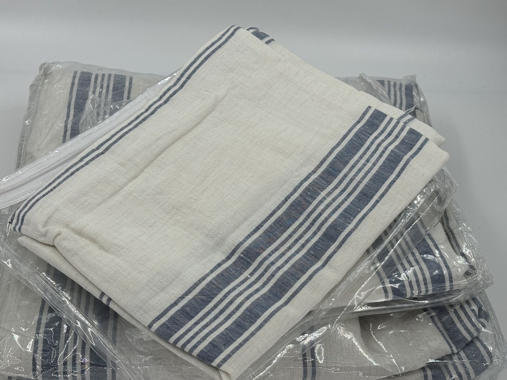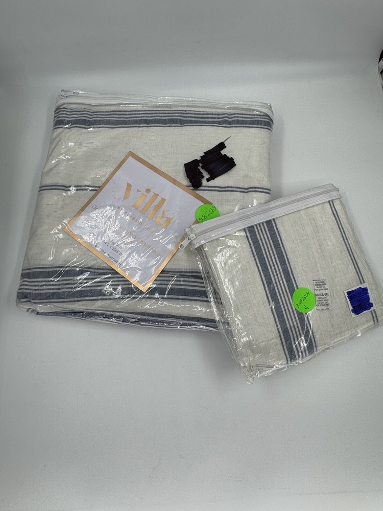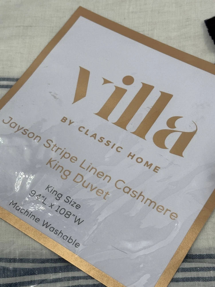 NWT Pottery Barn Caprina Linen Cashmere Striped King Duvet Cover +2 King Shams This set retails for over $700! This item is made by Pottery Barn partner, Villa, and sold by Pottery Barn as the Caprina Duvet Cover. Villa sells it and tags it as the Jayson set. We love linen for its light touch, and cashmere for its pure luxury. Combining them only seemed natural. Woven together in a striped pattern like our favorite French linens, the watery blue and white is a classic palette that always feels fresh. Expertly crafted of 70% linen, 25% cotton and 5% cashmere. Duvet features a hand sewn button closures and inside ties to hold duvet in place. King: Duvet: 108" w x 94" l King Sham: 36" w x 20" l
