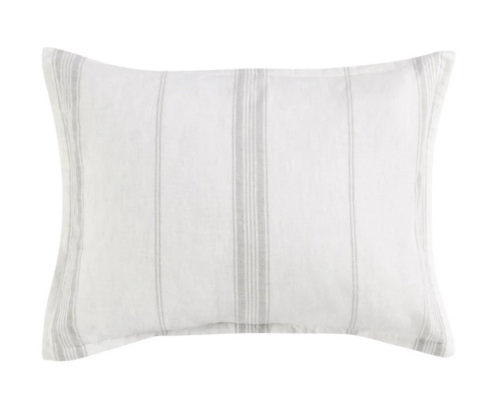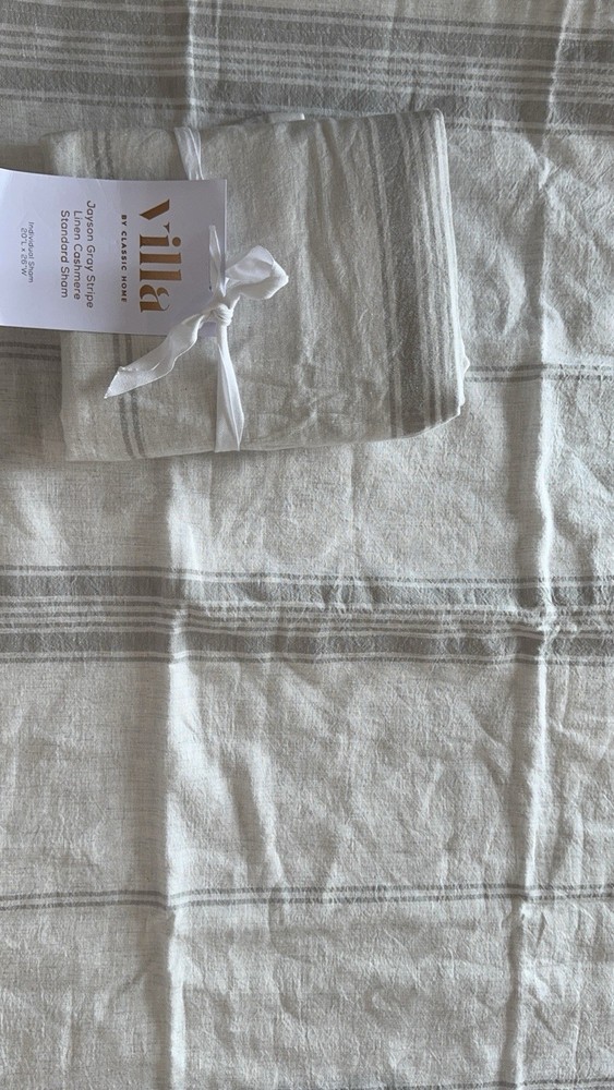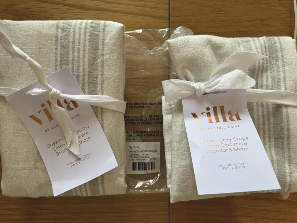 2 standard shams in gray & cream Pottery Barn Caprina Linen Cashmere Striped Sham or also known as Villa home Jayson Stripe Linen Cashmere King Sham Front & Back : 70% Linen, Lining : 100% Cotton 25% Colton, 5% Cashmere 20 X36" We love linen for its light touch, and cashmere for its pure luxury. Combining them only seemed natural. Woven together in a striped pattern like our favorite French linens, the soft grey and cream is a classic palette that always