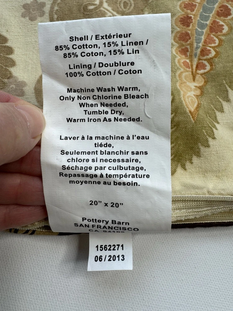 This Pottery Barn Cassandra pillow sham is a beautiful square cover designed with a brown floral pattern, perfect for adding a touch of elegance to your bedroom. Made from a blend of cotton and linen, this 20” square pillow cover is ideal for decorating your bed. The Pottery Barn branding ensures quality and style in this decorative piece.