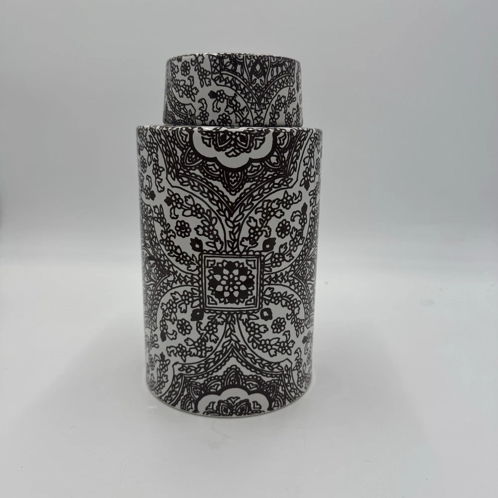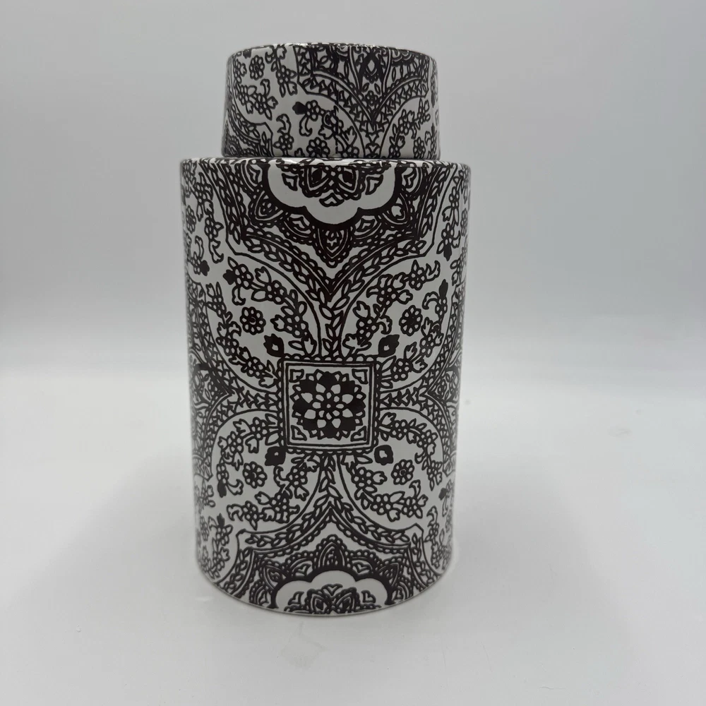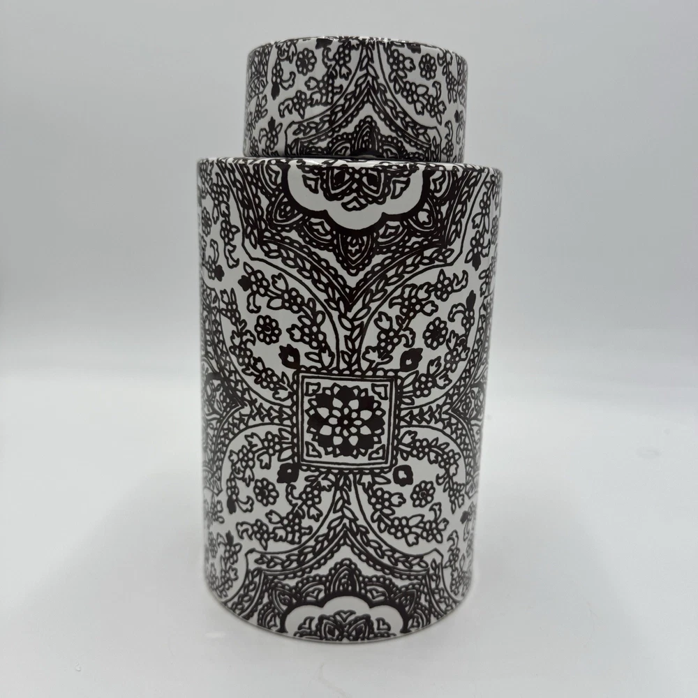 Add a touch of classic elegance to your home decor with this Pottery Barn ceramic jar. The jar features a beautiful brown and white floral paisley pattern that is sure to complement any style. Measuring 5 inches in length, width, and diameter, and standing 9 inches in height, this medium-sized cylinder jar is perfect for decorative use. Crafted in China using pottery production techniques, this jar has a glossy finish and comes with a free-sitting lid. The jar is not for food use and has one compartment. It is an original piece and not a licensed reproduction. This decorative jar is ideal for serving drinks or storing small items and will add a touch of sophistication to any room.