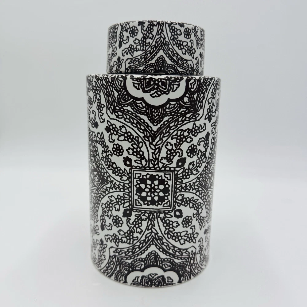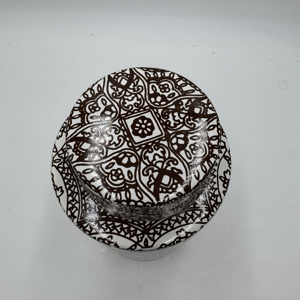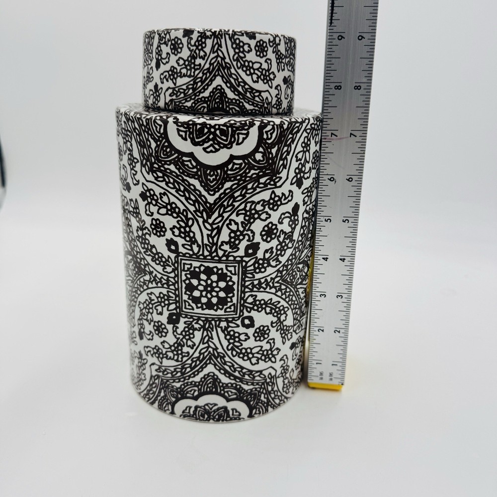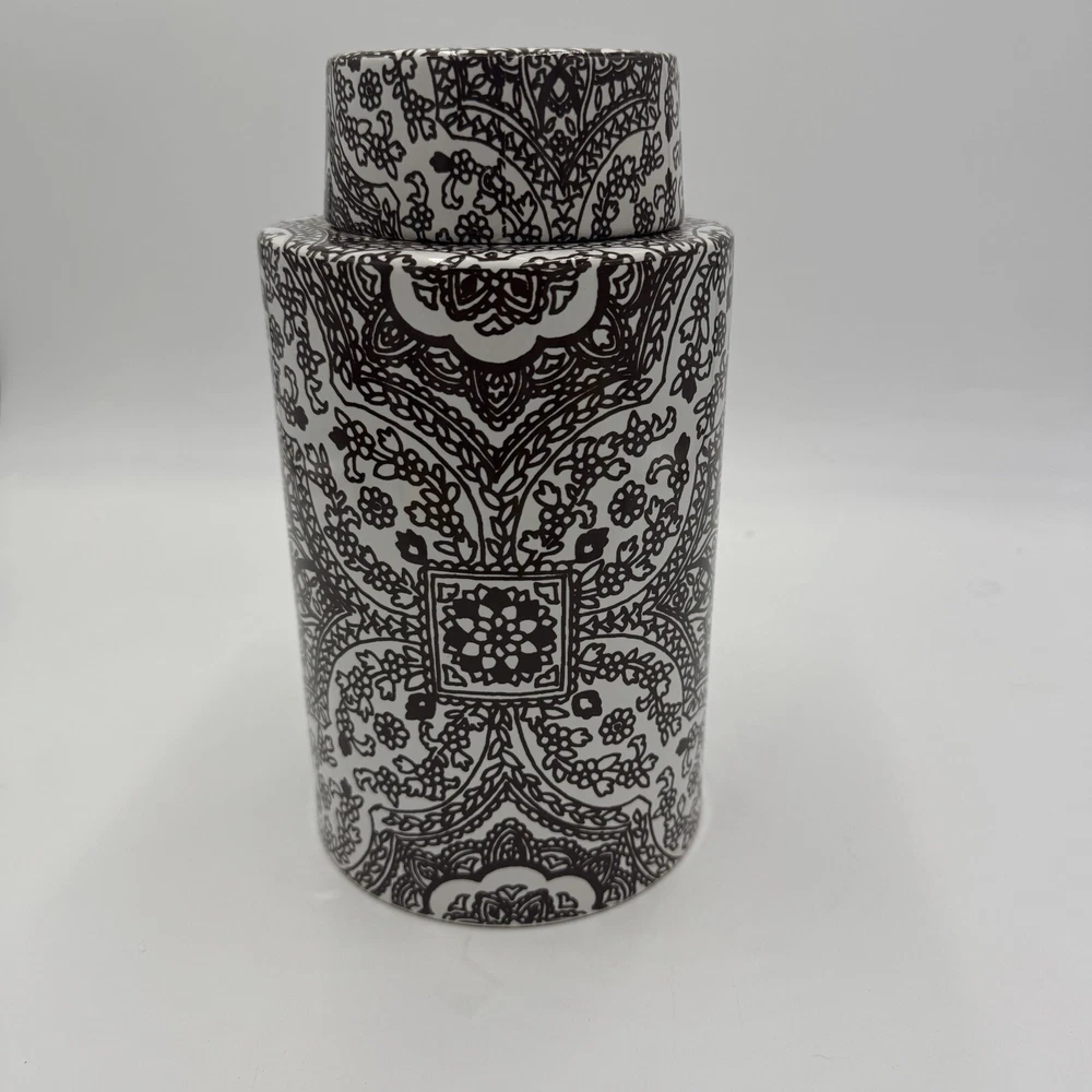 Add a touch of classic elegance to your home decor with this Pottery Barn ceramic jar. The jar features a beautiful brown and white floral paisley pattern that is sure to complement any style. Measuring 5 inches in length, width, and diameter, and standing 9 inches in height, this medium-sized cylinder jar is perfect for decorative use. Crafted in China using pottery production techniques, this jar has a glossy finish and comes with a free-sitting lid. The jar is not for food use and has one compartment. It is an original piece and not a licensed reproduction. This decorative jar is ideal for serving drinks or storing small items and will add a touch of sophistication to any room.