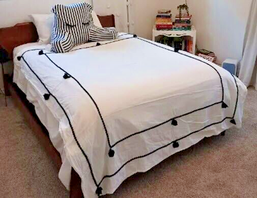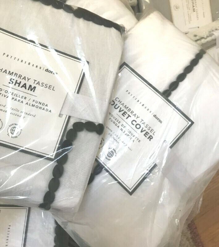 POTTERY BARN TEEN CHAMBRAY TASSEL DUVET For a stylish sleep space that pops, deck out your bed with the Chambray Tassel Duvet. Playful tassel, pom-pom accents and supersoft fabric make this a must-have! This sustainably sourced duvet is STANDARD 100 by OEKO-TEX® certified, so you can rest assured knowing it’s free of hundreds of harmful substances. Handcrafted of 100% cotton chambray. Yarn-dyed fiber has incredibly rich color that holds its vibrancy over time. Twin-sized duvet cover fits both standard twin and twin XL dorm mattresses. Duvet cover and shams reverse to the same as the front. Duvet cover has interior ties and a hidden button closure; sham has a flap closure. Machine wash. Imported. Auct ion is for TWIN Duvet cover. Color available is WHITE with BLACK TRIM. Items are BRAND NEW in ORIGINAL PACKAGING. A d d i T i O N a l P h o T O s A v a i L a B Le U p O n R e Q u e S T PURCHASED DIRECTLY FROM POTTERY BARN TEEN . AUTHENTIC.