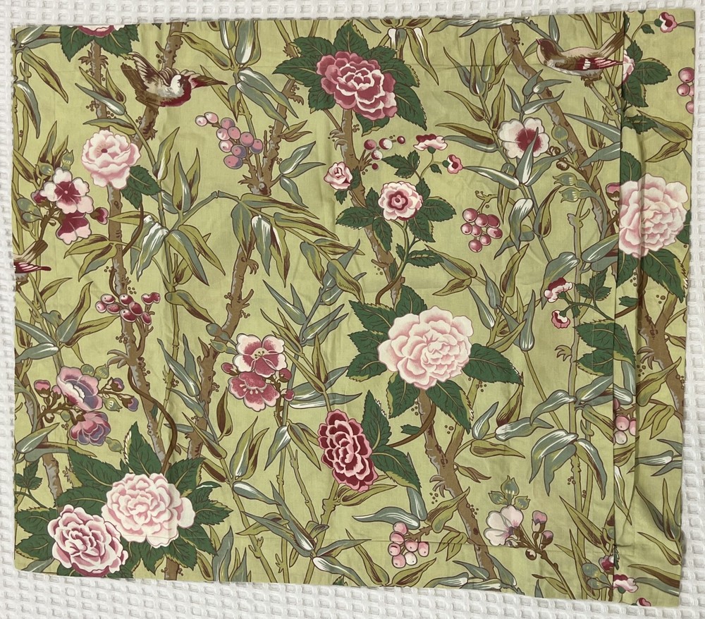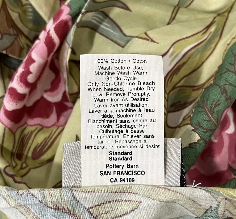Pottery Barn Chatsworth Floral Standard Pillow sham Green Pink Floral Cotton Standard pillow sham in the Chatsworth Floral pattern 100% Cotton Green and pink floral, leaves Slip back opening Measures approx. 30" x 24" with a 2" stitched flange around border, making insert size 26x20" Pre-owned in very good to excellent condition; no rips, no stains, no tears, no damage; Smoke/pet-free environment
