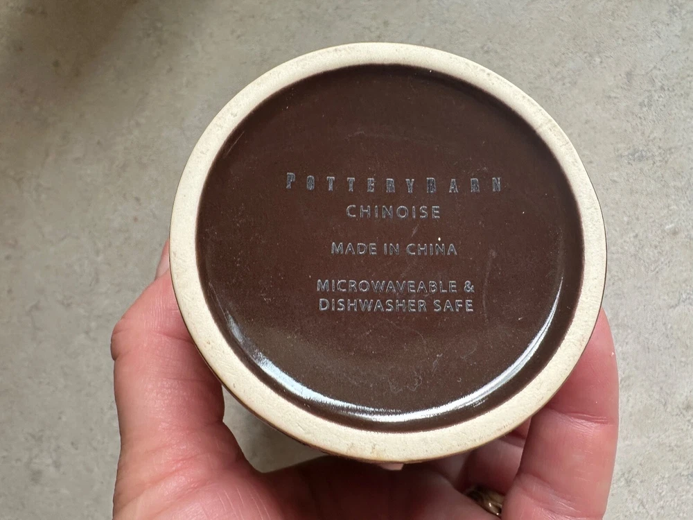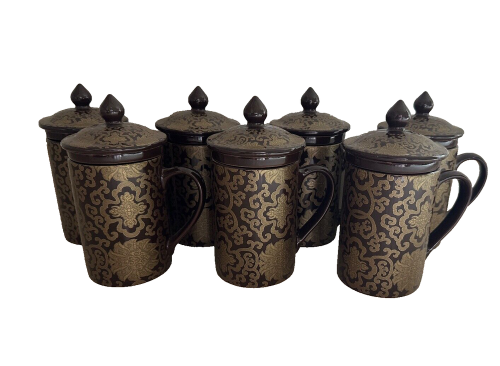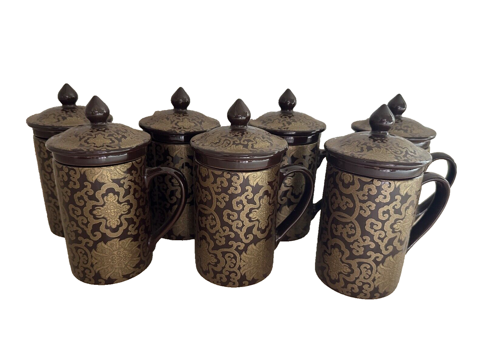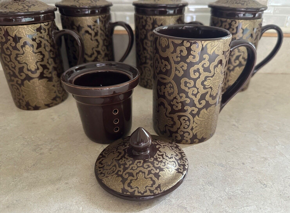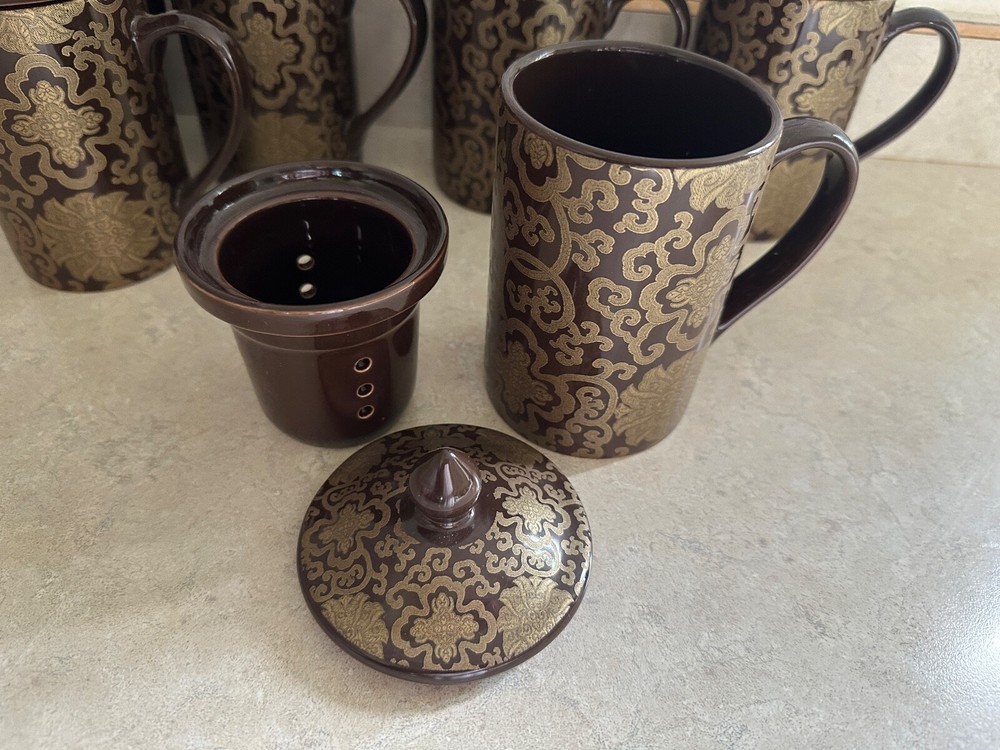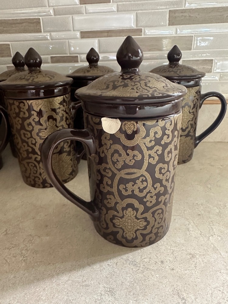 Pottery Barn "Chinoise" Lidded 7 Tea Cups W/ infuser Keep Tea Warm Cocoa & Gold New! Please note: one cup has a cheap. Please refer to the pictures for more details. Brown with a gold tone overlay design. Holds approximately 10 ounces. Dishwasher and microwave safe. From Pottery Barn. Comes from a smoke free home. SHIPPING and PAYMENT: Payment is expected within 2 days of auction closing. Item will be shipped within 2 business days of cleared payment. All shipping will be mailed via USPS Mail w/ delivery confirmation. I will always combine shipping!