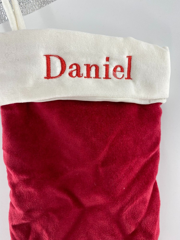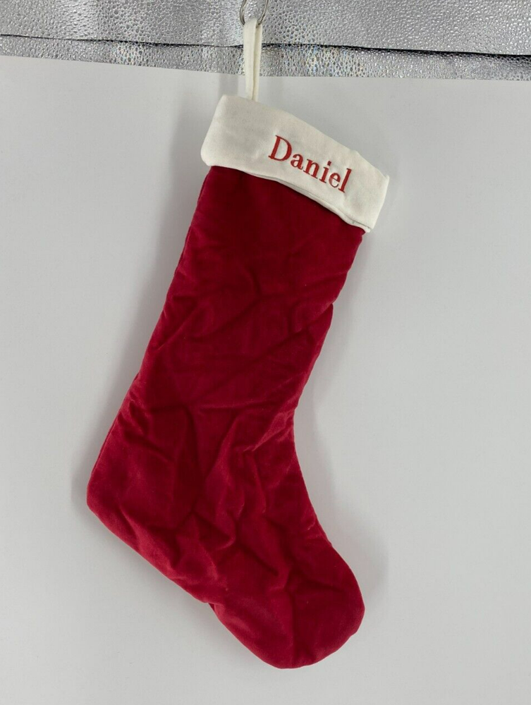 Please read the full description and View pictures before purchasing: Pottery Barn Christmas Stocking DANIEL Monogram Stitched Velvet Holiday 16" See photos provided. While we try to represent to the best of our ability with photos an accurate picture of products, we cannot guarantee an exact match of color/ texture. Please understand that the actual color of the item may differ from photos, depending on lighting situations and monitor settings.