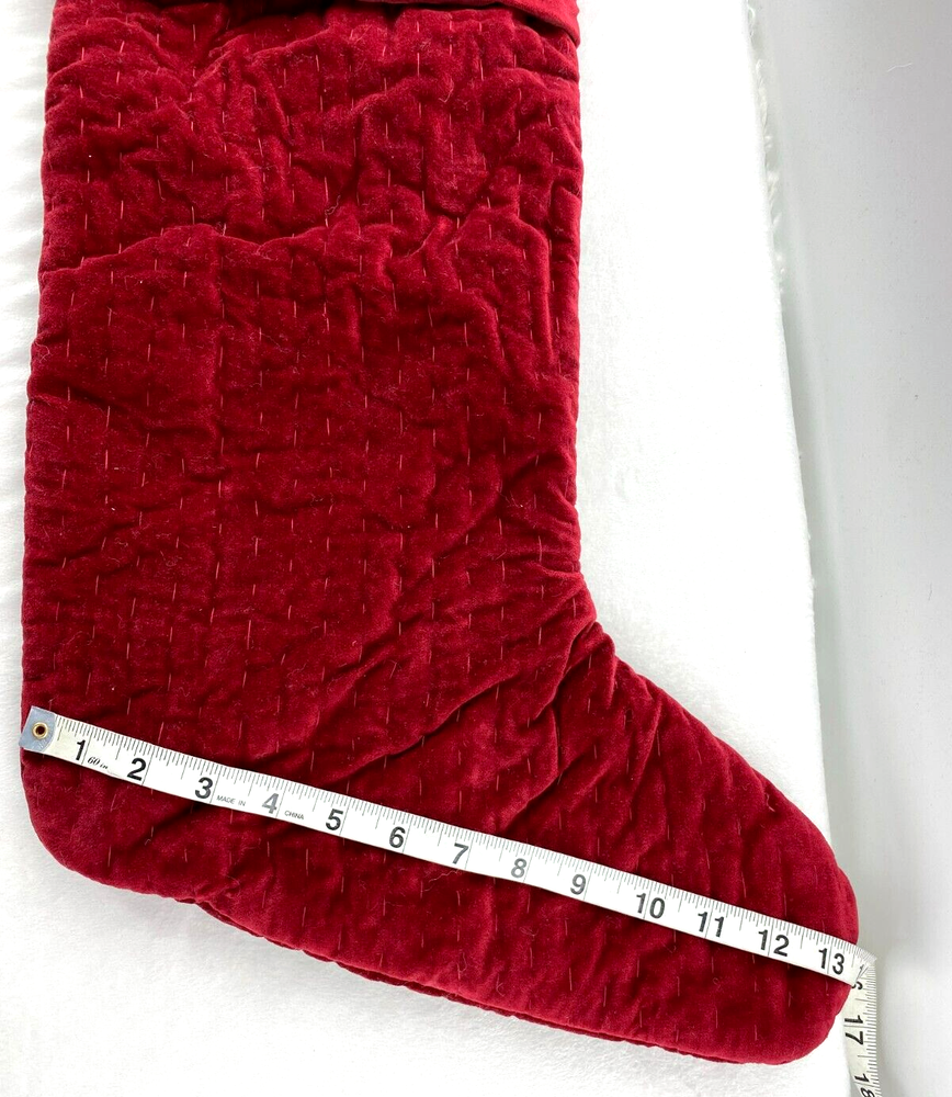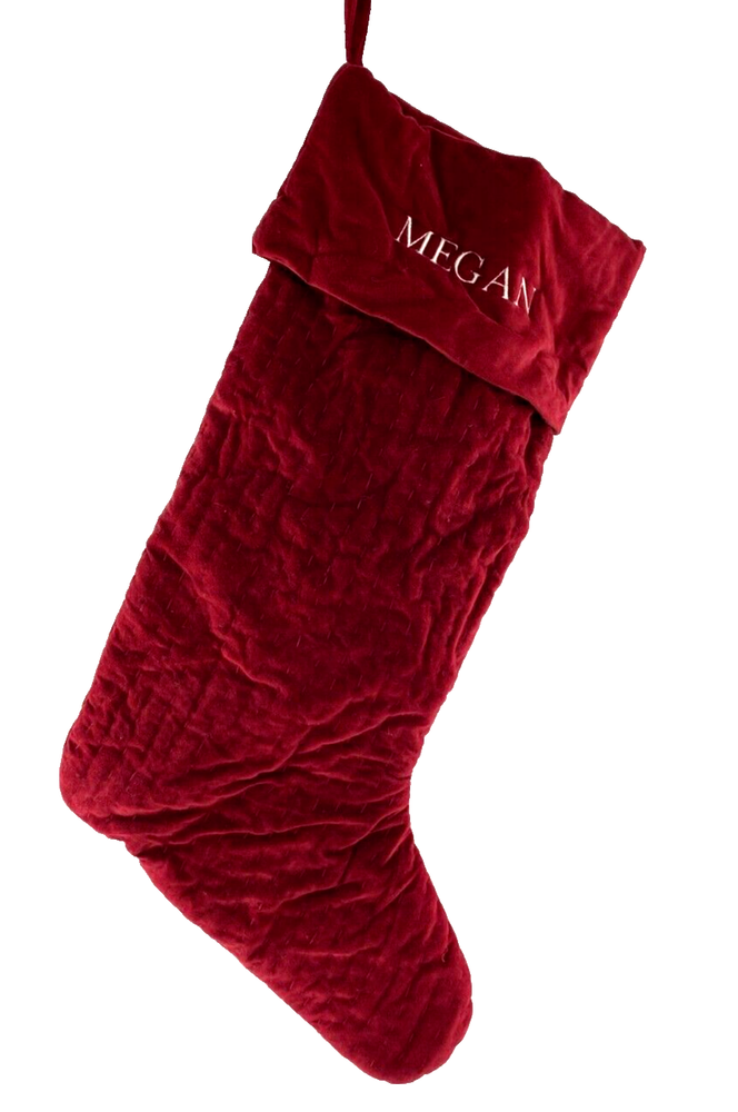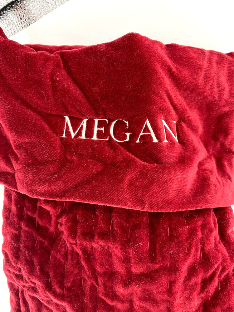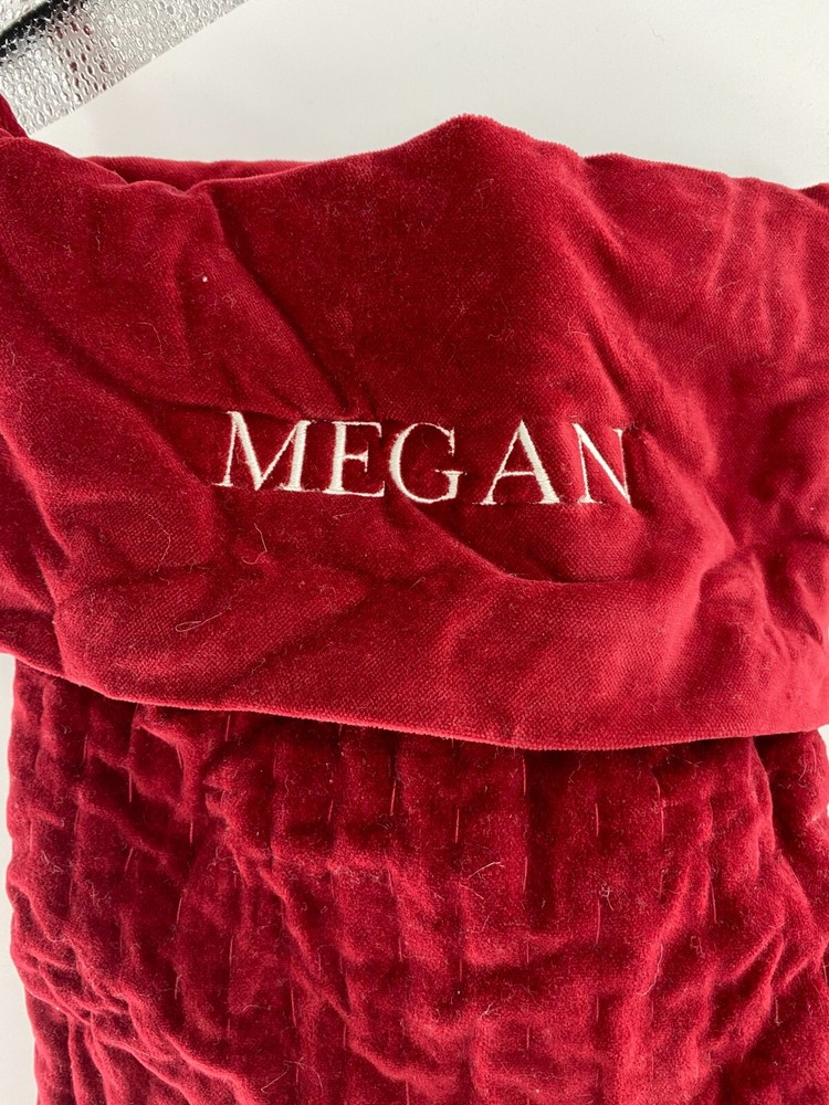 Please read the full description and View pictures before purchasing: Pottery Barn Christmas Stocking "MEGAN" Monogram Stitched Velvet Holiday 26"