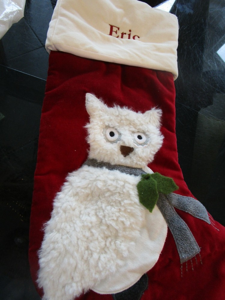 Up For Auction is- Pottery Barn Christmas owl velvet stocking monogrammed Eric photo shoot sample used only for a Pottery Barn photo photo shoot sample in excellent condition Smoke and pet free home.