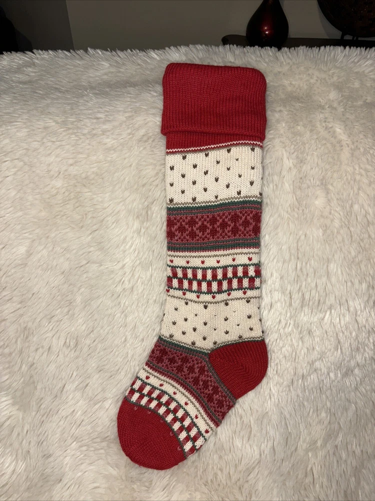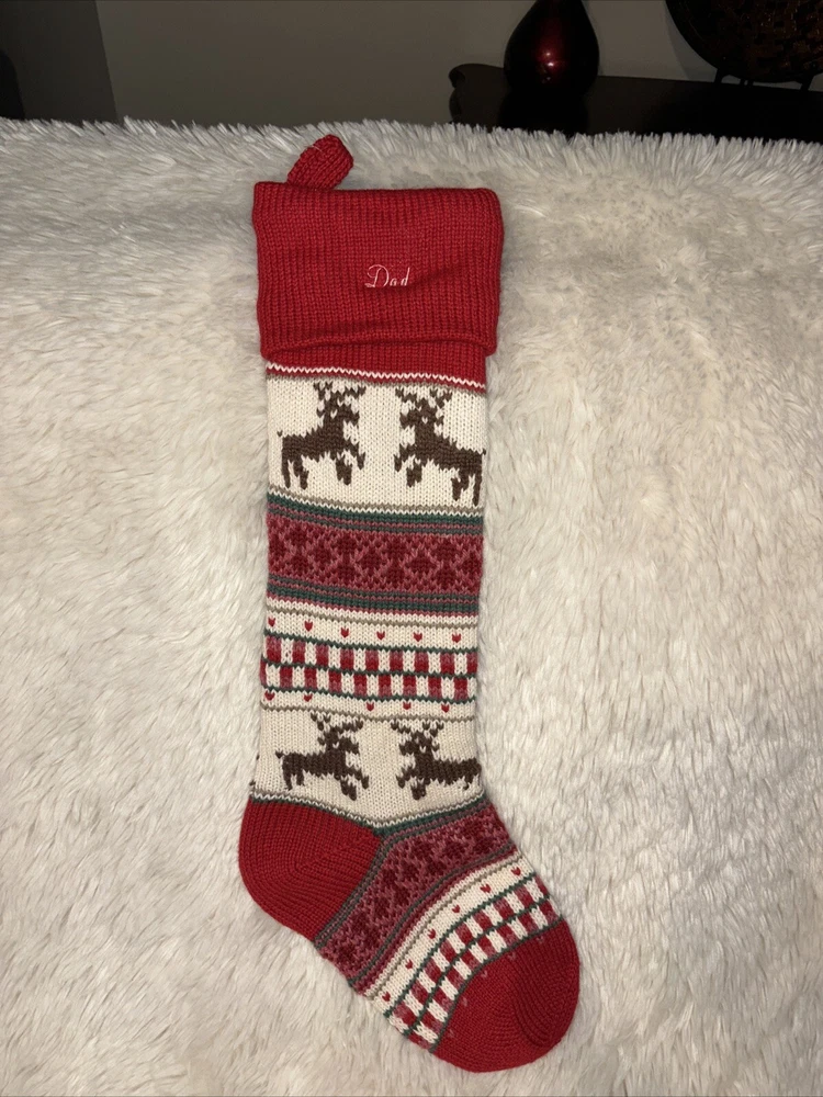 Pottery Barn Classic Fair Isle Christmas Stocking Collection Green Reindeer -Dad monogram Monogram can be easily removed if needed. No original tags nor packaging. No spots/ stains Smoke & pet free Overall: 11" wide x 27" long Cuff: 4.5" high Length from top of cuff to heel: 21" long Length from heel to toe: 11" long Hanging Loop: 3" long