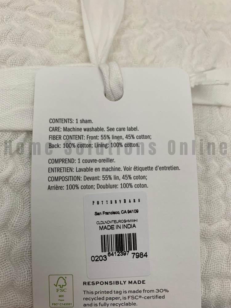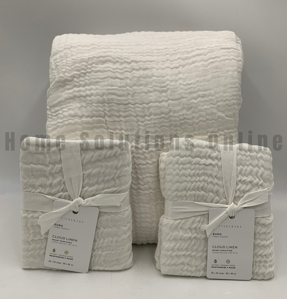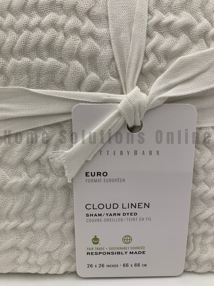 Pottery Barn Cloud Cotton Duvet Cover and Shams Items are brand new Auction includes: 1 full/queen duvet cover and 2 euro shams PRODUCT DETAILS CONSTRUCTION: Front is 75% cotton and 25% linen; reverses to 100% cotton. Reverses to solid. Duvet features a hidden button closure with inner ties to keep insert in place. Duvet cover and inserts are sold separately. Made in a Fair Trade Certified™ factory, empowering workers who made it. By choosing our cotton products, you’re supporting our investment in Better Cotton’s mission. This product is sourced via mass balance and therefore may not contain Better Cotton. OEKO-TEX® STANDARD 100: tested against 1000+ harmful substances. 14.HUS.42449 HOHENSTEIN. Imported. Care Machine wash in cold water; gentle cycle. Tumble dry on low heat; remove promptly.