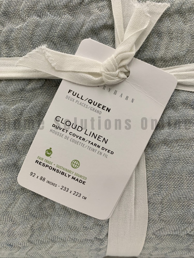 Pottery Barn Cloud Cotton Linen Duvet Cover Item is brand new Auction includes: 1 duvet cover PRODUCT DETAILS CONSTRUCTION: Front is 75% cotton and 25% linen; reverses to 100% cotton. Reverses to solid. Duvet features a hidden button closure with inner ties to keep insert in place. Duvet cover and inserts are sold separately. Made in a Fair Trade Certified™ factory, empowering workers who made it. By choosing our cotton products, you’re supporting our investment in Better Cotton’s mission. This product is sourced via mass balance and therefore may not contain Better Cotton. OEKO-TEX® STANDARD 100: tested against 1000+ harmful substances. 14.HUS.42449 HOHENSTEIN. Imported. CARE: Machine wash in cold water; gentle cycle. Tumble dry on low heat; remove promptly. DIMENSIONS: Full/Queen: 88" w x 92" l