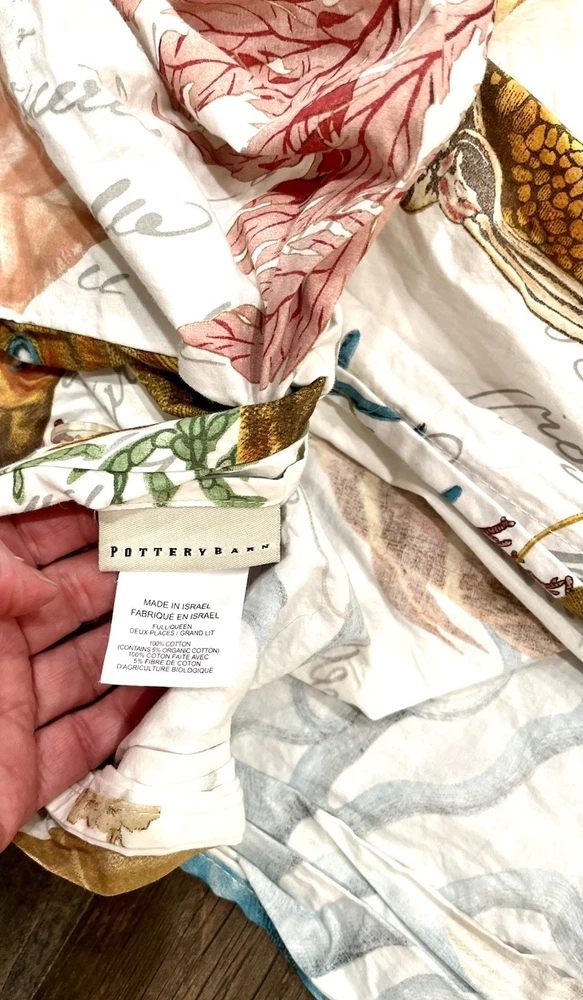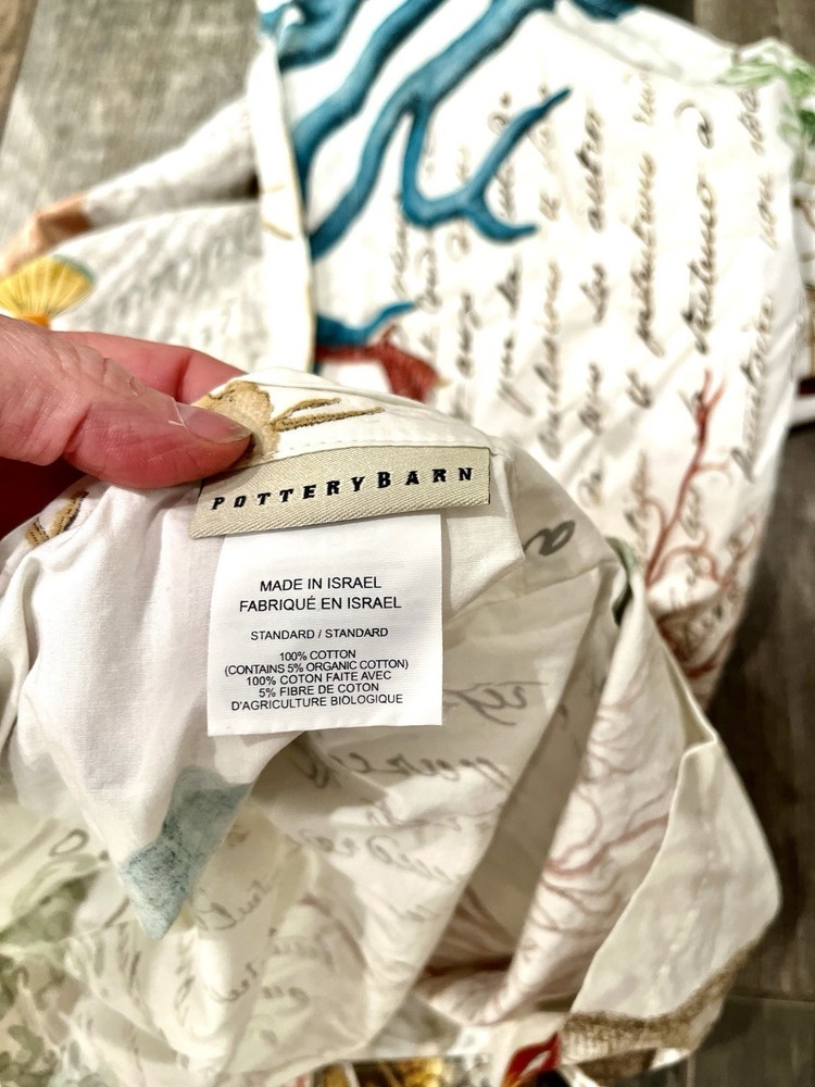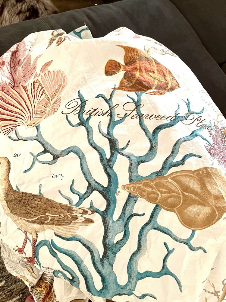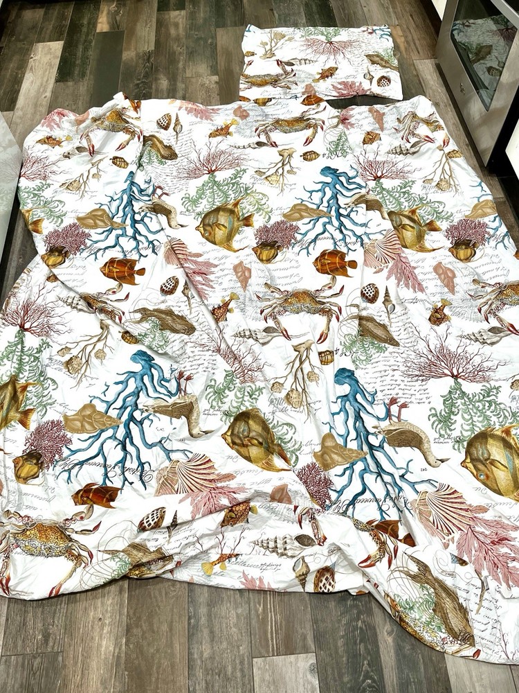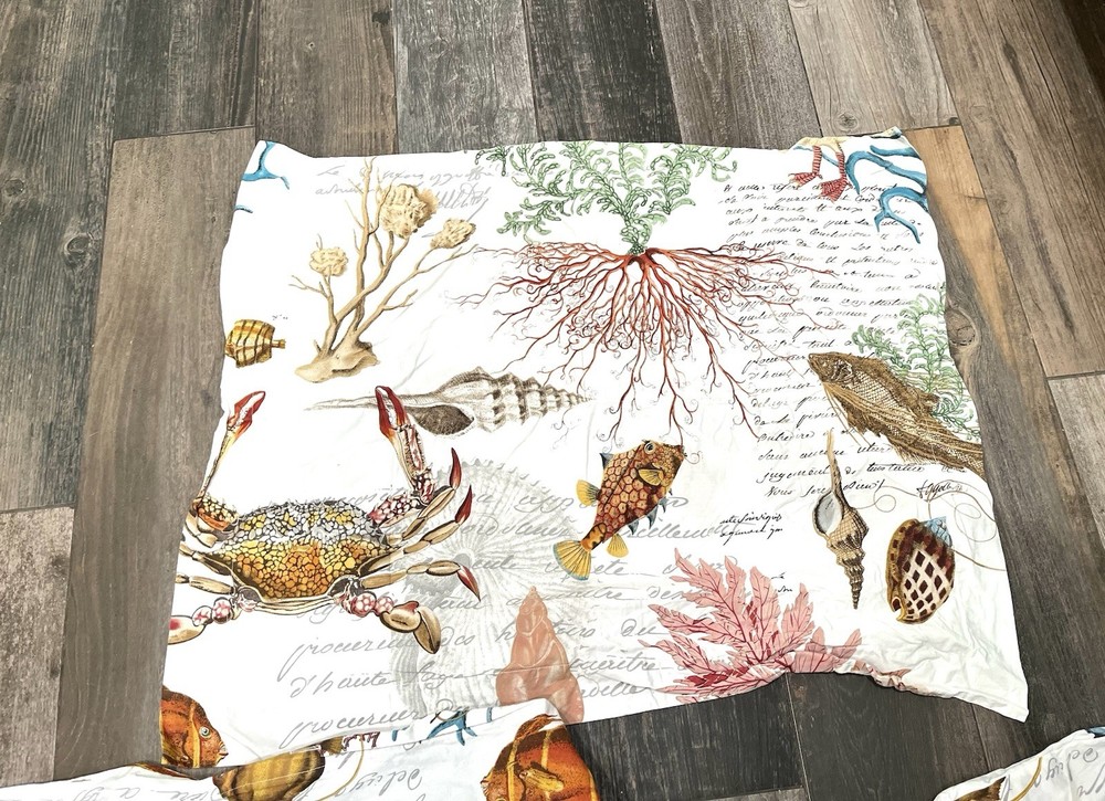 Pottery Barn Coastal Sealife Queen Duvet w/ 1 Std Sham RARE! Hard To find This listing is for a 2 piece set from Pottery Barn queen duvet 1 sham This is the Coastal Sealife design. This is a pattern that is no longer offered by Pottery Barn, and is extremely difficult to find. Get it now, while you still can! If you have ever owned a Pottery Barn quilt, you already know how good the quality is! Queen duvet size: 92"x88" Standard sham size: 20"x26" No flaws to mention. Excellent.