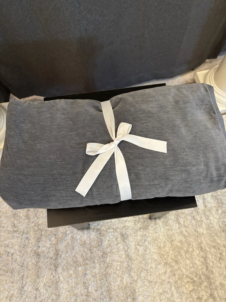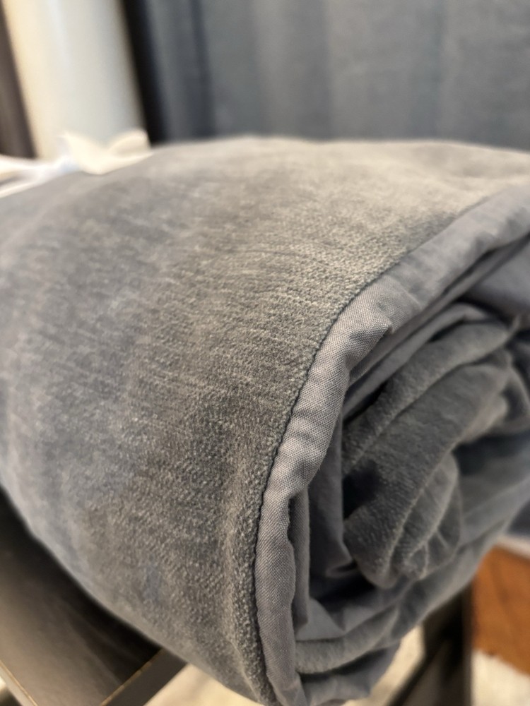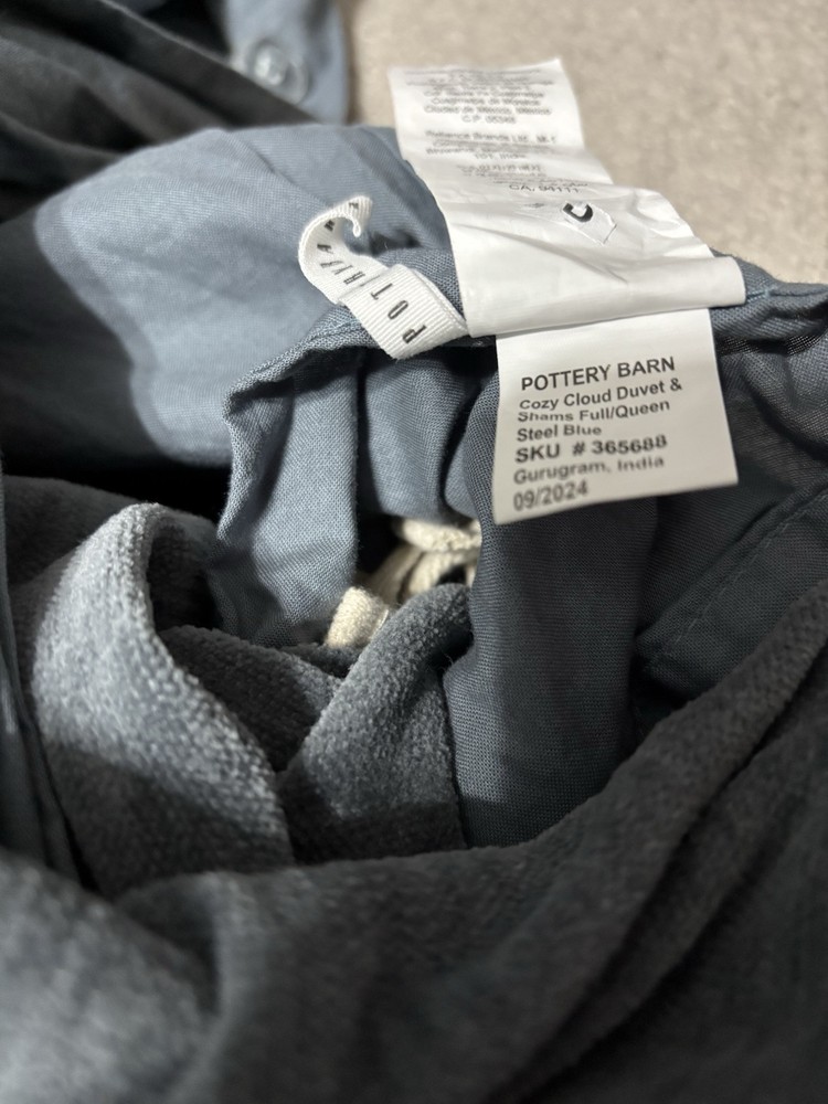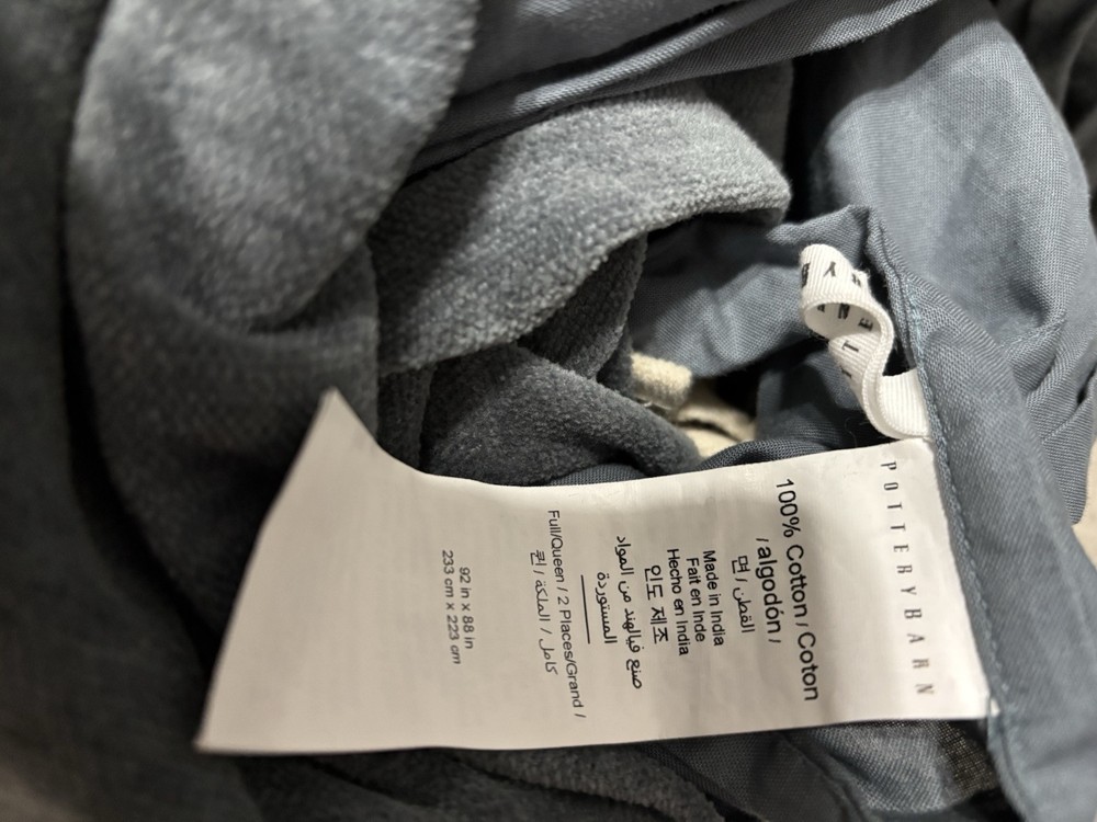 Pottery Barn Cozy Cloud Duvet, Queen, Steel Blue Color Color: Steel Blue Size: Full/Queen Duvet: 88" l x 92" w Item is pre-owned but in good condition except for a small thread imperfection on front side and several tiny holes on inside of quilt as seen in photos. Material: Made from 100% Cotton Yarn Dyed Chenille; reverses to 100% cotton sheeting.