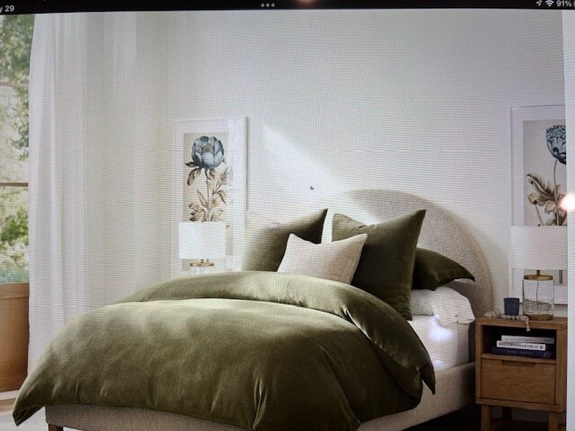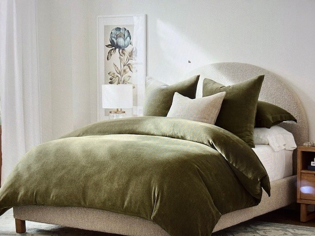 Ordered the entire Loden and Terracotta line including: 1) Washed velvet handcrafted stitched quilt California King, Loden 2) Washed velvet handcrafted stitched King shams, Loden 3) Willow embroidered pillow covers 16 x 26 4) California King Cozy Cloud Duvet, Loden 5) Boucle Pillow Covers 20", Adobe 6) Textured basketweave throw, Terracotta 7) Belgian Flax linen sheet set, Loden 8) Boucle pillow covers, Loden. Husband did not like the Cozy Cloud Duvet as much as the washed velvet hand stitched quilt. It has never been used, purchased March 5 from store in Colorado as no one else in Texas had one in stock. I was going to use it for winter bedding, but we already have that season covered from Peacock Alley and Christmas bedding too. Regularly priced at 249.00.