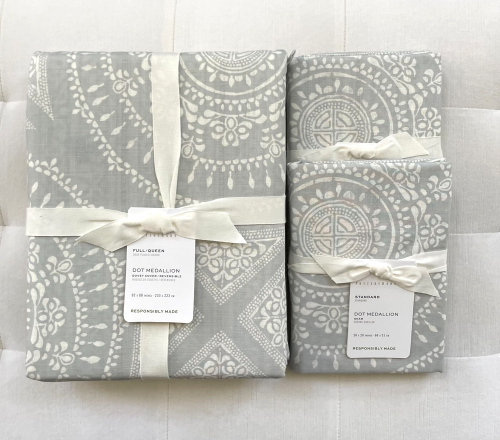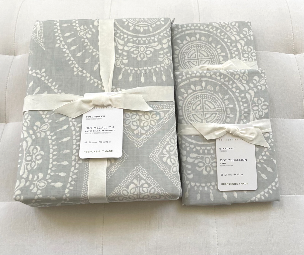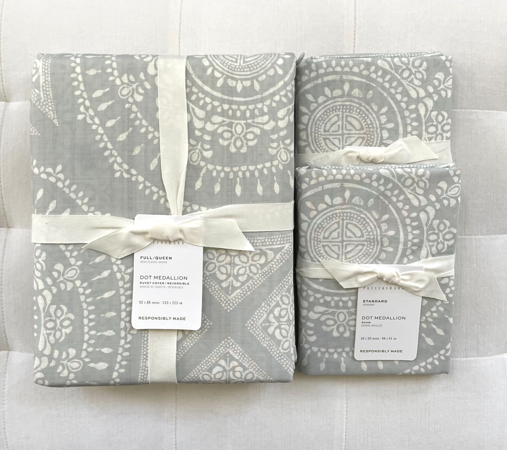 Pottery Barn Dot Medallion Reversible Duvet Cover Full/Queen & 2 Standard Shams ~Sea Glass New with Tag PB describes as: Front is 100% cotton; reverses to coordinating pattern. Duvet features a hidden button closure with inner ties to keep insert in place. Inserts are sold separately. By choosing our cotton products, you’re supporting our investment in Better Cotton’s mission. This product is sourced via mass balance and therefore may not contain Better Cotton. Imported. Machine wash in warm water; gentle cycle. Only use non-chlorine bleach, if needed. Tumble dry on low heat; remove promptly. Warm iron as needed. Full/Queen Duvet: 88" l x 92" w Standard Sham: 20" w x 26" l Pet & Smoke free Ships within 1 business day. Thank you