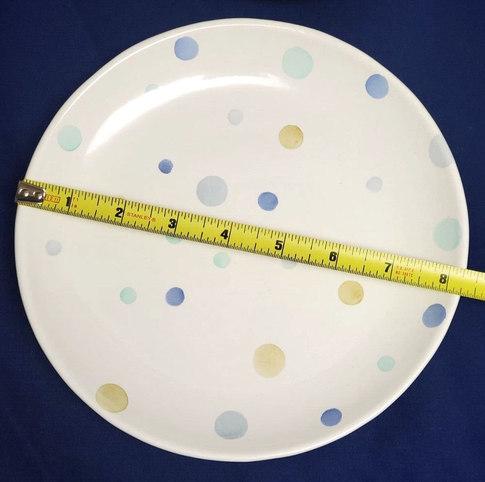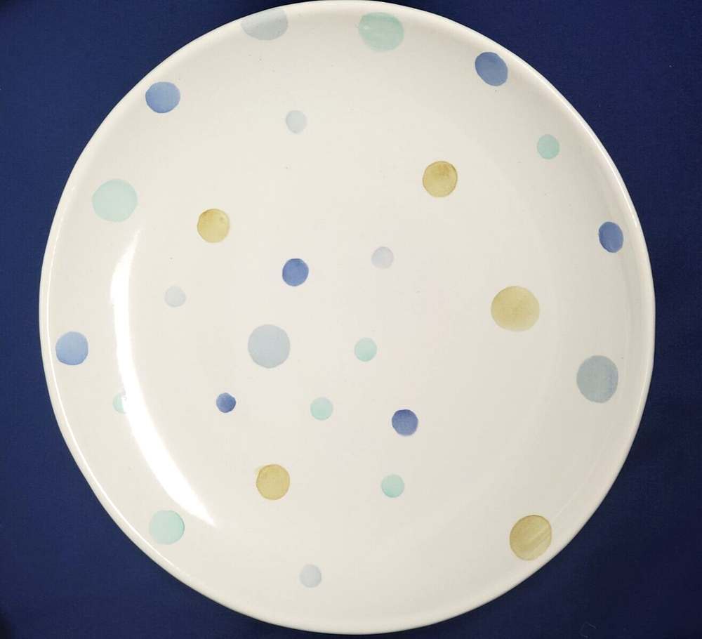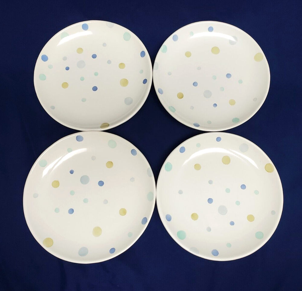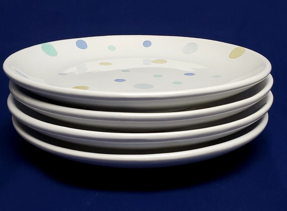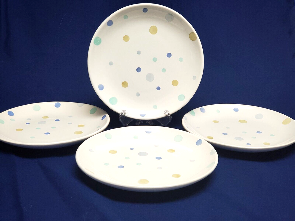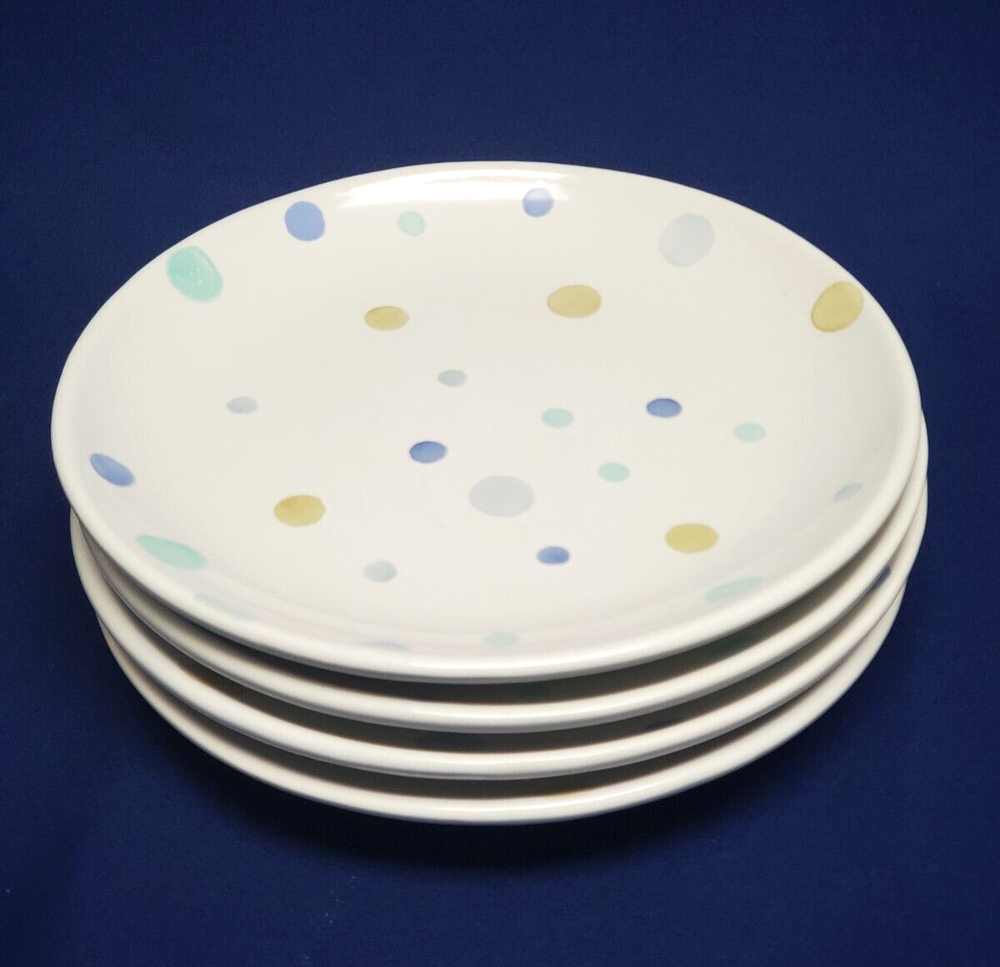 Add a touch of whimsy to your table setting with this set of four Polka Dot dessert plates from Pottery Barn. Each plate has a diameter of 8.25 inches and features pastel-colored dots that are perfect for all occasions. Made of high-quality ceramic, these plates are both microwave and dishwasher safe, making them convenient for everyday use. These plates are a great addition to your dinnerware collection and are sure to impress your guests. Bring some fun to your table with these Polka Dot dessert plates from Pottery Barn. Carefully packed and shipped.