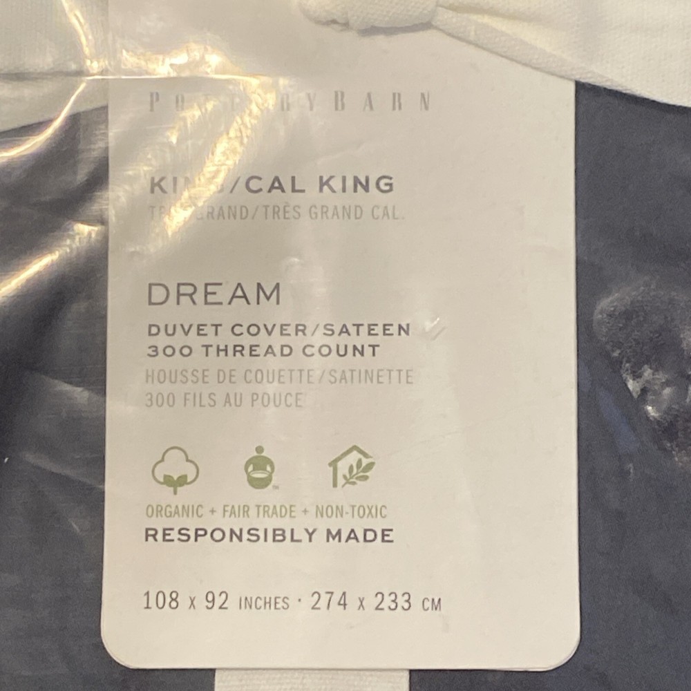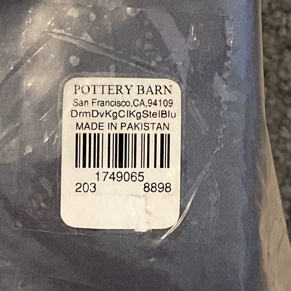Add a touch of elegance to your bedroom with this Pottery Barn DREAM duvet cover in a beautiful steel blue color. Made from 100% cotton sateen, this duvet cover is not only soft and comfortable, but also organic. It is perfect for a king size bed and comes with a solid color pattern and a rectangular shape. This duvet cover is labeled STANDARD 100 by OEKO-TEX, ensuring that it is free from harmful chemicals. It is easy to care for, simply machine wash as needed. The package includes only the duvet cover, making it a great addition to any bedroom. New with tags in original packaging