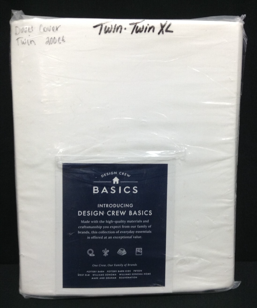 Pottery Barn Design Crew Basics 200 Thread Count Organic Cotton Duvet Cover nEW Size: tWIN / TWIN xl DETAILS Material: Made of 100% organic cotton percale; a percale weave is noticeably denser and wears well over time. Thread Count: 200-thread count. Reversible Design: Duvet cover reverses to the same as front. Twin-sized duvet cover fits both standard twin and twin XL dorm mattresses. Imported. CARE INSTRUCTIONS Machine wash. DIMENSIONS Twin/ Twin XL: 68" wide x 86" long CARE AND MAINTENANCE Wash bedding before first use. Machine wash in warm water; gentle cycle. Use only non-chlorine bleach, if needed. Tumble dry on low heat. Warm iron as needed.