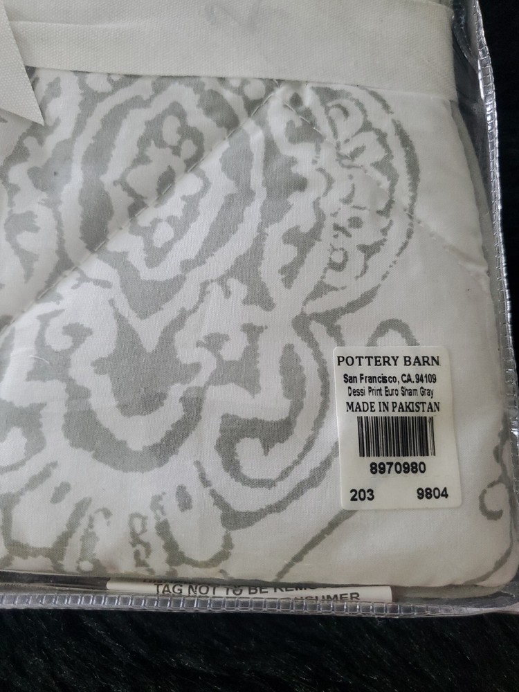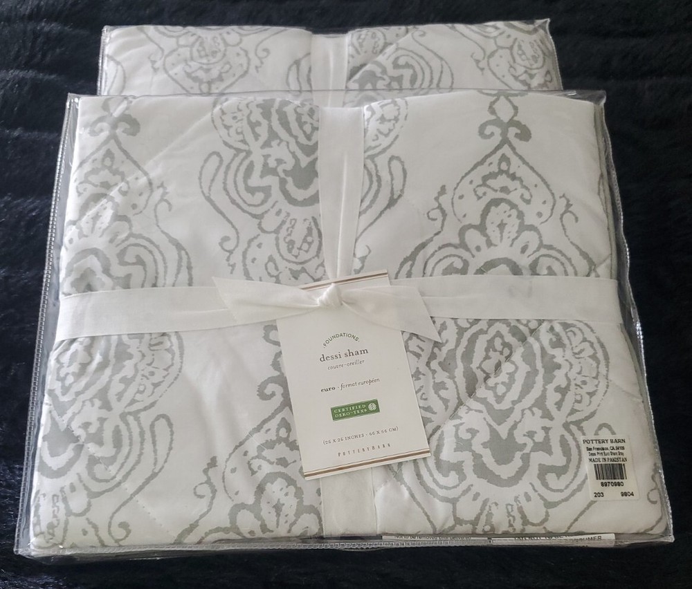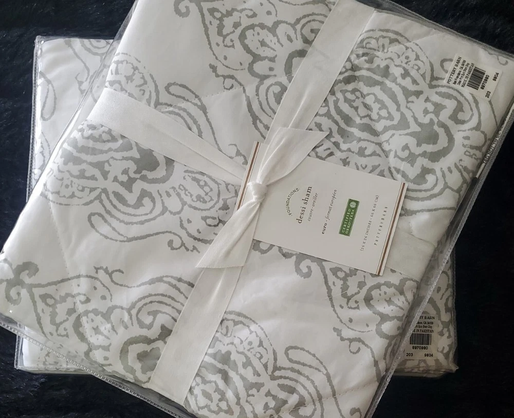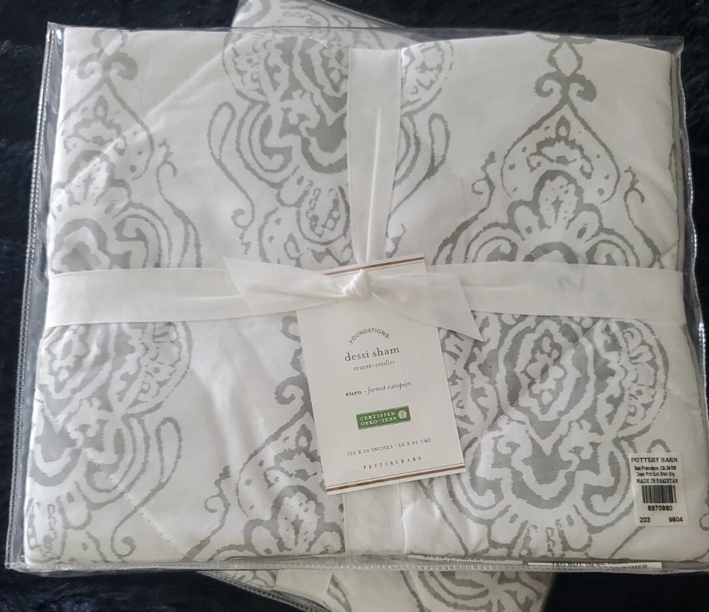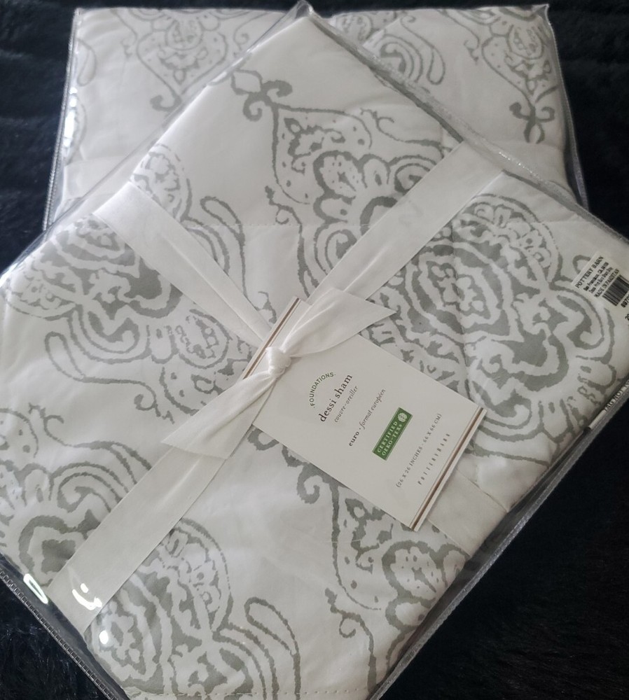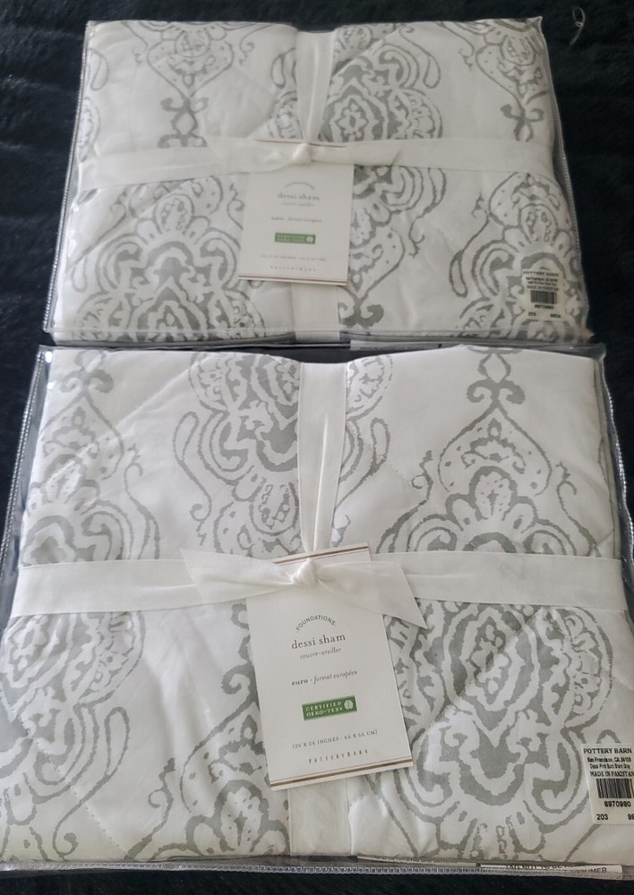 Enhance the style of your bedroom with this beautiful Pottery Barn Dessi Percale Euro Sham Gray Set of 2. The square-shaped sham has a tie closure type and features a quilted pattern that adds a touch of elegance to your bedding. Made of high-quality percale material, this Euro sham is easy to maintain and machine washable with tumble dry instructions. The gray color of the Pottery Barn Dessi Percale Euro Sham complements any bedroom decor and is suitable for a Euro-sized pillow. This set of 2 shams is part of the Pottery Barn product line and is brand new with tags. Create a cozy and inviting atmosphere in your bedroom with this fashionable and durable sham.