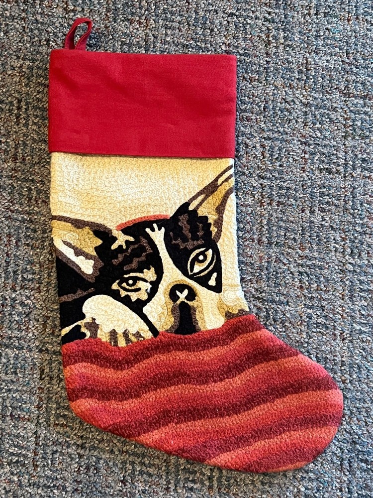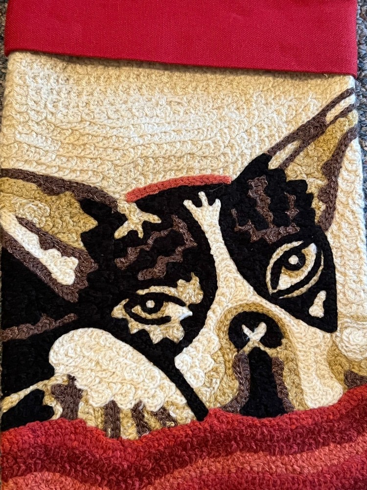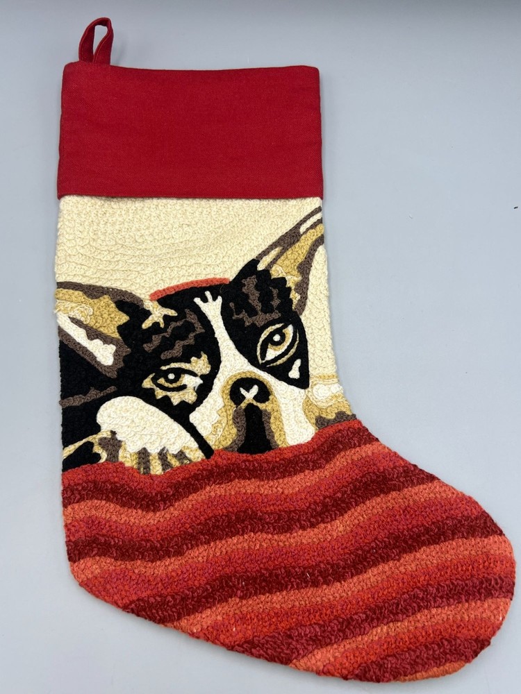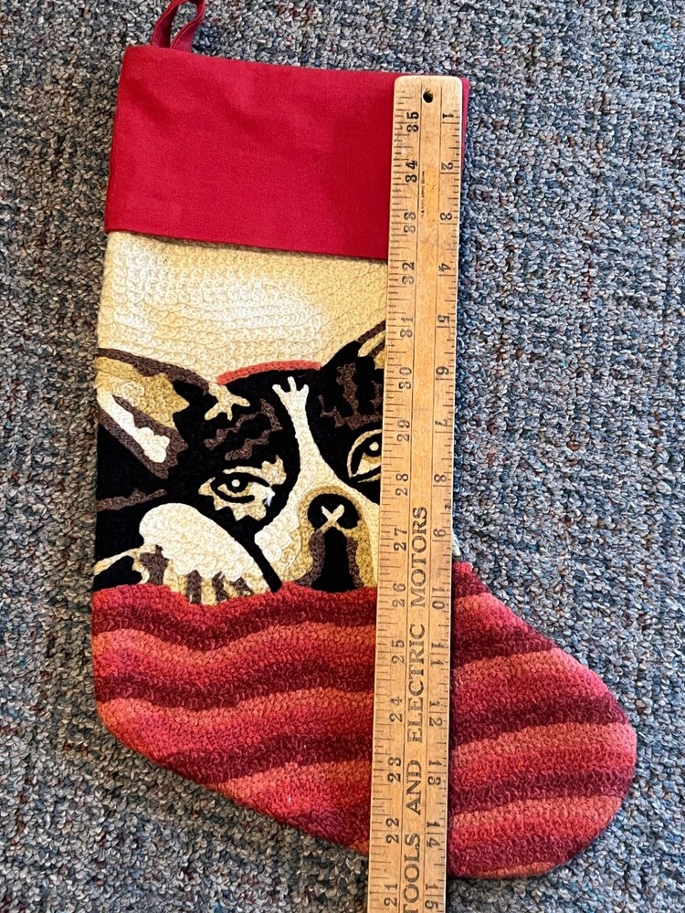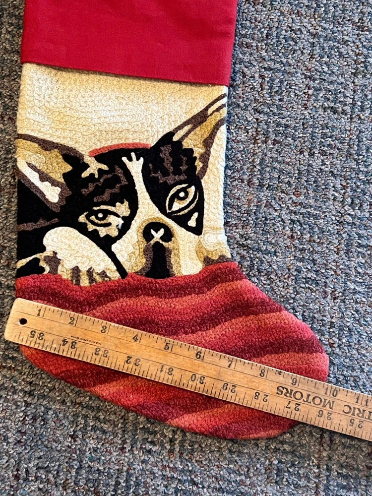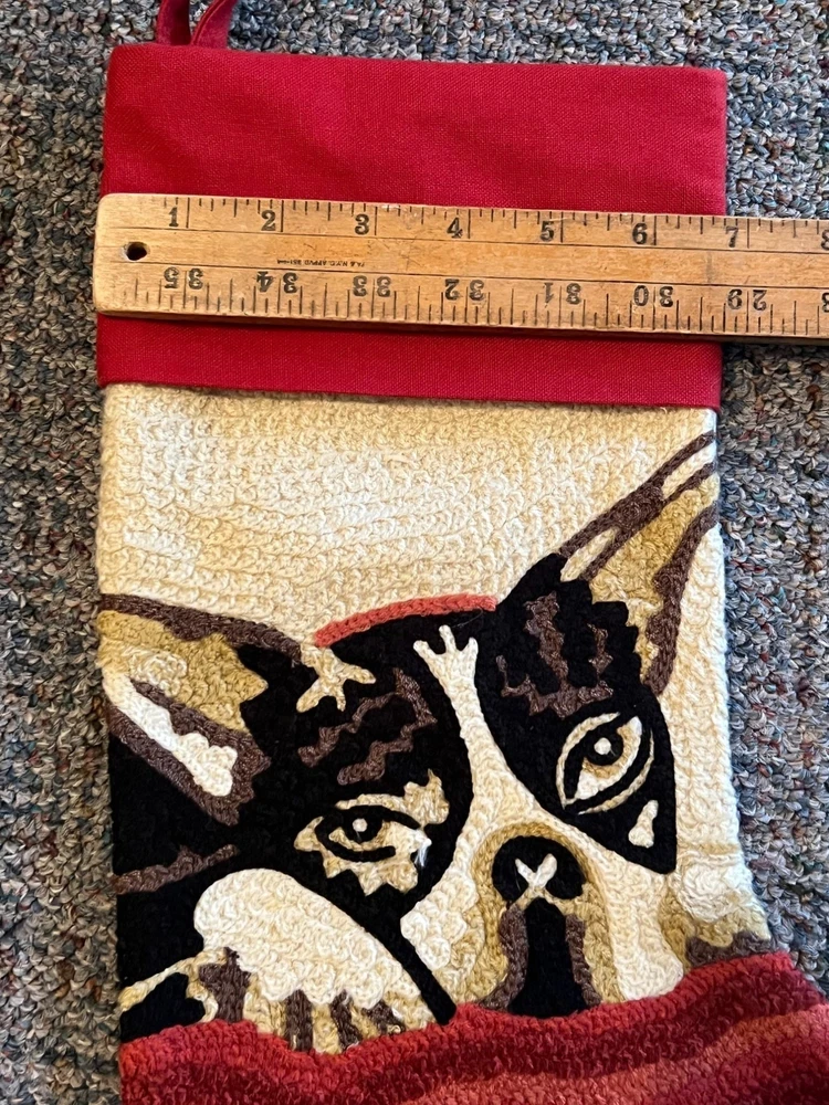 This stocking is like a Boston Terrier Bulldog peeking from under a blanket, ready to fetch all those holiday treats. It's 19 inches long, perfect to fit loads of goodies. The red and cream colors add a festive touch that says, "I'm not just a dog, I'm your holiday spirit animal." • Crewel / Tapestry Design • 15 Inches Long • Red & Cream Color Scheme • Hanging Loop • Soft Textile Feel Length = 15 inches, Width = 10 inches in foot