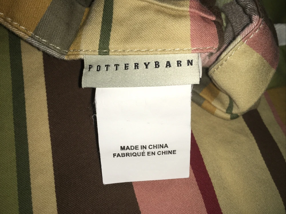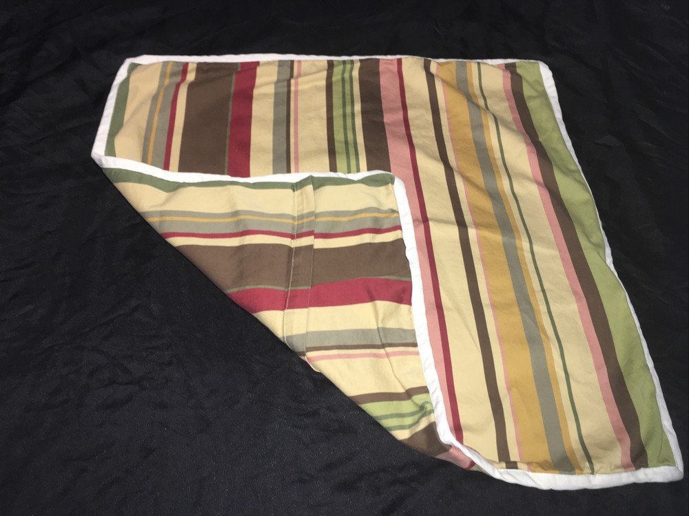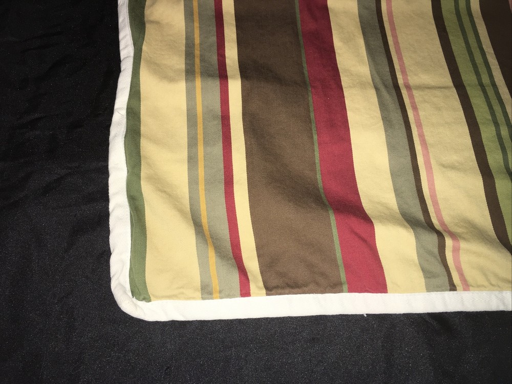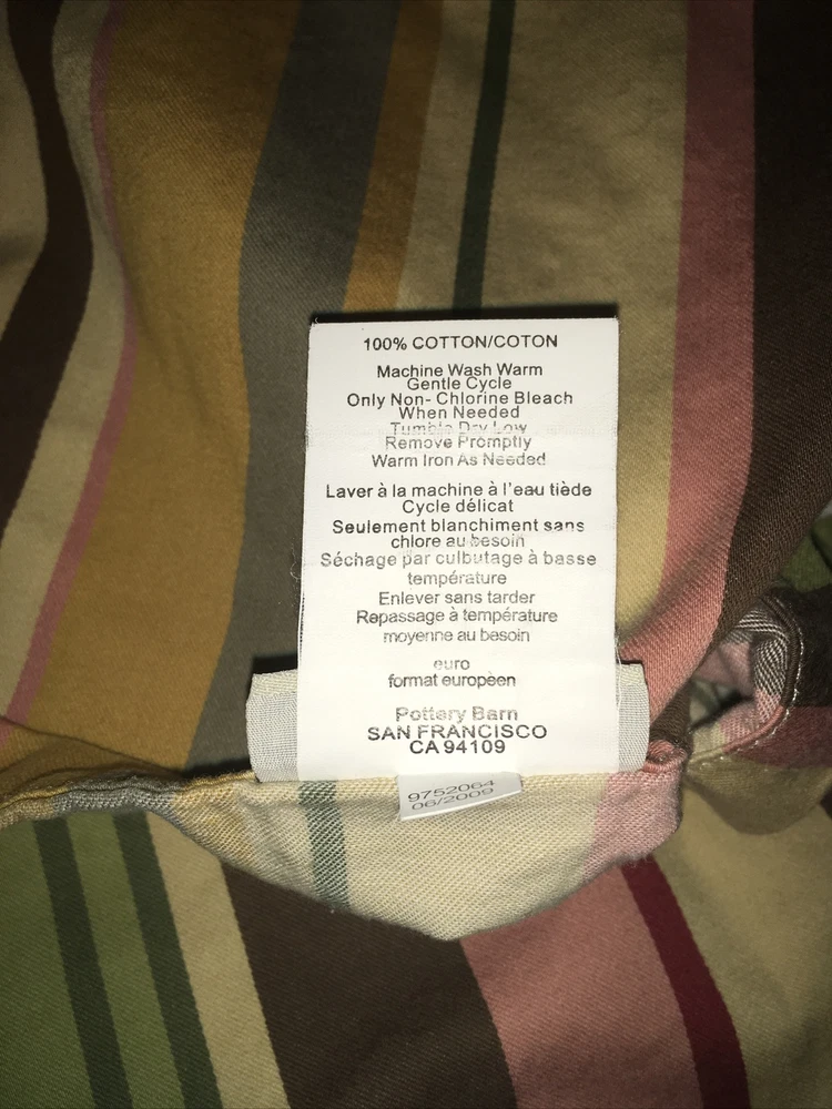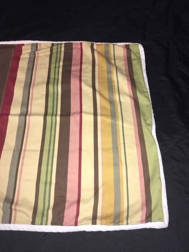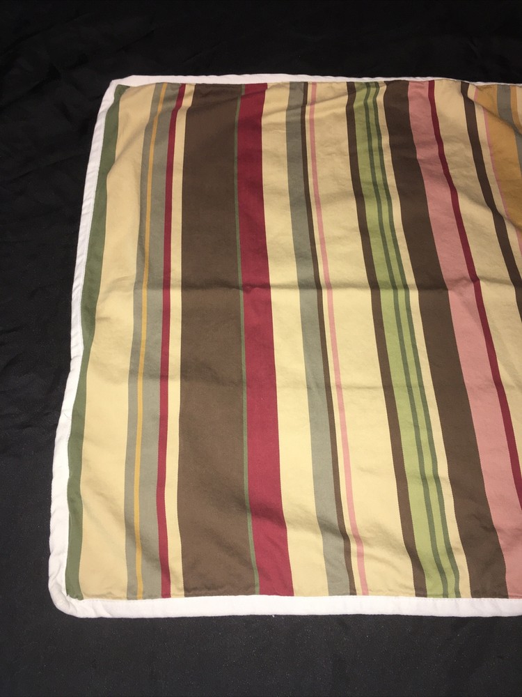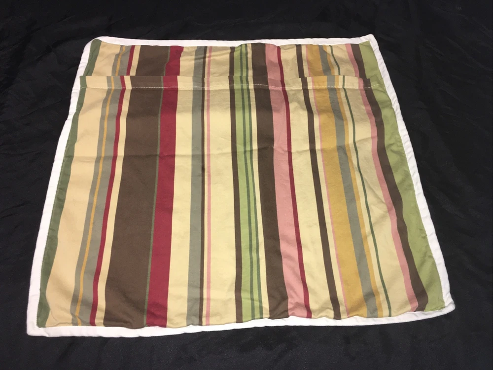 This Pottery Barn Euro Sham features a striped pattern in brown, yellow, red, green, and white colors. Made from 100% cotton with a Southwestern style, it measures 26 inches in length and width. The sham is part of the Duncan Stripe collection, with a thread count between 201-400. It is machine washable and easy to care for, with an envelope closure design. Perfect for teens and adults, it adds a touch of Southwest charm to any bedroom.