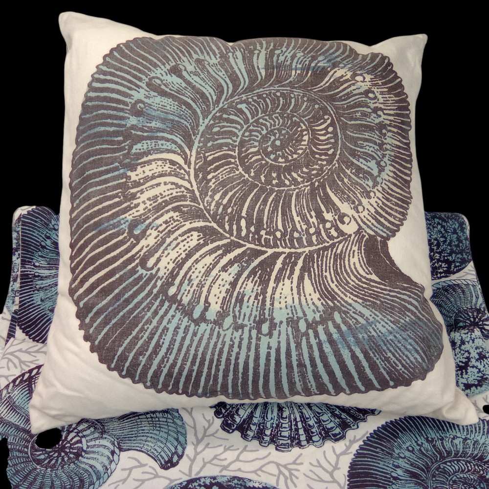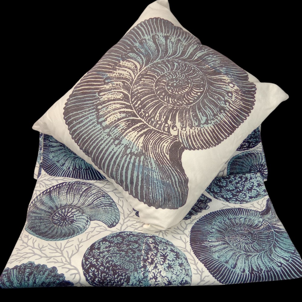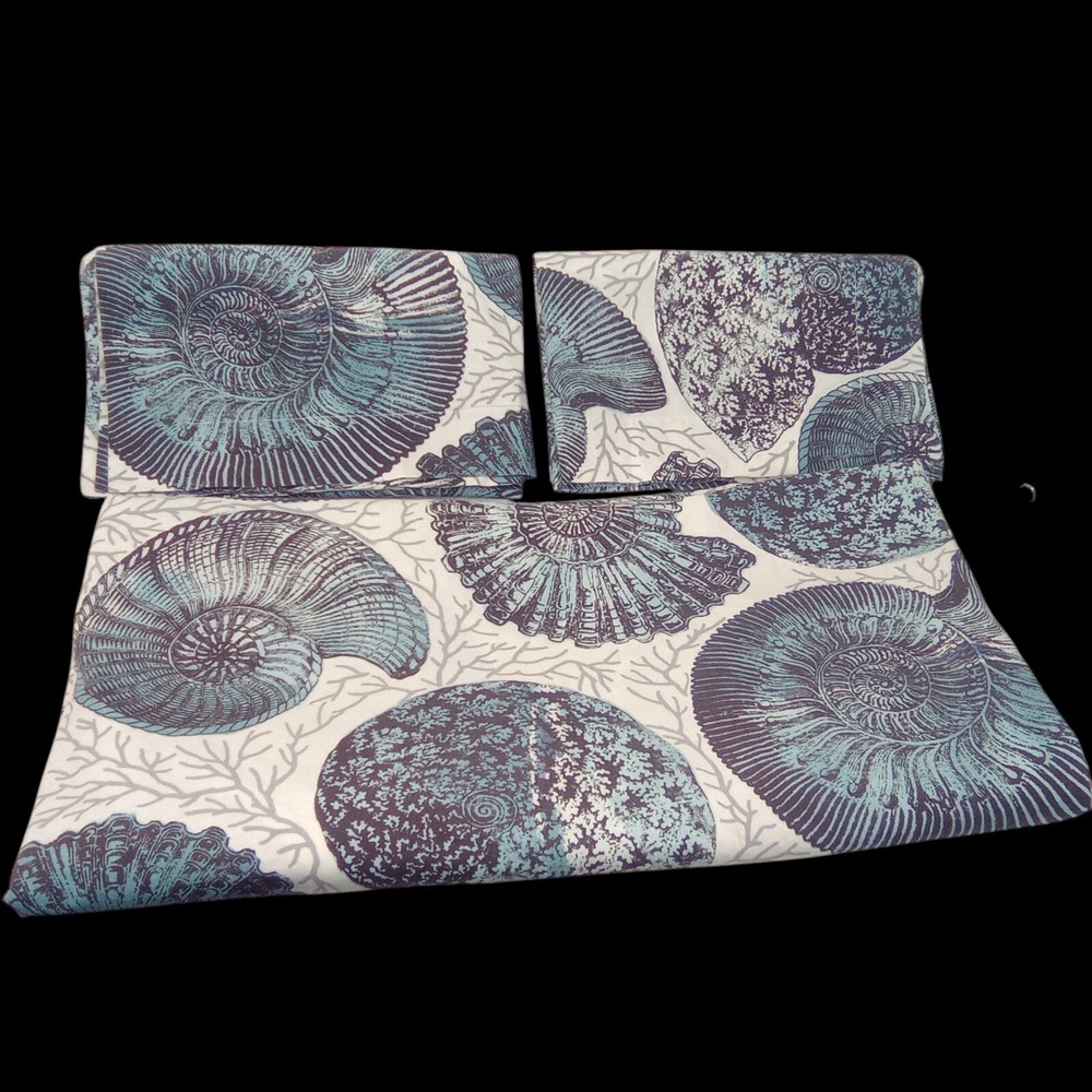 Pottery Barn Bedding Set- Queen Duvet Cover, 2 Shams and a 20''Accent Pillow in the discontinued Coral Shell Pattern This bedding set is typical of Pottery Barn high quality and aesthetically pleasing style and is made up of 100% cotton (5% percent organic cotton). Duvet has a button closure Shams measures 29'' by 23 1/2" Pillow Measures 20'' by 20''- has a zipper closure Please let me know if you have any questions or would like more pictures.
