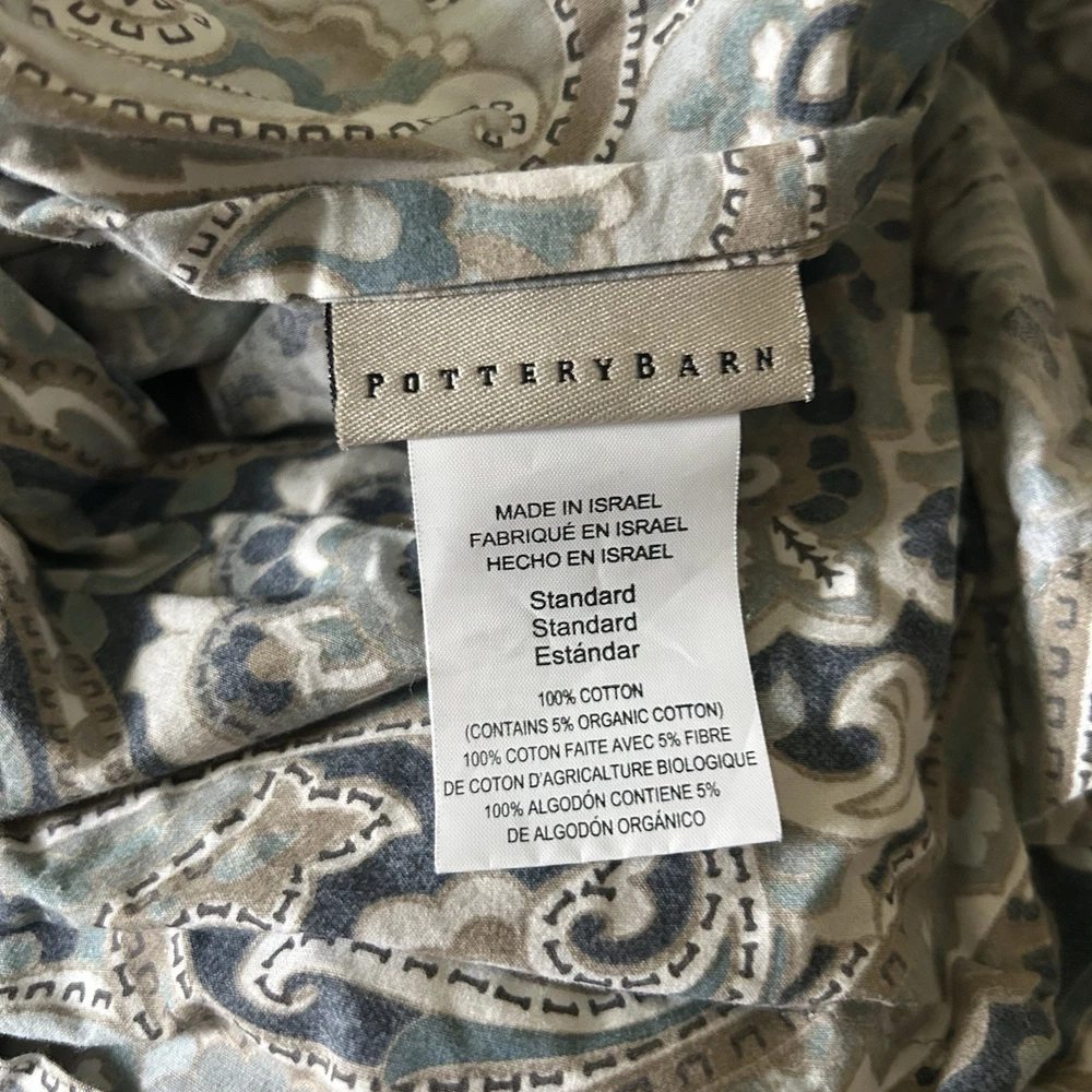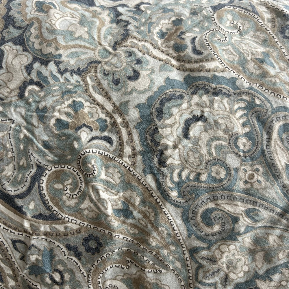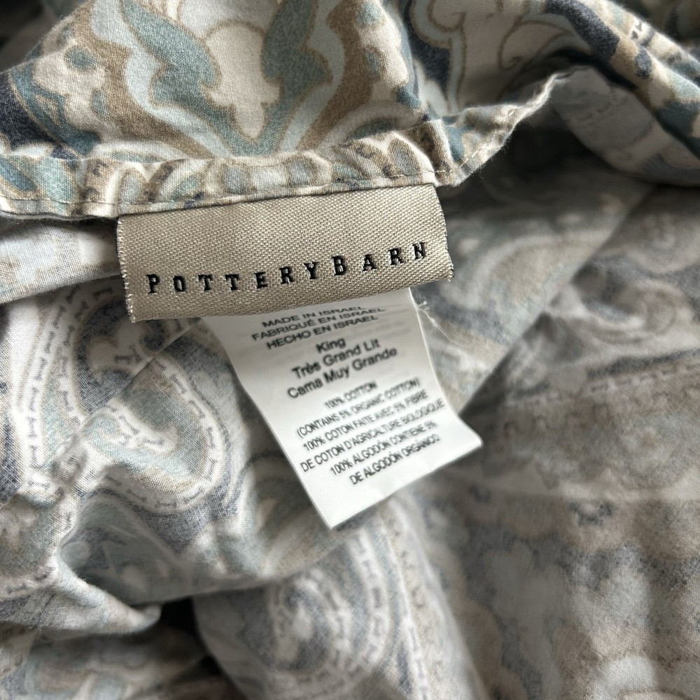 Clean and smoke free. This duvet comes with one sham The Pottery Barn Caesarea King Duvet Cover in Beige Rust Blue Jacobean Paisley with standard Sham is a luxurious and stylish bedding set perfect for adults' bedroom. Made from 100% organic cotton with a thread count of 401-600, this rectangular duvet cover features a beautiful paisley pattern in multicolor, adding a touch of nature and luxury to your room. Machine washable and not quilted, this boho style duvet cover from Pottery Barn is sure to add a touch of elegance to your bedroom decor.