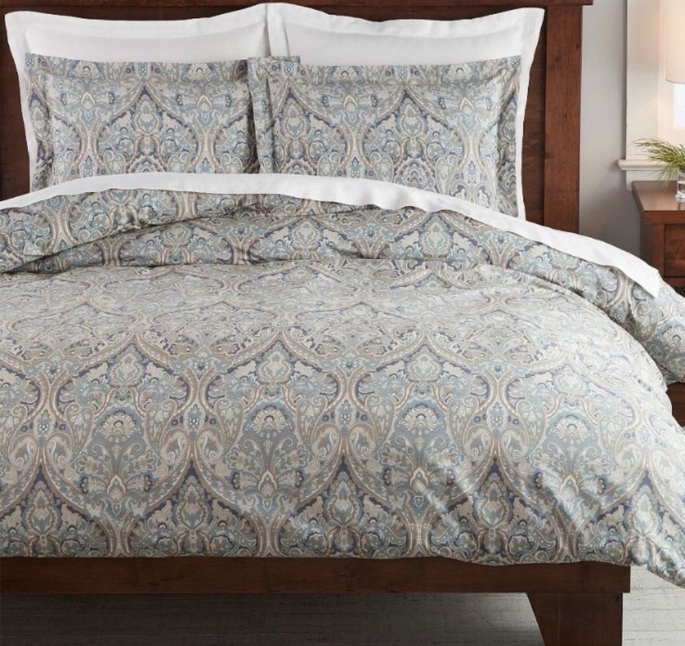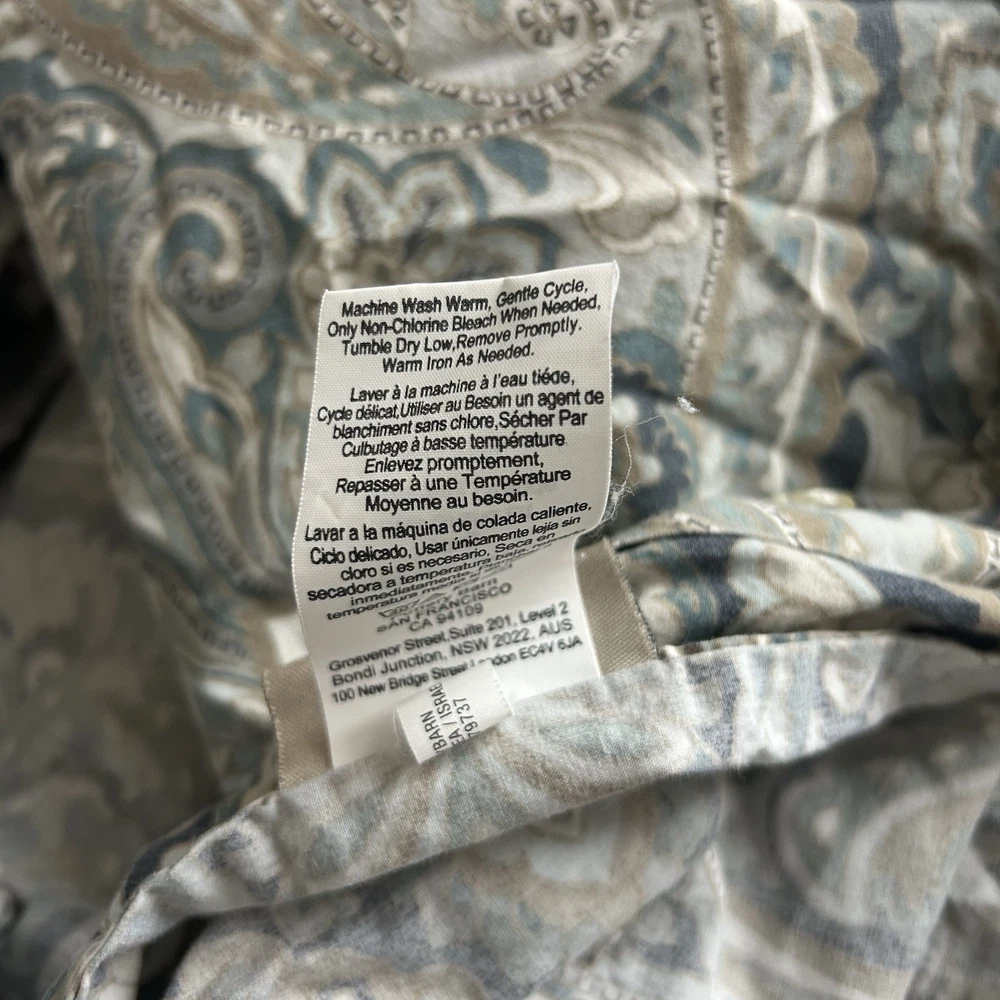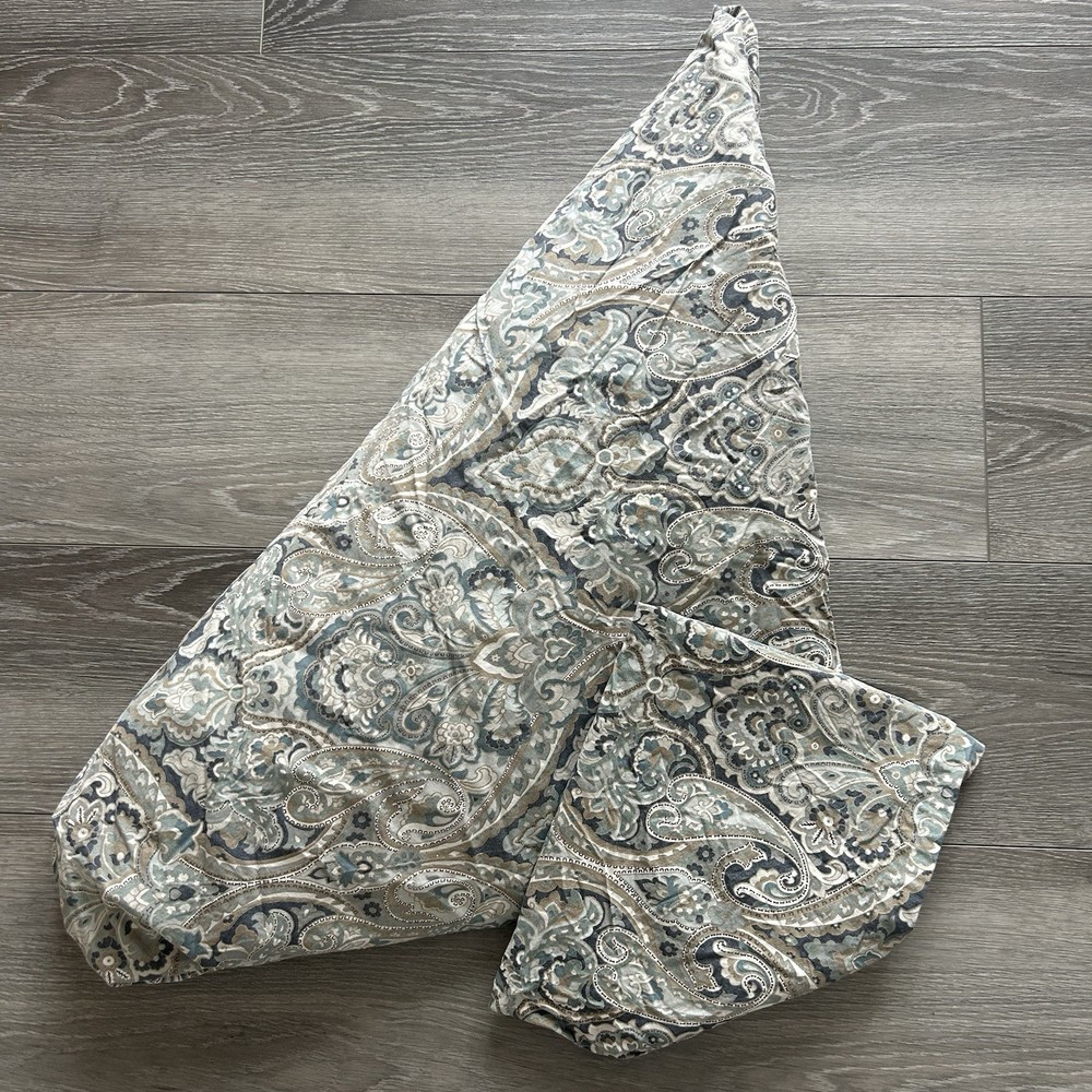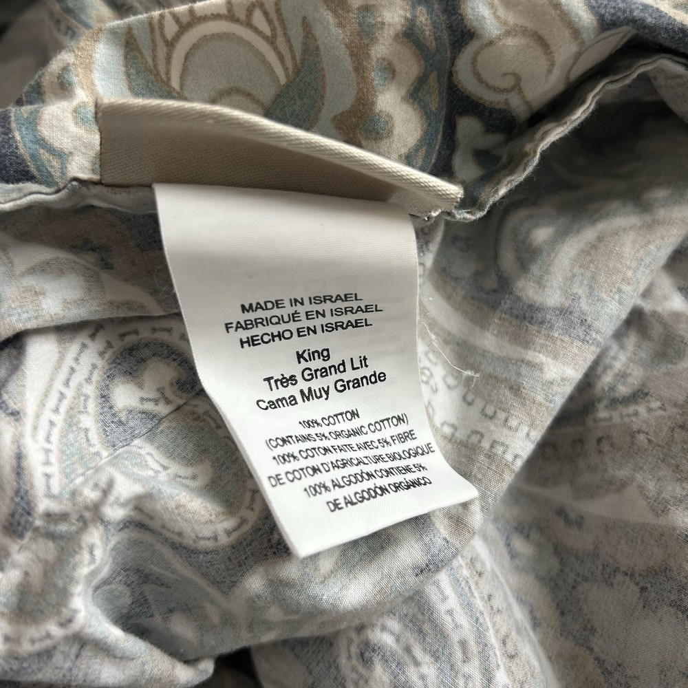 Clean and smoke free. This duvet comes with one sham The Pottery Barn Caesarea King Duvet Cover in Beige Rust Blue Jacobean Paisley with standard Sham is a luxurious and stylish bedding set perfect for adults' bedroom. Made from 100% organic cotton with a thread count of 401-600, this rectangular duvet cover features a beautiful paisley pattern in multicolor, adding a touch of nature and luxury to your room. Machine washable and not quilted, this boho style duvet cover from Pottery Barn is sure to add a touch of elegance to your bedroom decor.