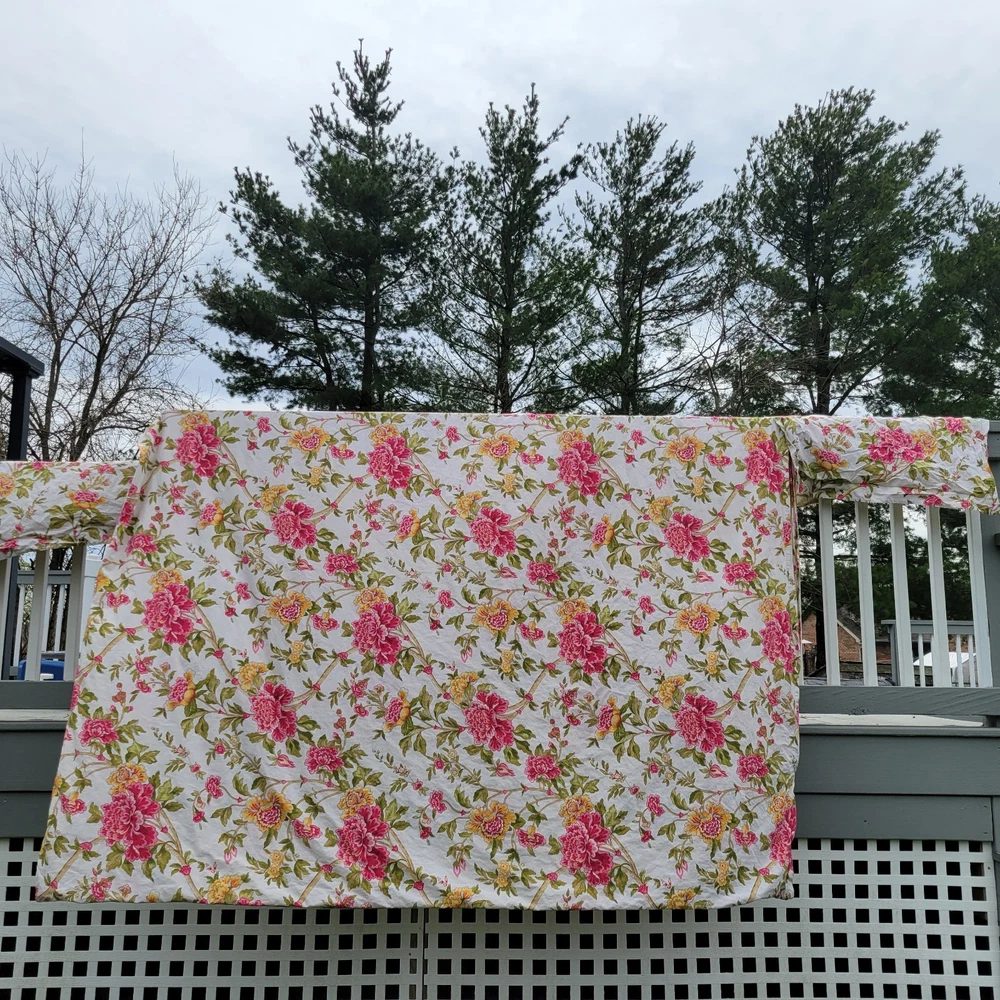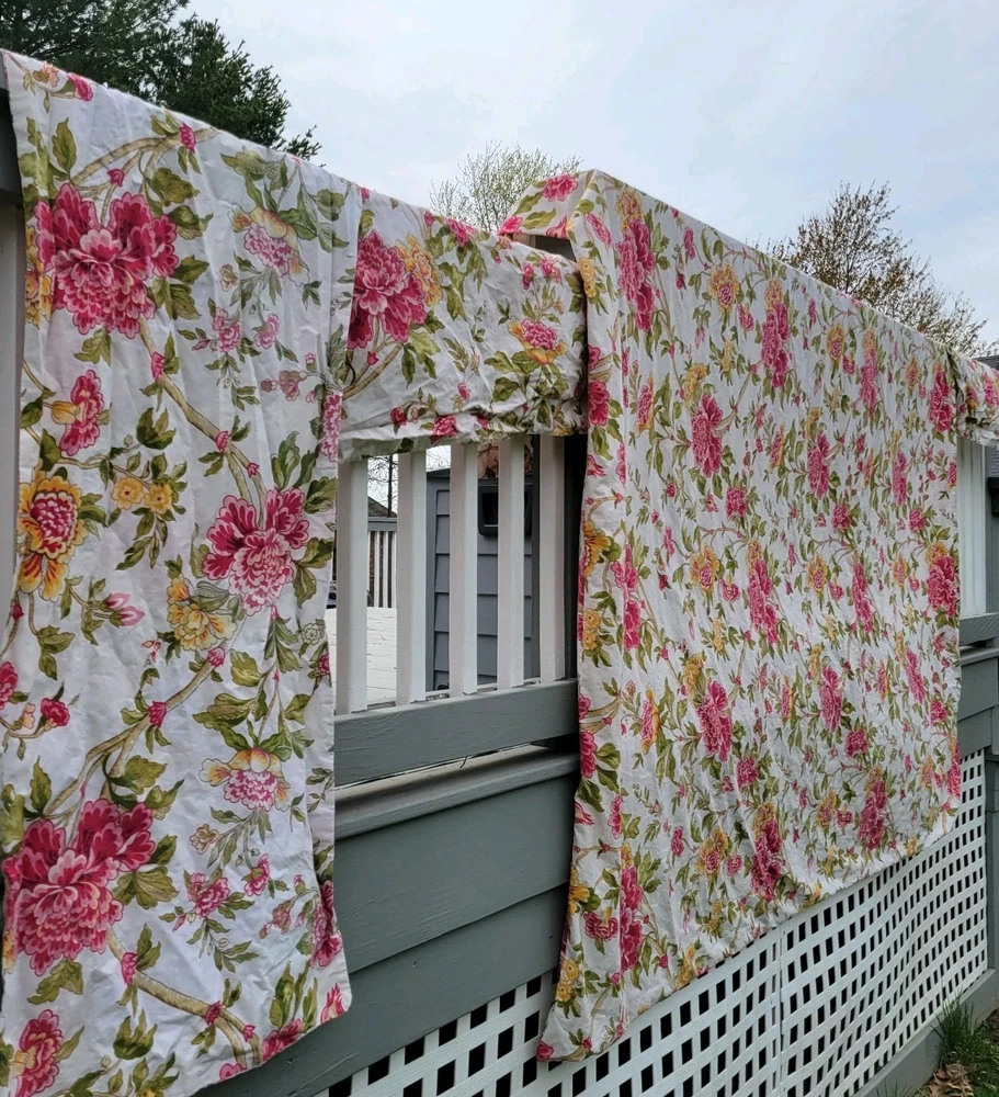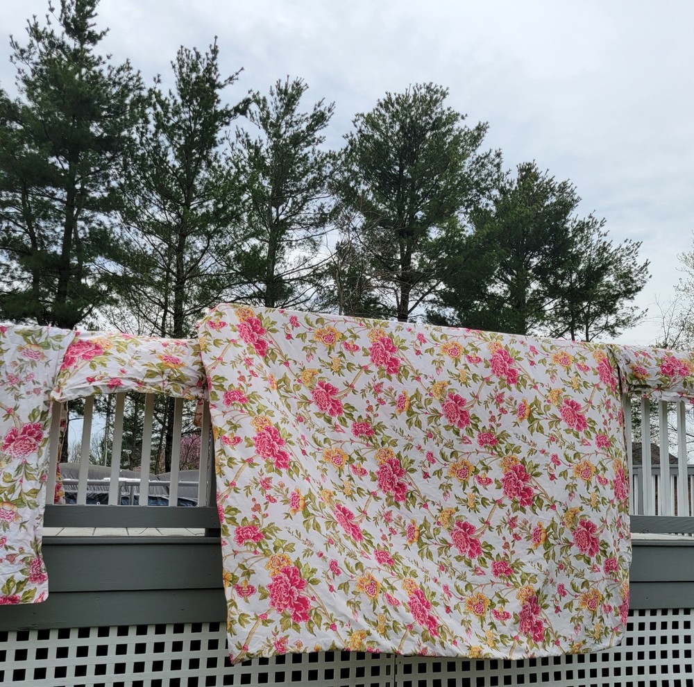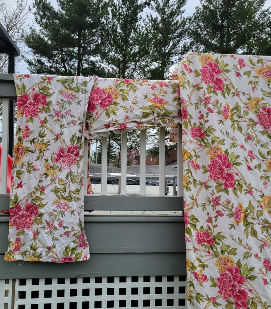 Gorgeous and well made, 1 duvet cover, 2 Euro shams, 1 unknown rectangular item (possibly a Valance). Prairie, cottage core, granny, french country cottage, peonies, shabby chic, pink green floral Freshly Laundered and ready for use!