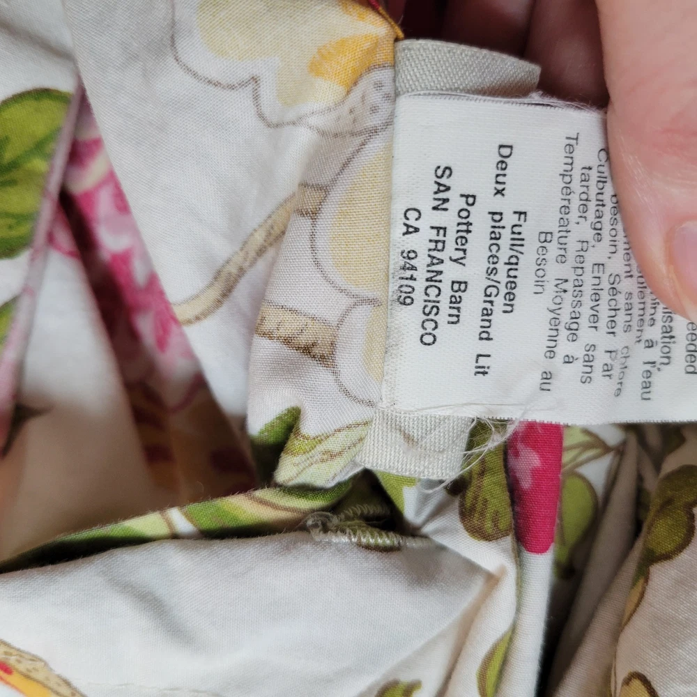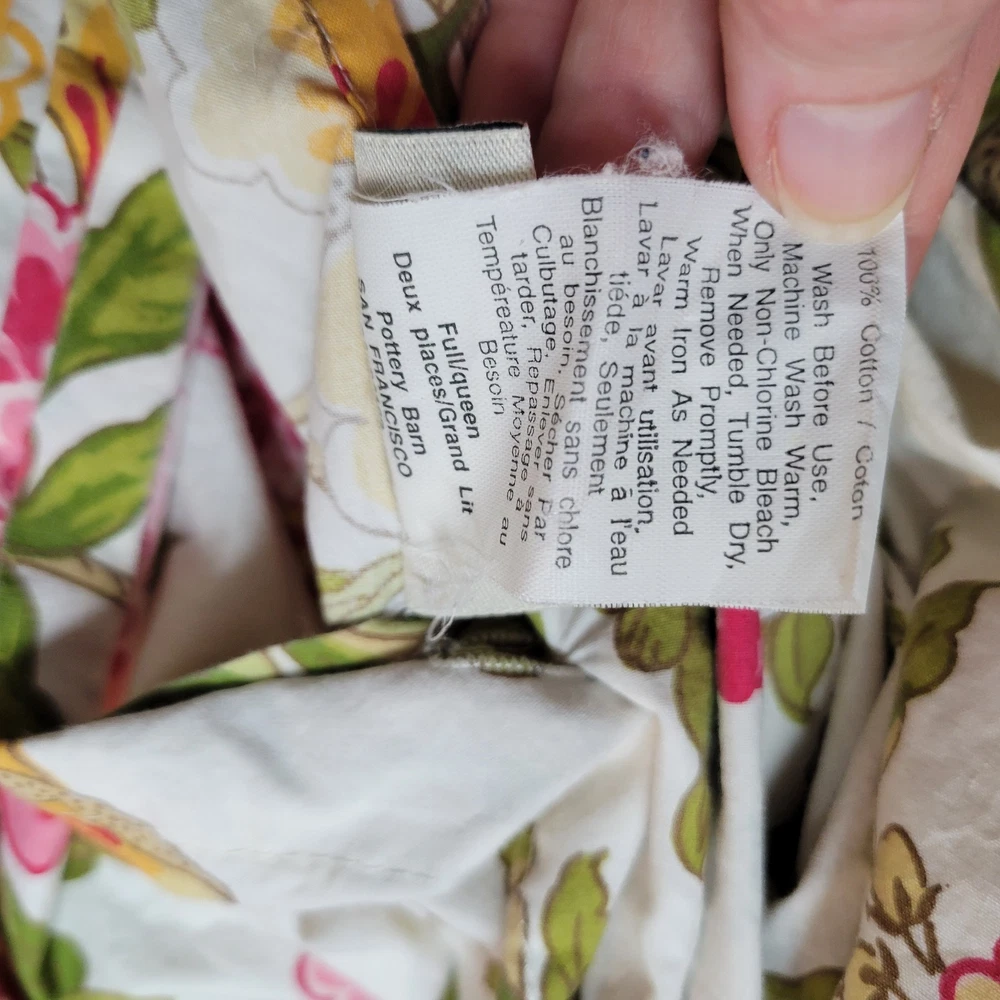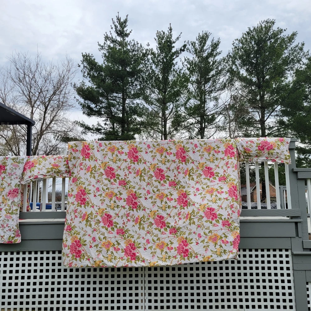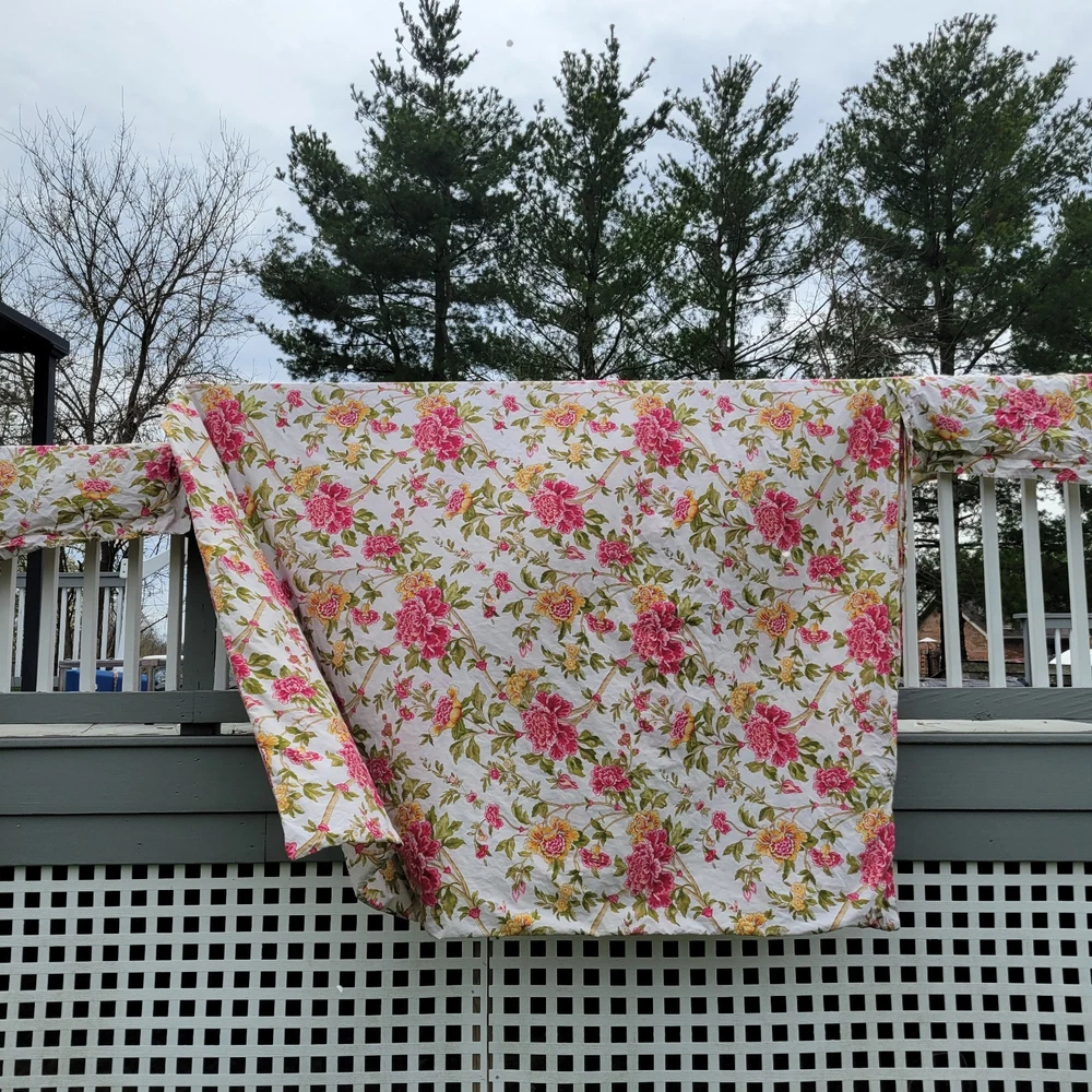Gorgeous and well made, 1 duvet cover, 2 Euro shams, 1 unknown rectangular item (possibly a Valance). Prairie, cottage core, granny, french country cottage, peonies, shabby chic, pink green floral Freshly Laundered and ready for use!