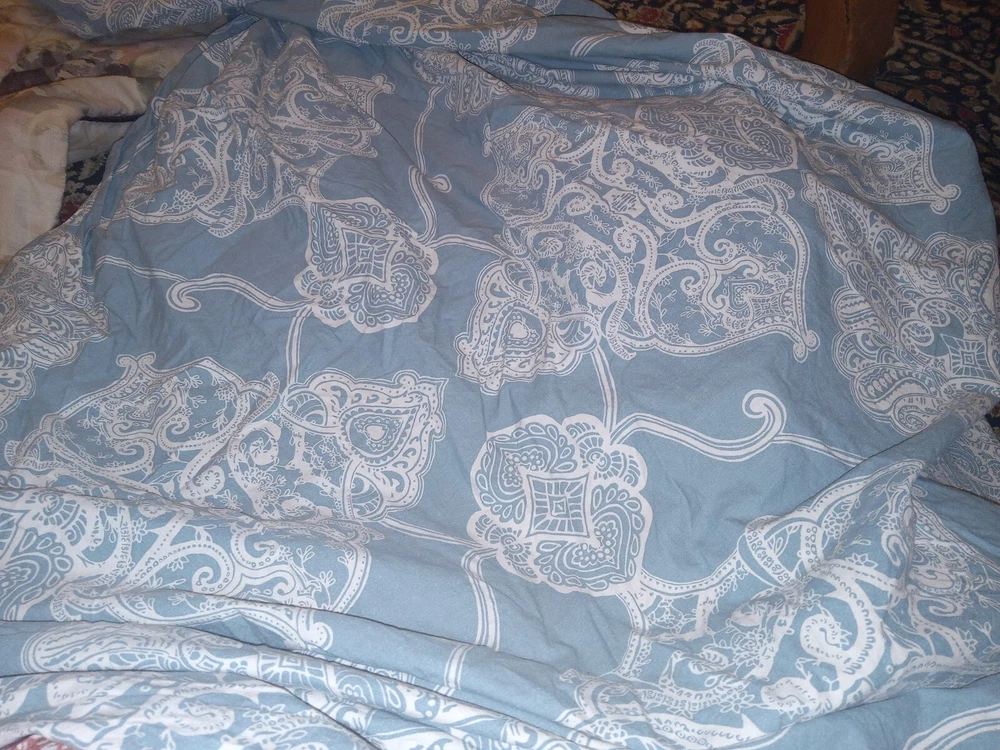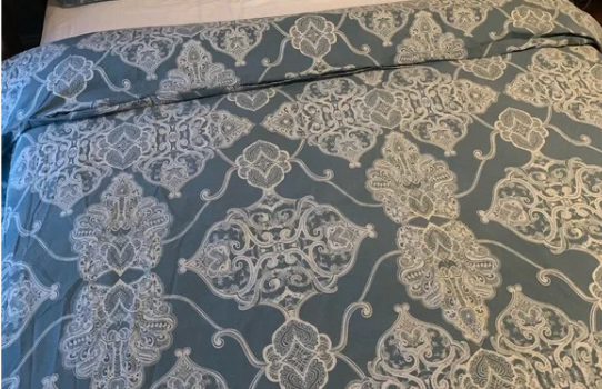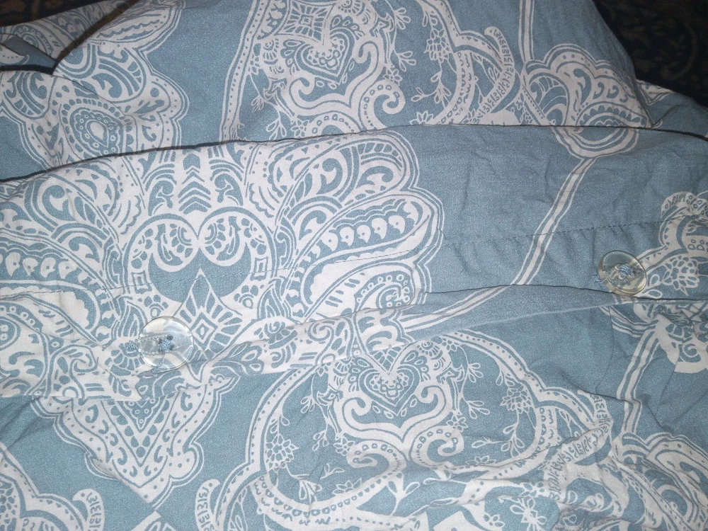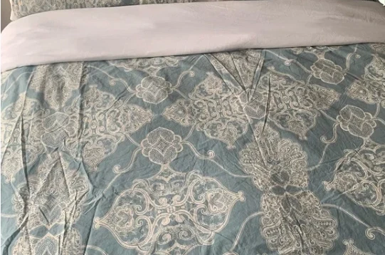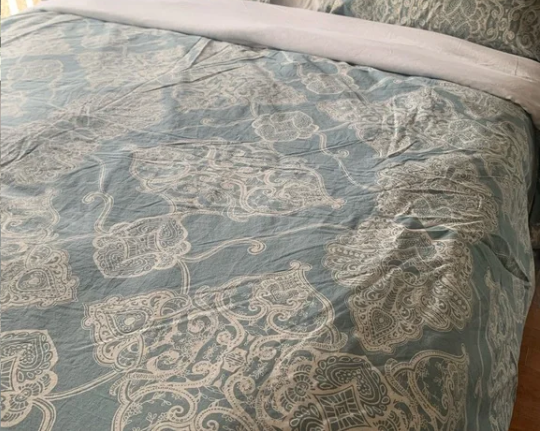 This duvet cover is gorgeous—the teal and off-white medallion pattern adds a touch of elegance to any bedroom. The 100% cotton feels soft and breathable, and the buttons make changing the duvet a breeze. It’s in excellent pre-owned condition, no stains or tears, just a few wrinkles from storage. Perfect for a fresh, stylish upgrade!