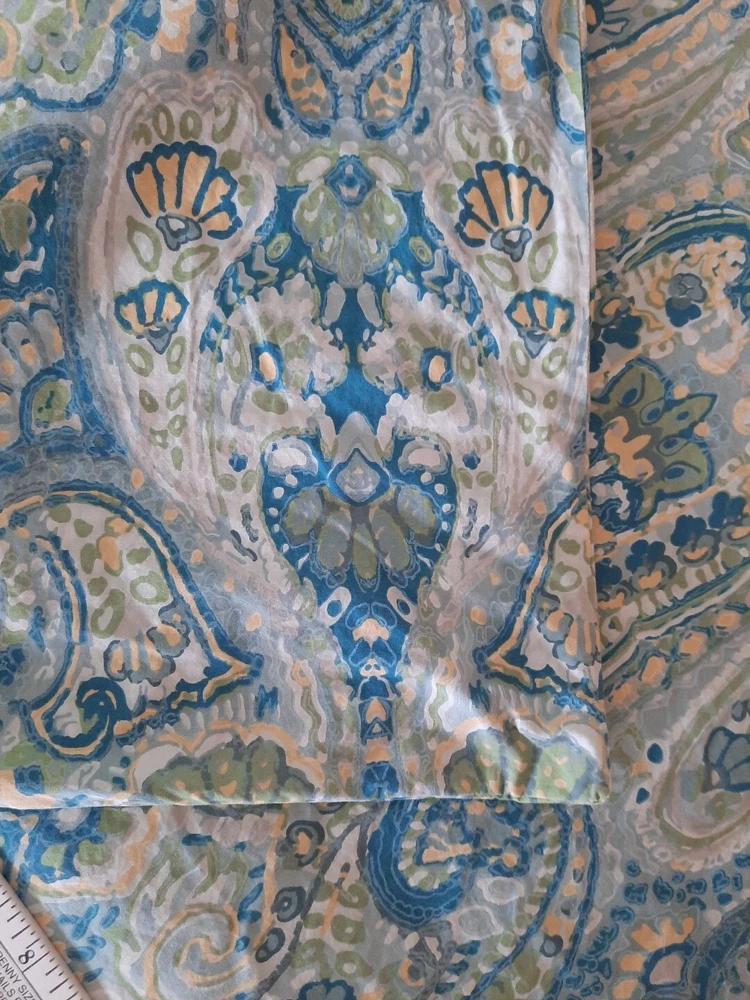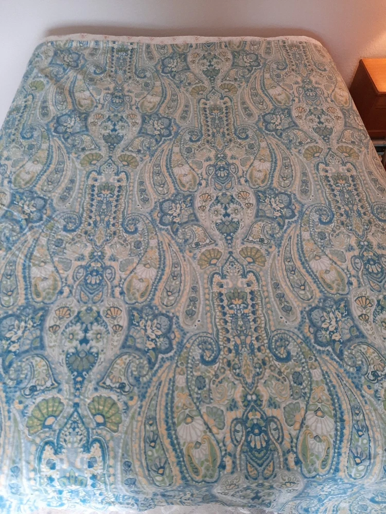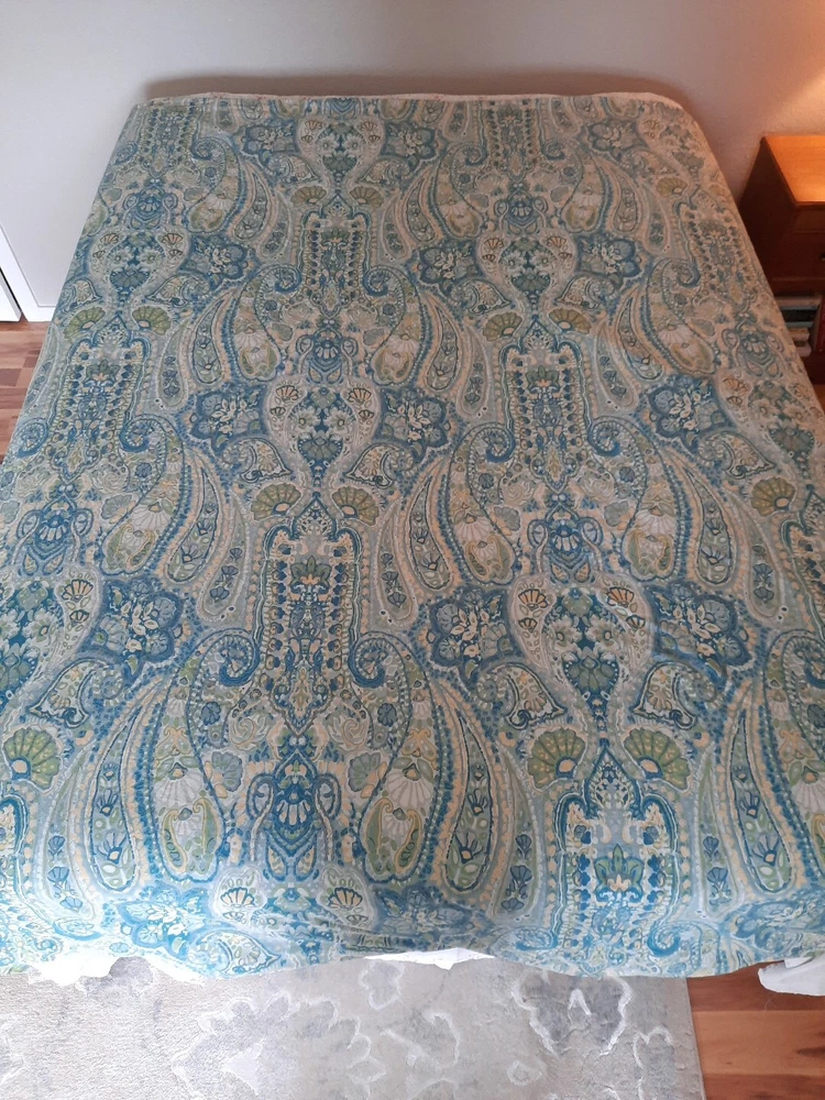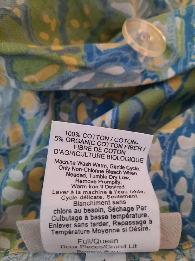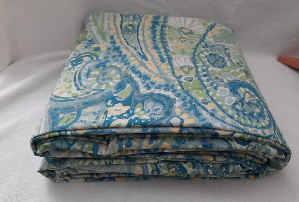 Item: Pottery Barn Duvet Cover Size: Full - Queen, same print both sides and reversible Color/Pattern: Rosalie Paisley, soft shades of blue, green, yellow, gray on off white background print Brand: Pottery Barn Condition: Pre-owned and well maintained, no holes or tears, item is in nice condition. Button closure, all buttons are intact, original manufacturer label sewn inside duvet . Freshly laundered at time of listing. Please see photographs for additional details. USPS shipping. Thank you, Chantal