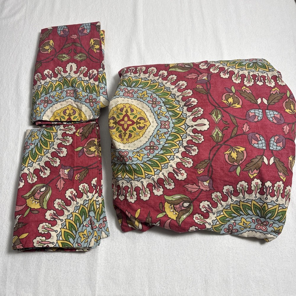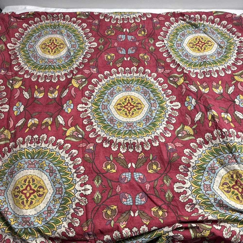 Style Profile: Boho, Colorful Flaws: No stains or holes - excellent condition - normal signs of wash and wear Color(s): Red, yellow, blue, green, white Additional Info: **fabric content is in item specifics and photos **items are stored in a smoke free environment **fabric sheets are not used during cleaning process ***ship same day or next day and offer free returns Feel free to message me with questions and happy to combine items for shipping discount. Thank you for visiting our store. Add a burst of color and bohemian flair to your bedroom with the Pottery Barn Full Queen Della Medallion Red Duvet Cover set. This three-piece collection features a rich red medallion pattern, bringing an elegant, luxurious feel to any space. Crafted from 100% cotton, including the fill material, the set promises breathable comfort and durability. The set includes a full/queen duvet cover and two standard shams, each meticulously designed with a rectangular shape that fits seamlessly on your bed. Easy to care for, the machine-washable construction ensures that maintenance is as simple as the design is stylish. Elevate your room with the timeless style of Pottery Barn and enjoy the perfect blend of fashion and function for your sleeping space.