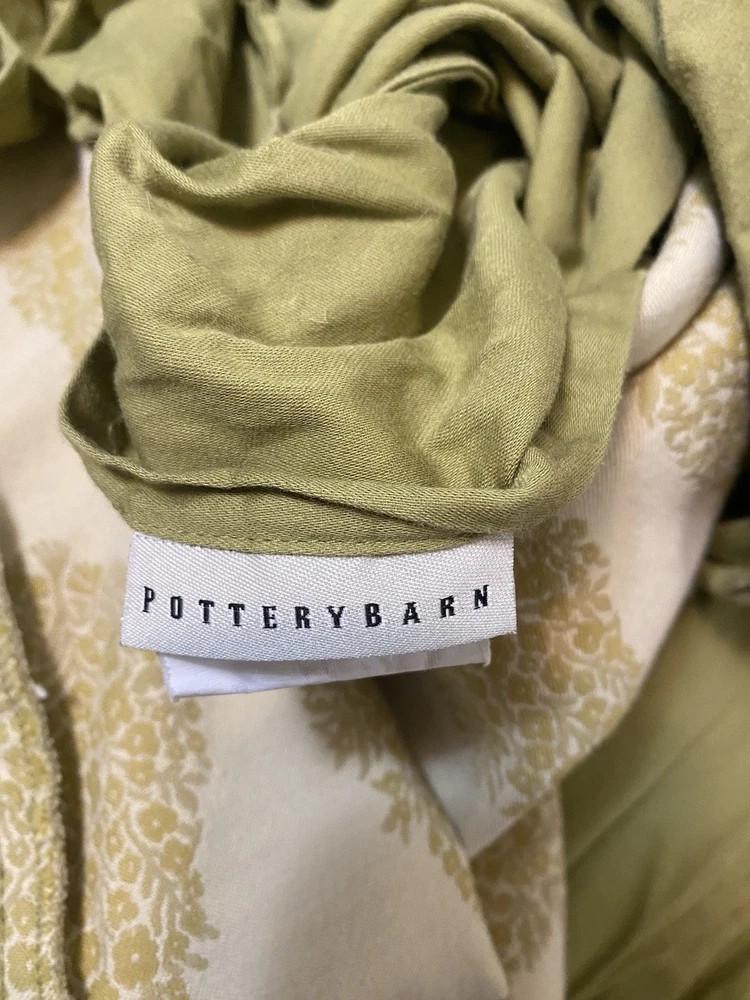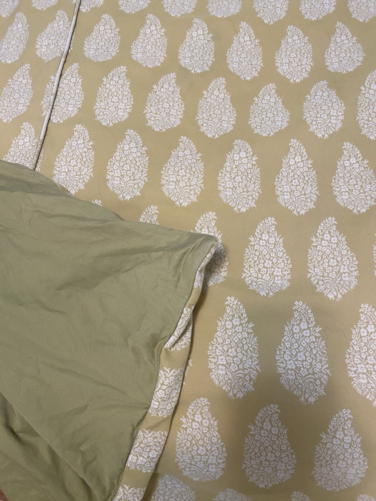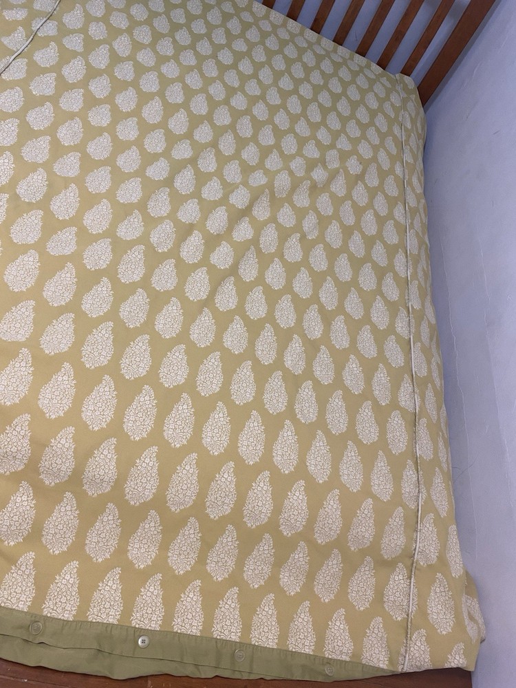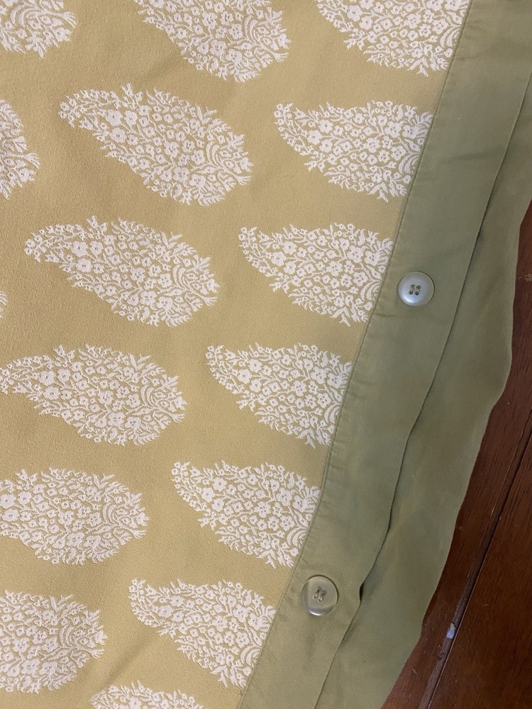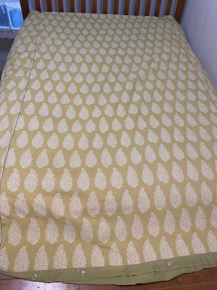The Pottery Barn Duvet Cover in California King size features a beautiful paisley pattern in lime green and white, adding a touch of nature and flowers to your bedroom decor. Made from 100% cotton, this duvet cover is machine washable for easy care. The button close design ensures a secure fit on your bed, while the rectangular shape provides a classic look. Perfect for creating a cozy and stylish sleeping space. freshly laundered. pet and smoke free environment.