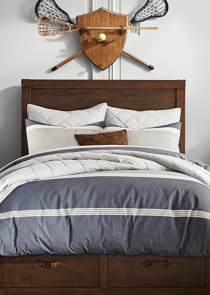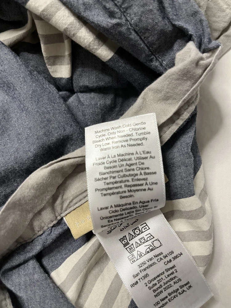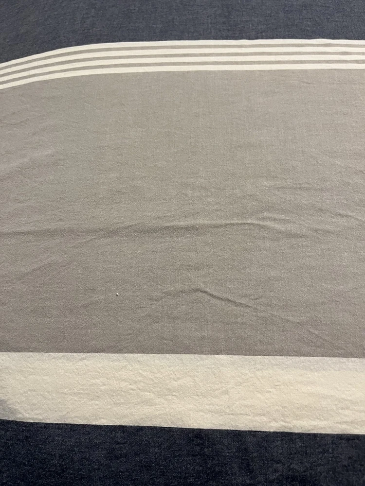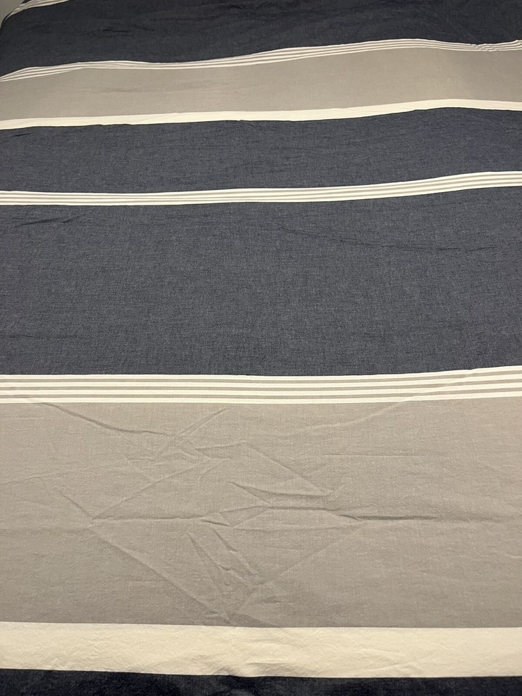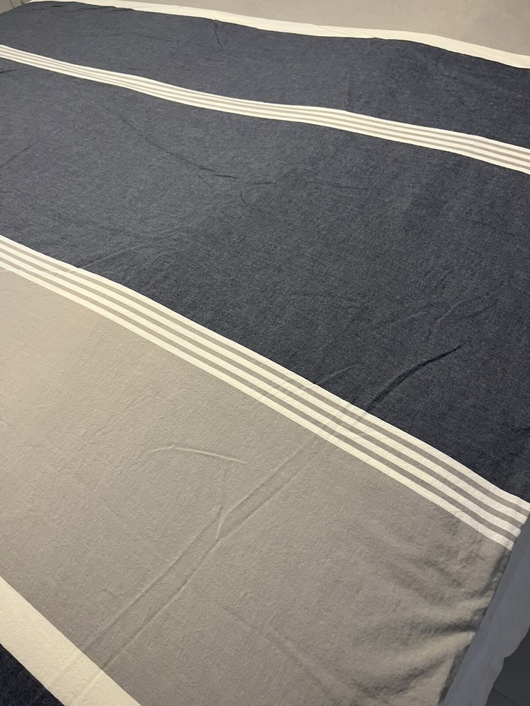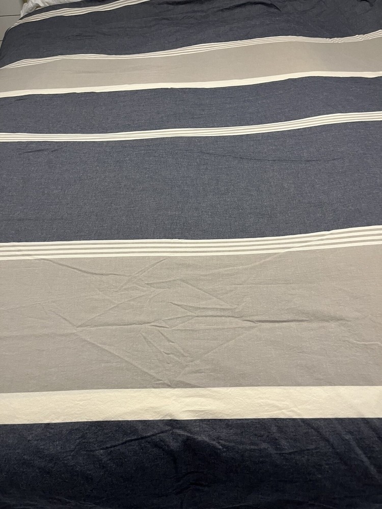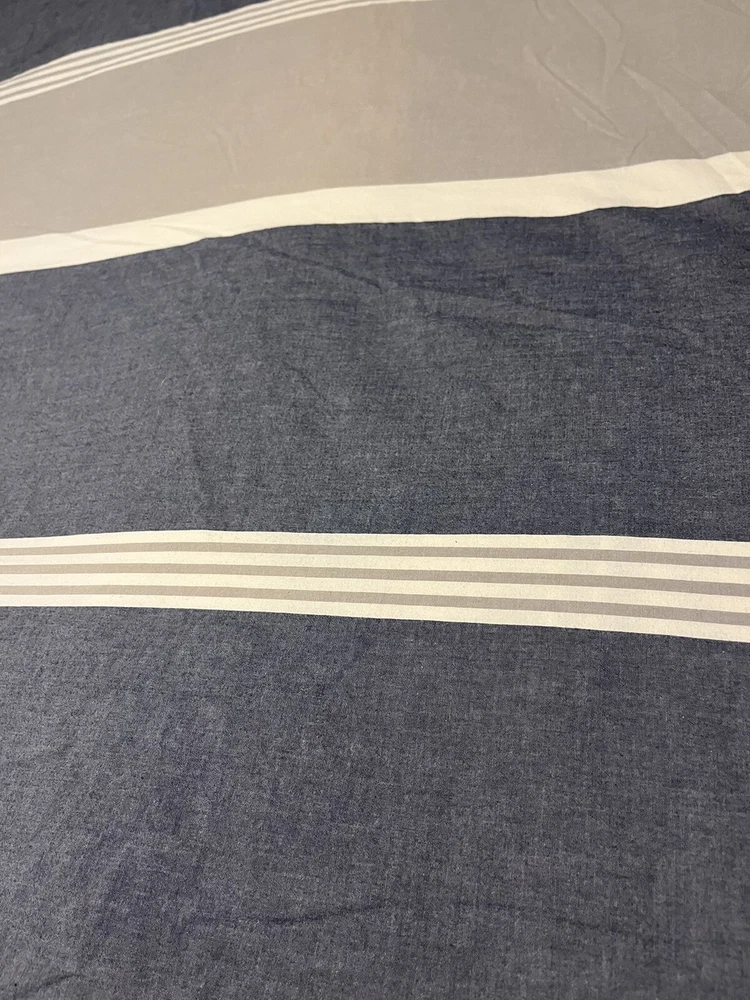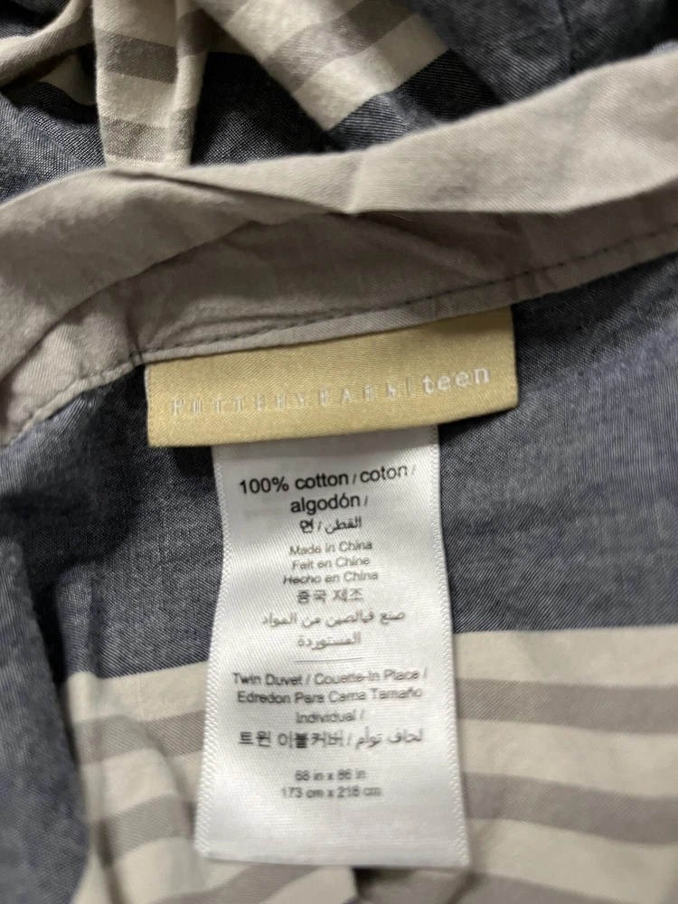 Pottery Barn twin size duvet cover. Beachstone pattern features stripes in blue, gray and cream. Reverses to same. 100% cotton percale; button closure. MEASUREMENTS: Twin duvet cover measures 68 x 86 inches. Pottery Barn Teen label. CONDITION: Very good vintage condition. Smoke/pet free home. No rips or tears. Please view all photos. SHIPPING: Prices quoted are for the United States.
