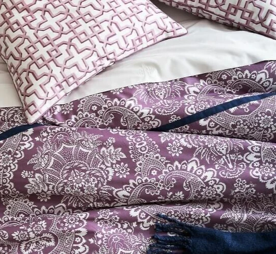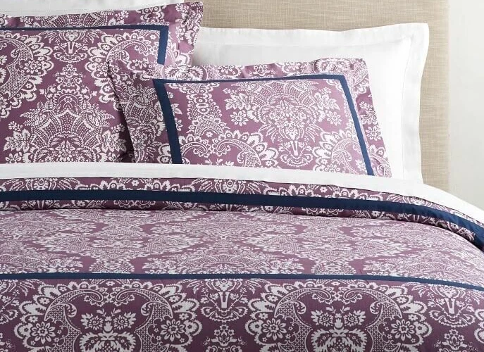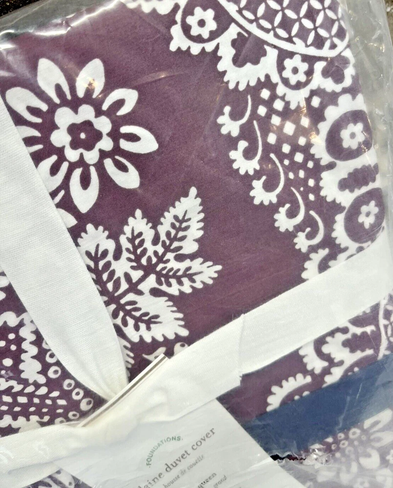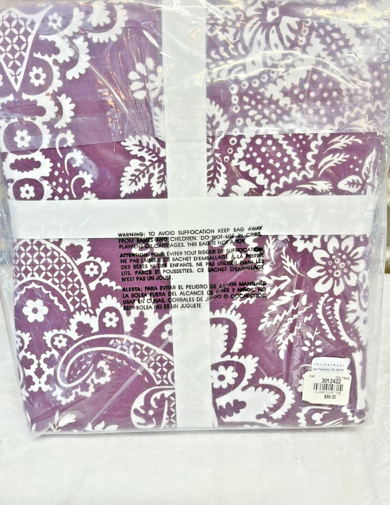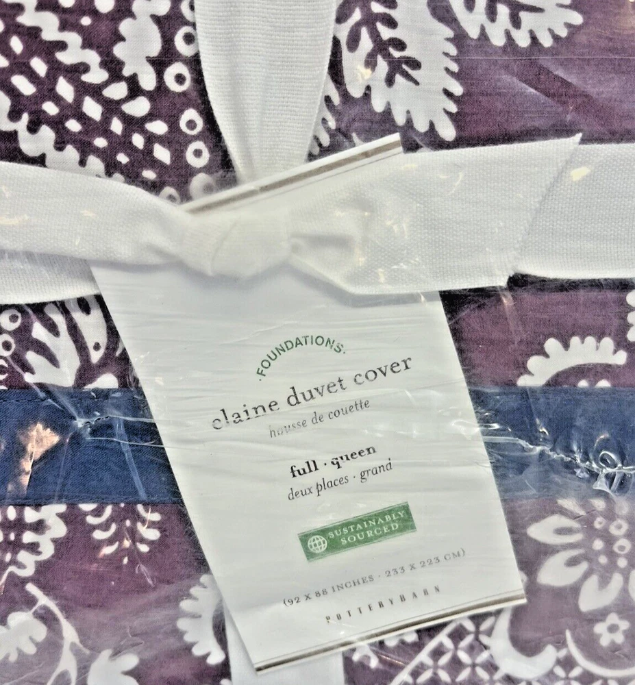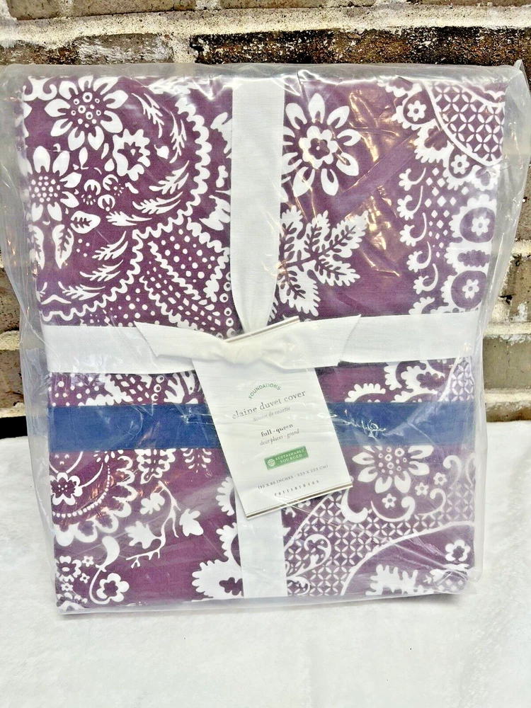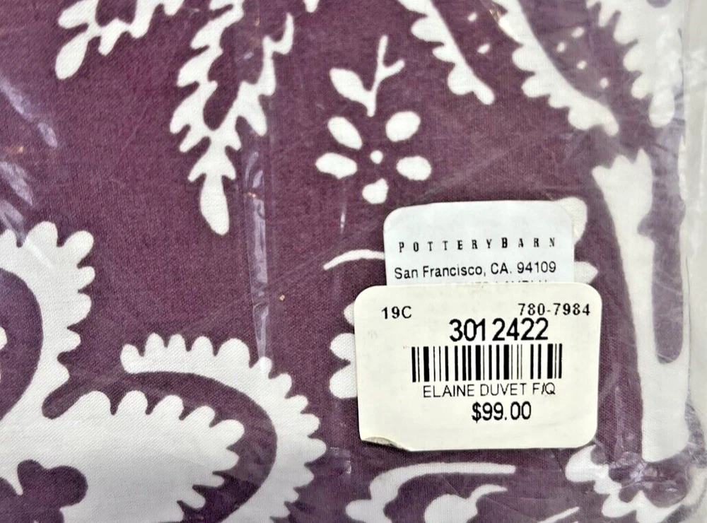 Brand New With Tags Retails for $99.00 + tax, so getting a great deal here Pottery Barn Elaine Damask Full / Queen. 92" x 88" You are getting 1 Duvet Only. (No shams) Size: Full / Queen Vibrant bedding Color: Purple with White floral damask pattern and blue trim Made of 100% cotton Duvet features a hidden button closure with inner ties that keep insert in place. Machine wash in cold; gentle cycle Tumble dry low Dimensions: Full / Queen: 92' x 88"