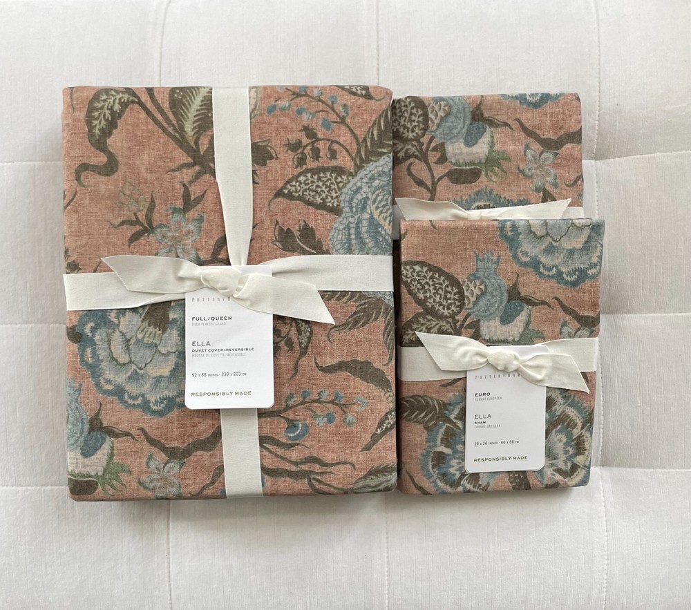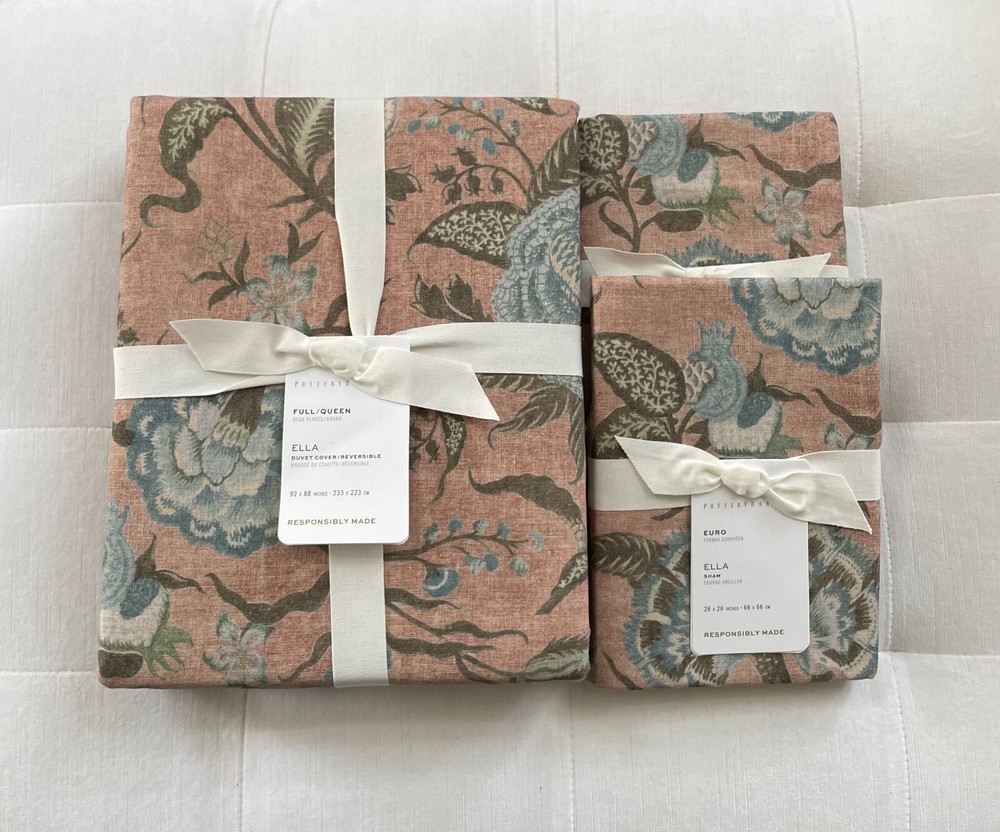 Pottery Barn Ella Reversible Duvet Cover Full/Queen & Two Euro Shams New with Tag PB describes as: Drawing inspiration from vintage kalamkari, the art of Indian block printing, we've reimagined tradition in a fresh, modern way. Our design features calming hues of blush and blue to soften your space. A repeating floral pattern on the back gives this bedding two-in-one versatility. Made from 65% cotton and 35% linen. Reverses to same. Duvet features a zipper closure with inner ties that keep insert in place; sham features a zipper closure. Duvet cover, shams and insert are sold separately. OEKO-TEX® STANDARD 100: tested for 1000+ harmful substances. 14.HUS.42449 HOHENSTEIN HTTI. Imported. Machine wash in cold water separately on gentle cycle. Use only non-chlorine bleach, if needed. Tumble dry on a low; remove promptly. Warm iron as needed. Full/Queen Duvet: 88" l x 92" w Euro Sham: 26" sq. Pet & Smoke free Ships within 1 business day. Thank you
