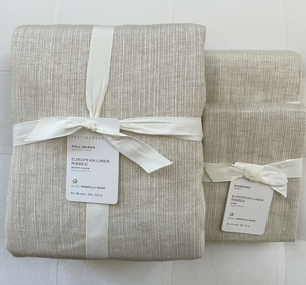 Pottery Barn European Ribbed Linen Duvet Cover Full/Queen & Two Standard Shams ~Flax New with tags PB describes as: Washed for incredible softness, our European Linen Ribbed Duvet and Shams offer just the right amount of texture for a look that's casually chic. The front is ribbed woven from 100% linen and reverses to 100% cotton. Offered in an array of go-with-anything neutrals, this bedding makes it easy to layer on a wash of subtle color. Front is ribbed woven from 100% linen. Reverses to 100% cotton. Prewashed for a super soft hand feel. STANDARD 100 by OEKO-TEX® Certified: tested for 350+ harmful substances to keep you and your family safe from chemicals common to textile manufacturing. Duvet features a hidden button closure with interior ties that keep insert in place; sham features an envelope closure and flange edges. Duvet insert sold separately. Machine wash. Imported . Pet & Smoke Free Home Shipped within 1 business day Thank you!