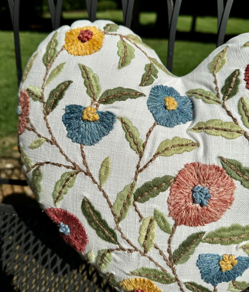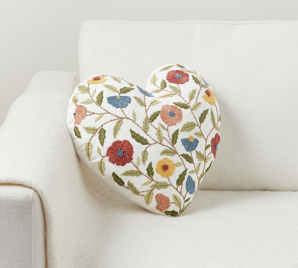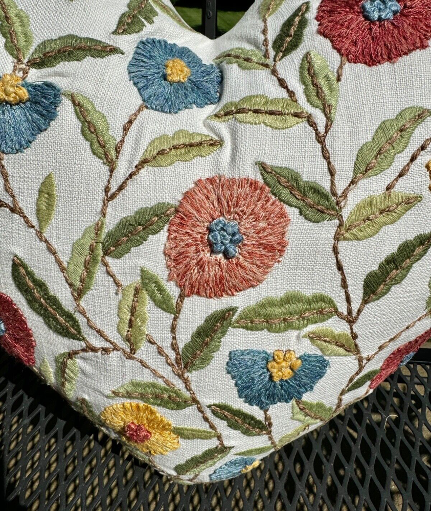 Pottery Barn Easter Spring Floral Heart Shaped Pillow! Brand New! Purchased directly from Pottery Barn! Add a touch of spring with this embroidered ivory pillow. Shaped like a heart and adorned in colorful florals, it has a way of cheering up any room in the home. Pillow made from 100% cotton. Back is sold ivory. Filled with 100% polyester fabric. Spot clean with a damp cloth. Blot to remove excess water. Air dry. Measures 16" w x 17" h x 5" D.