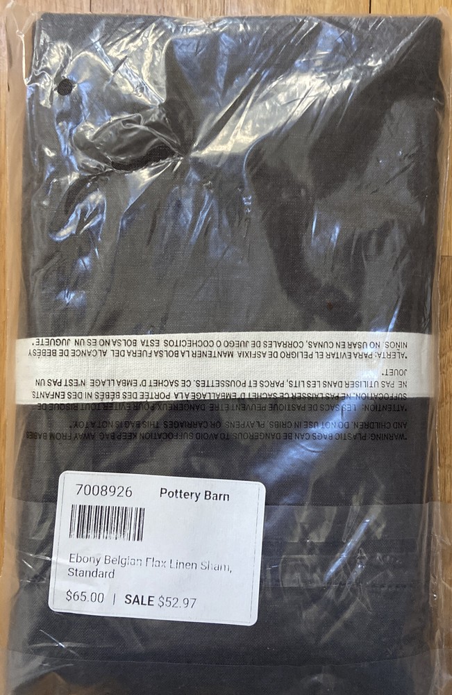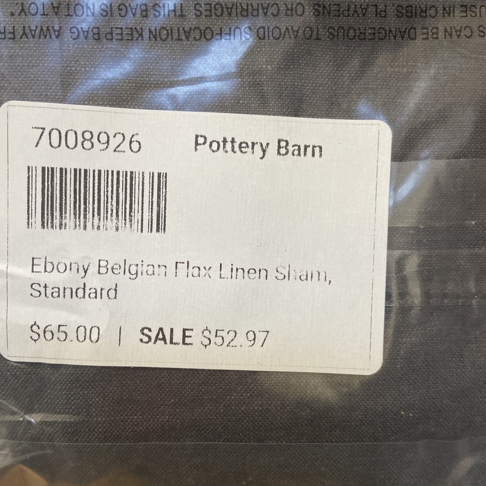 This listing is for one Pottery Barn Ebony Belgian Flax Linen STANDARD Sham Ebony. New in original packaging Ebay Store Policy ********************************************************************************************************** STORE POLICY: GENERAL: We are not authorized sellers of this item. Any warranty issued by the manufacturer may not be covered on this item. All markings, condition and serial numbers have been recorded on all items sold to prevent fraud! SHIPPING: WE ONLY SHIP TO PAYPAL VERIFIABLE ADDRESSES. WE DO NOT CHANGE ADDRESSES AFTER THE PURCHASE HAS BEEN MADE. PLEASE DO THAT AT THE TIME OF CHECKOUT. IN ADDITION, WE DO NOT SHIP TO APOs, FPOs, NOR PO BOXES If free shipping or flat rate shipping is offered, it does not include Hawaii, Puerto Rico, Alaska nor APOs or FPOs. Please ask what your shipping cost is prior to purchasing. PAYMENT: PAYMENT IS EXPECTED AT THE TIME OF PURCHASE OR WINNING BID. We try to describe everything so you will know exactly what you're buying. We have a NO return policy, and all items are sold as-is. We check everything when listing and prior to shipping out. We sell store displays, customer returns, open packages, distressed packages, overstocks, seasonal items & discontinued goods. We inspect each piece; if there are blemishes, defects or issues of any kind, they will be noted and photographed. Most items will need to be ironed or steamed. Please note: Some of our pre-owned items come from store overstock sales, estates sales and other sourcing opportunities. We do not know the history of the items and don't know if they've ever been exposed to cigarette smoke, perfumes, or animal scents. Clothing and bedding is clean, and there is no emanation of these aromas to us, but if you are sensitive to these issues, please keep this in mind. For makeup, toys, games and other new or like new products, if you are not already familiar with the product, please check the online reviews to see what others are saying about it. We are not the manufacturer and do not make nor guarantee any claims made by the manufacturer (i.e. Lipstick stays on for 8 hrs). Please do your due diligence before purchasing. ***Signature Required on all purchases of $250 and up*** All sales are final. The Item is as presented, listed & described to the best of my ability. Please understand that due to the many variations in monitors and browsers, colors shown in the listing’s picture may appear different on different monitors / devices. Computer monitors / devices are not all calibrated equally and the shade of color presentation in the listing’s picture is not precise and exact. Please ask us any questions. We are happy to help! Please look at all pictures provided, and should you have questions or need additional information, please feel free to contact us prior to purchasing. Our goal is 100% customer satisfaction. Should you have any problems with an item you purchased from us, please contact us for resolution prior to leaving negative or neutral feedback. We appreciate your business.