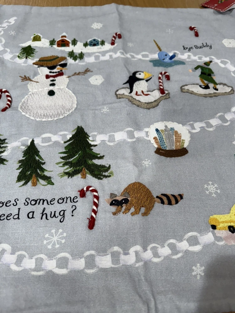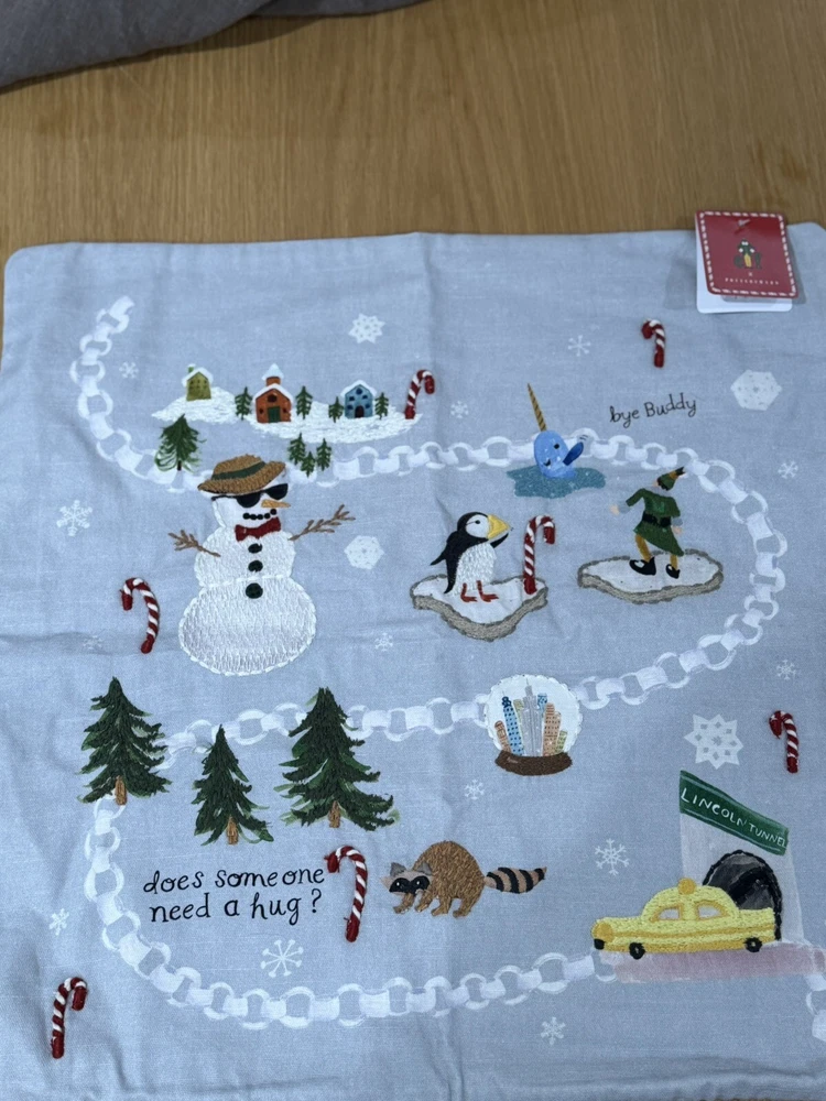 Made of a 100% cotton single slub with digitally printed scene. Reverses to a solid Gray. Trim is made from 100% polyester. Accommodates a 20" square insert. Not included Take a Buddy the Elf™ adventure across the seven levels of the Candy Cane forest, past the Sea of Swirly Twirly Gumdrops, and through the Lincoln Tunnel.
