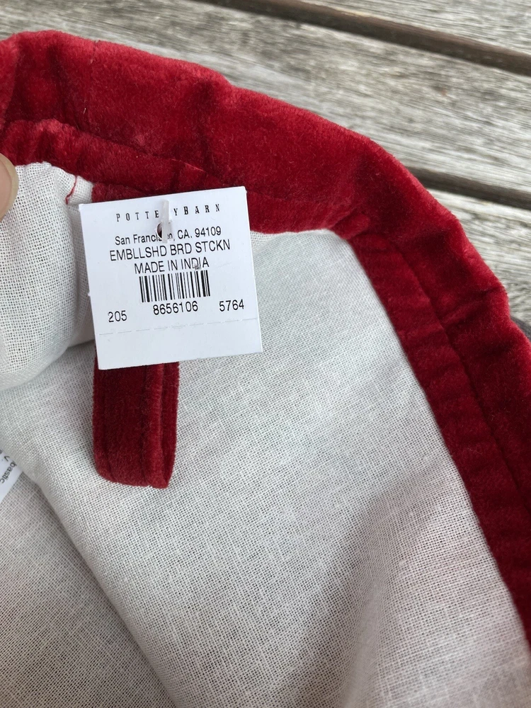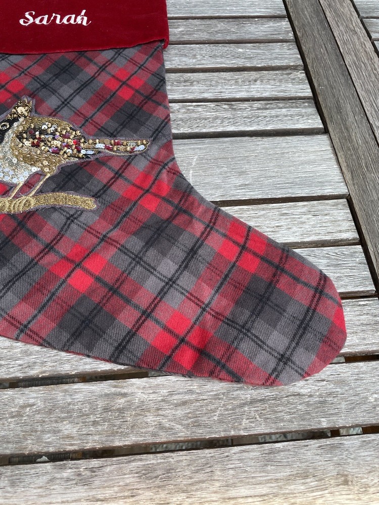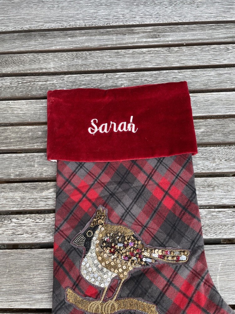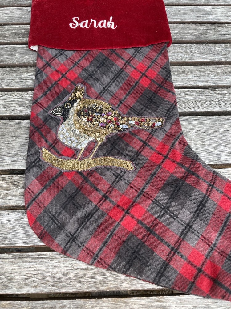 Pottery Barn Embellished Jeweled Bird Christmas Stocking Plaid Multicolor NWT New with tags item / open box - please note, this item is monogrammed in front as pictured, but there are a few flaws in the monogram Dimensions: 12.25” x 19.5”
