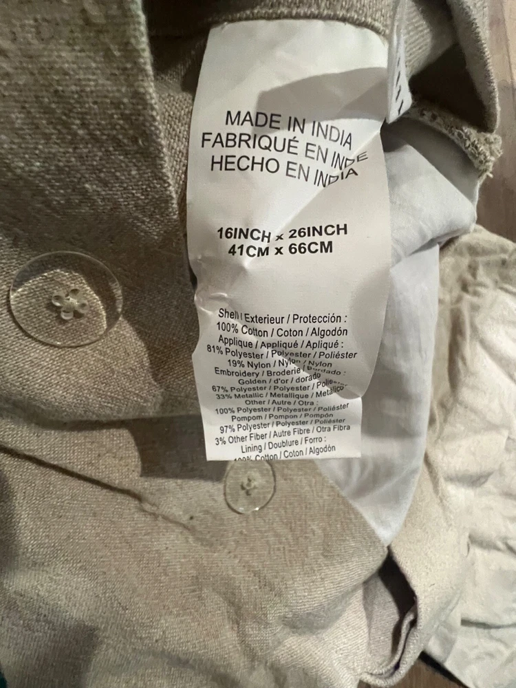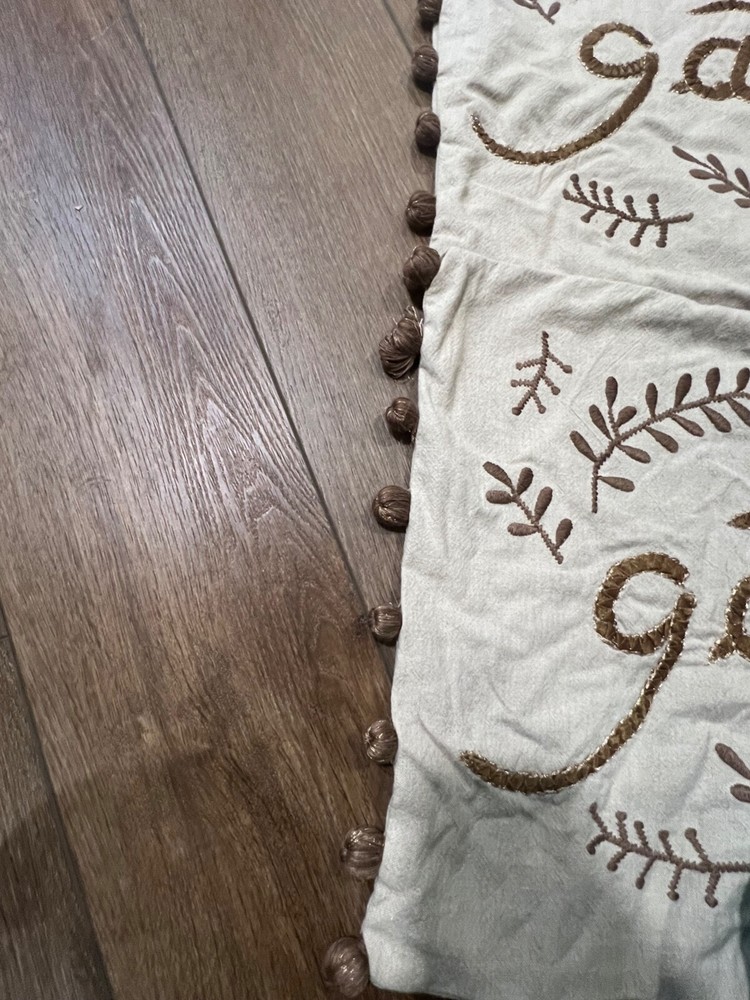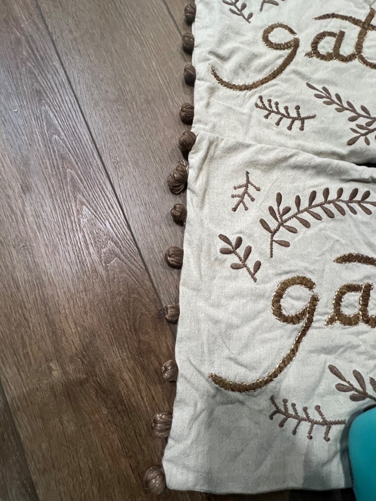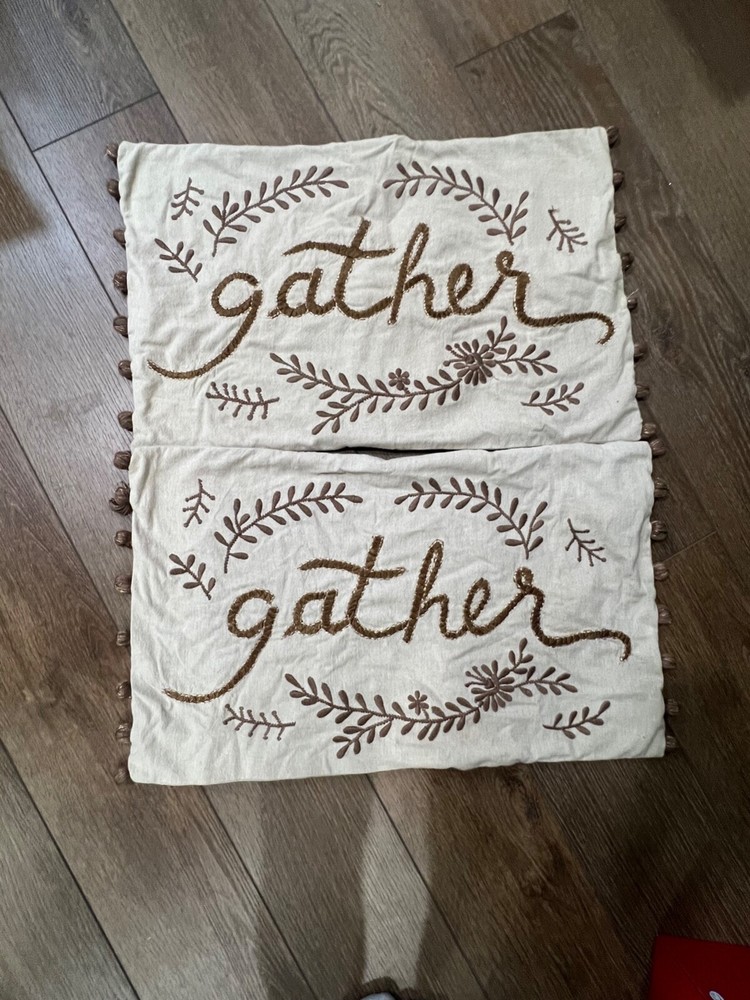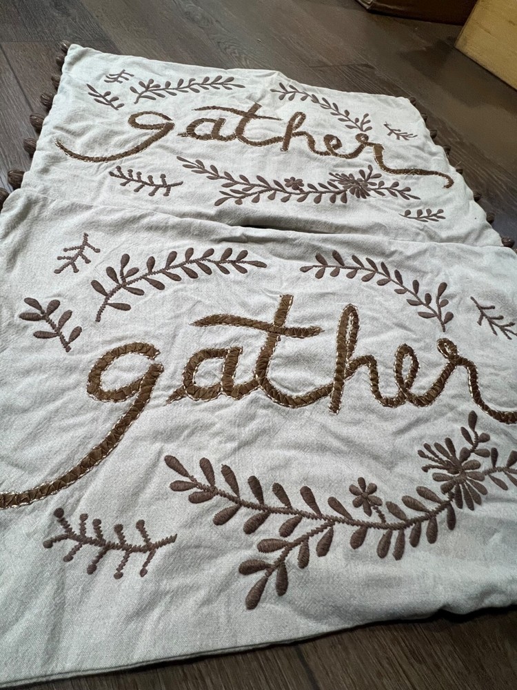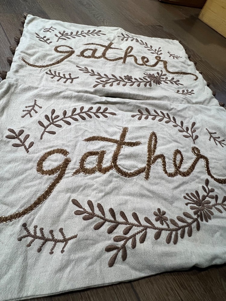 Set of 2 Pottery Barn Gather Embroidered Pillow Cover Fits 16" x 26" Pillow form, pillow forms NOT included Embroidered front print pillows with side pom-poms See photos for signs of wear, no noted stains or tears 100% cotton with button back