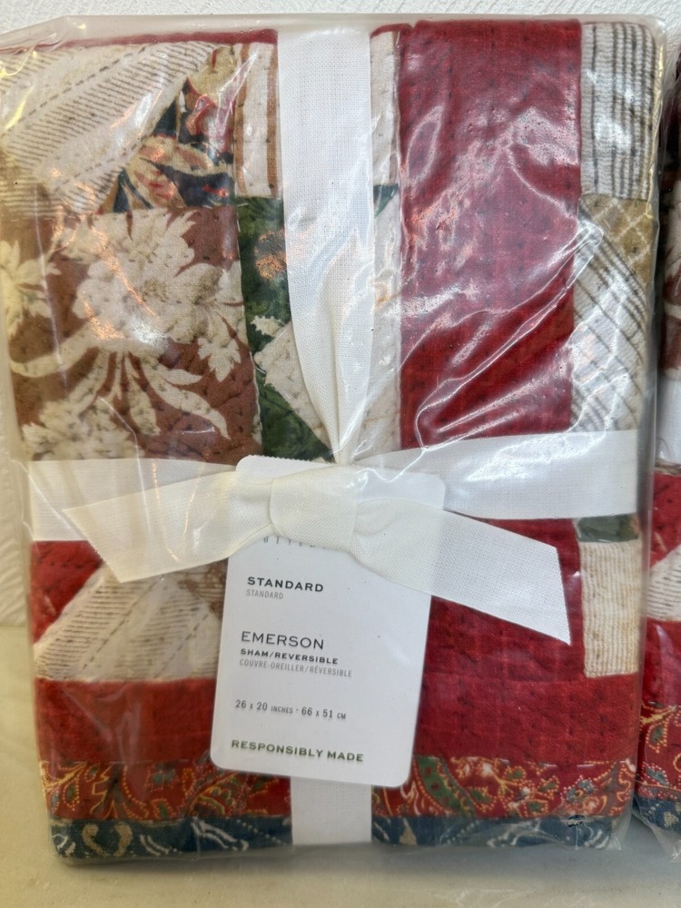 This Pottery Barn pillow sham set includes two standard-sized shams with a patchwork design featuring hand-stitched quilting in a multicolor palette. Made of 100% cotton, the shams measure 26 inches in length and 20 inches in width. They are machine washable and tumble dry safe, ideal for a cottage-themed bedroom. The shams are part of the Pottery Barn Emerson collection, adding a touch of nature, luxury, and romance to your bedding.