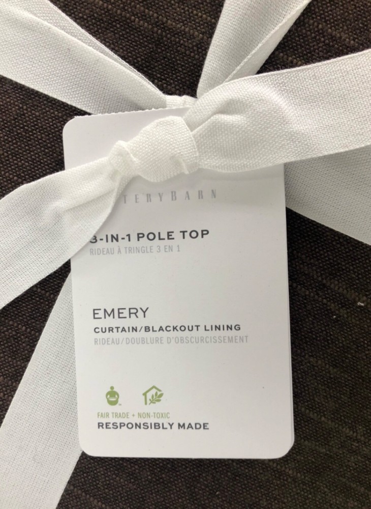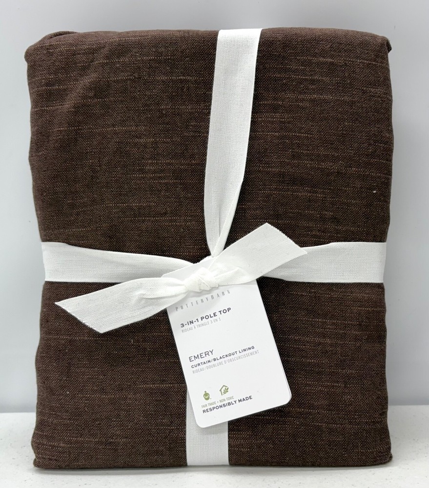 Pottery Barn Emery Linen/Cotton 3-in-1 Curtain BLACKOUT LINING 50" x 84" Espresso Listing is for 1 Curtain New Pottery Barn Describes This Item As Follows: Made to elevate any room, Emery is woven from a blend of linen and cotton. This tailored midweight curtain has a slight weathered look that's subtly textured and perfectly relaxed. Plus its lined for maximum light filtration Made of a 73% linen and 27% cotton blend Blackout liner: Crafted from 100% polyester, it prevents most light from entering windows to help darken the room Detailed with blind-stitched hems Our curtain’s 3-in-1 construction offers three hanging options: pole pocket, back tabs, ring top. Curtain hooks Included; Round Rings and Clip Rings Not Included. Dry-clean only. Imported. 50" wide x 84" long Side Hem: 1" wide Bottom Hem: 4" high Pole Pocket: 3" high Loops: 0.5" wide x 3.25" high Note: Length includes height of pole pocket. Any advertised shipping is for shipping within the contiguous 48 states and only applies to physical addresses (not PO Boxes). Please contact us for shipping costs to Alaska, Hawaii, US Protectorates, APO/FPO addresses and PO Boxes. All items are stored in a smoke/pet free environment. e*fairtrade is a third party seller and is in no way affiliated with Pottery Barn, Pottery Barn Kids, PB Teen, or any of its affiliates, and as such, cannot offer or guarantee warranties, implied or otherwise, on any of our items.