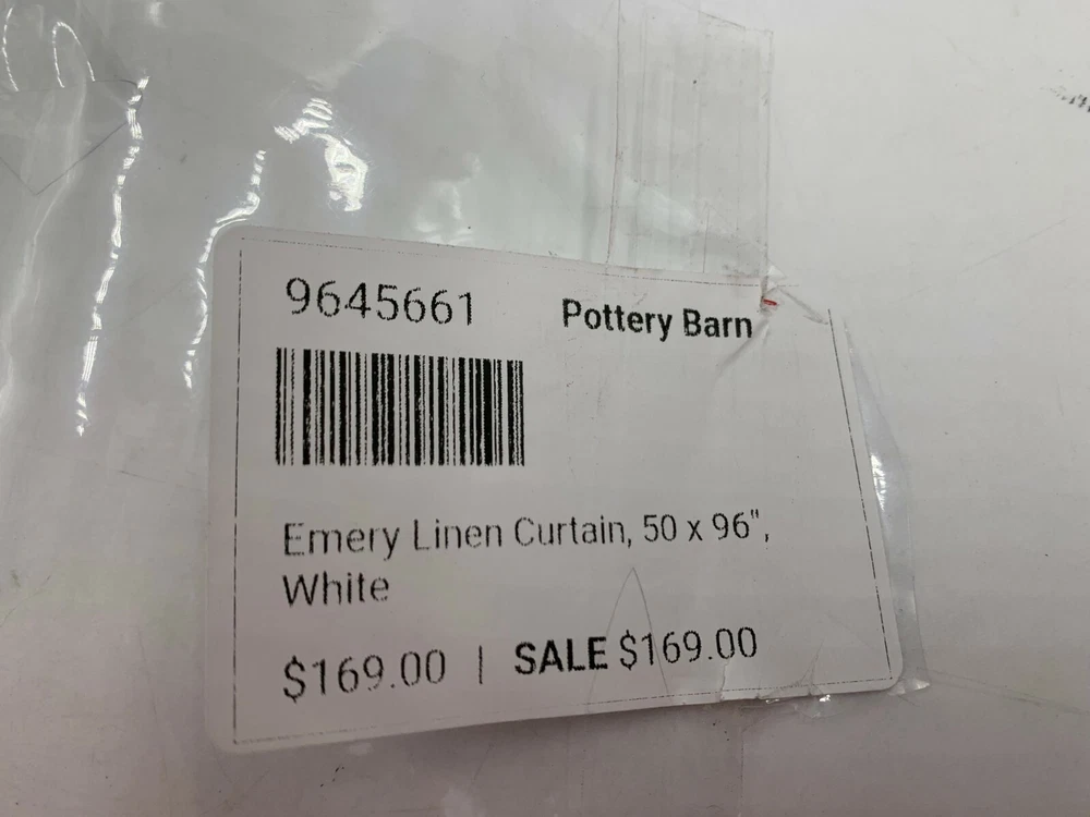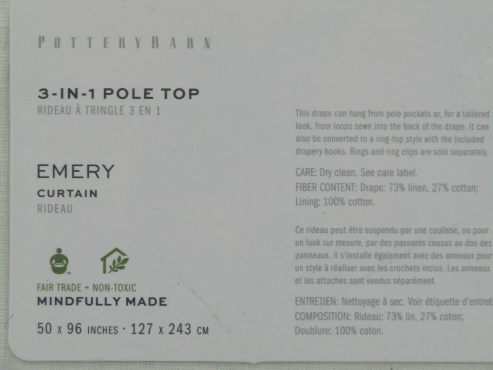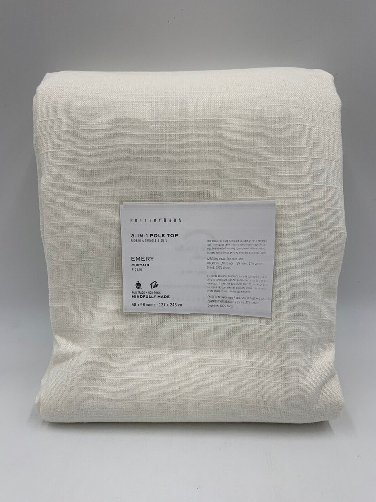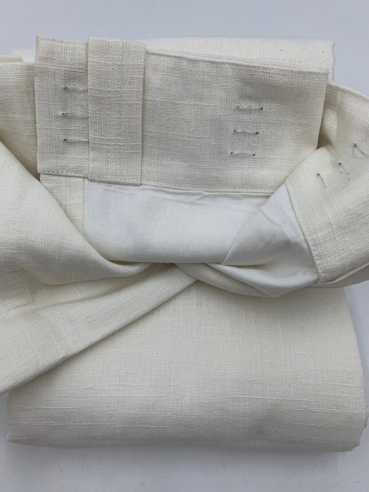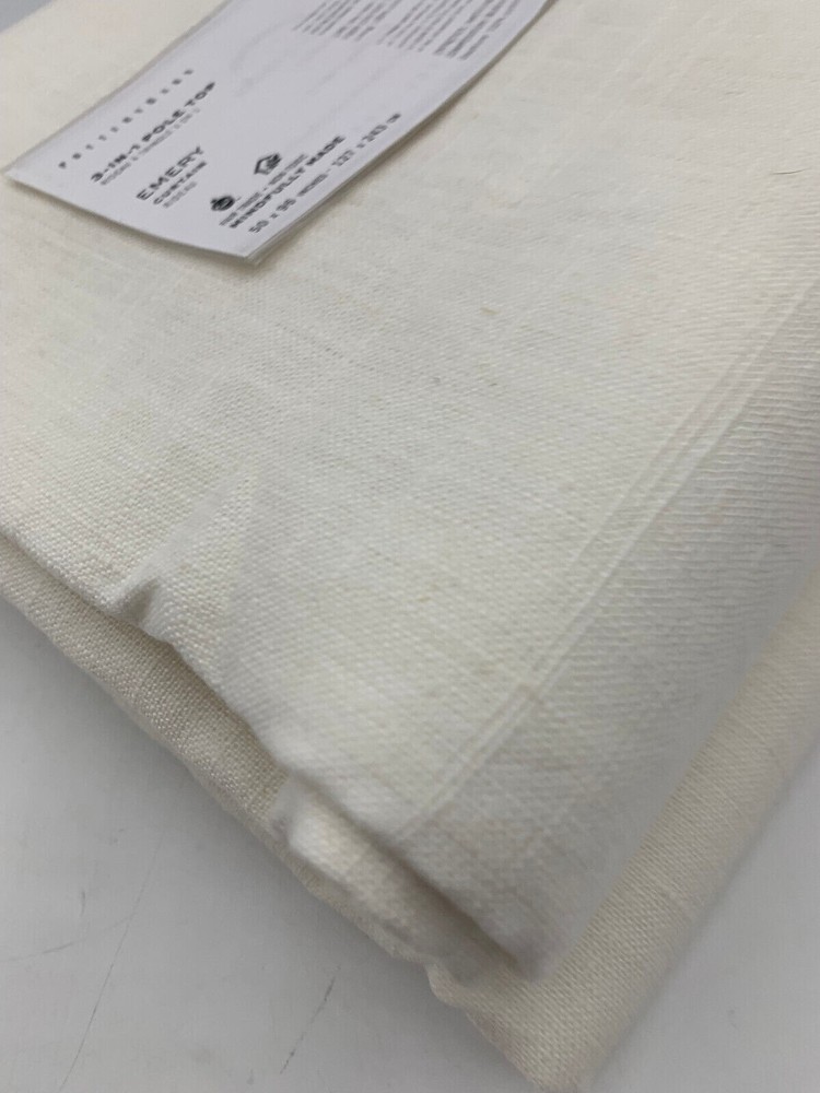 Pottery Barn Emery Linen Cotton Rod Pocket Drape Panel 50x96" Ivory - Tag will say WHITE from pottery barn, the are not white. They are Ivory. See Pictures Provided! Pottery Barn Got It Wrong! Item is brand new! In original packaging. Attention! These panels are Ivory, although pottery barn's official color is white, they are not white, the mpn number #9645661 also refers to them as being white, they are not white. I have taken a picture of them for you to clearly see that they are ivory. You can see that the cotton lining is white and the panel next to the cotton lining is ivory not white. If you have any questions, please ask me. All hooks are included as well. Pottery Barn I believe got this wrong! Auction includes: 1 Drape - 50x96" Color: Off white/Ivory - Not White! Made of a 73% linen and 27% cotton blend; with flax fibers imported from France. Fair Trade Certified™. Detailed with blind-stitched hems. Curtain’s 3-in-1 construction offers three hanging options: pole pocket, hanging loops, ring top. Curtain hooks included. Use with 9 Clip or Round Rings for 50" wide panel Dry-clean only. Imported. DIMENSIONS 50" wide x 84" long 50" wide x 96" long 50" wide x 108" long 100" wide x 84" long 100" wide x 96" long 100" wide x 108" long Side Hem: 1" wide Bottom Hem: 4" high Pole Pocket: 3" high Loop (9): 0.5" wide x 3.25" high Note: Length includes height of pole pocket. CARE AND MAINTENANCE Dry-clean only.