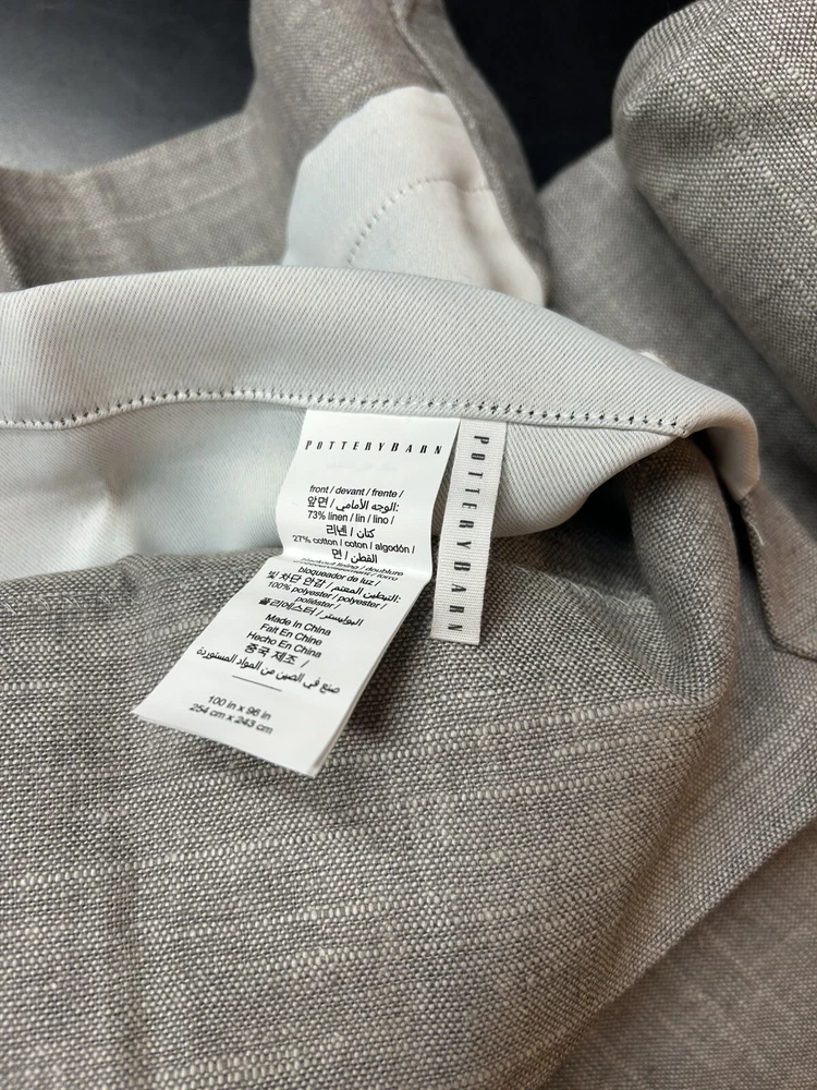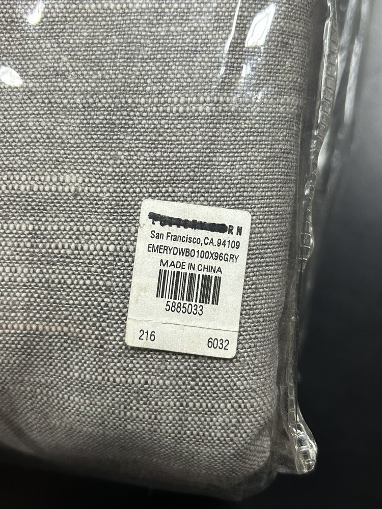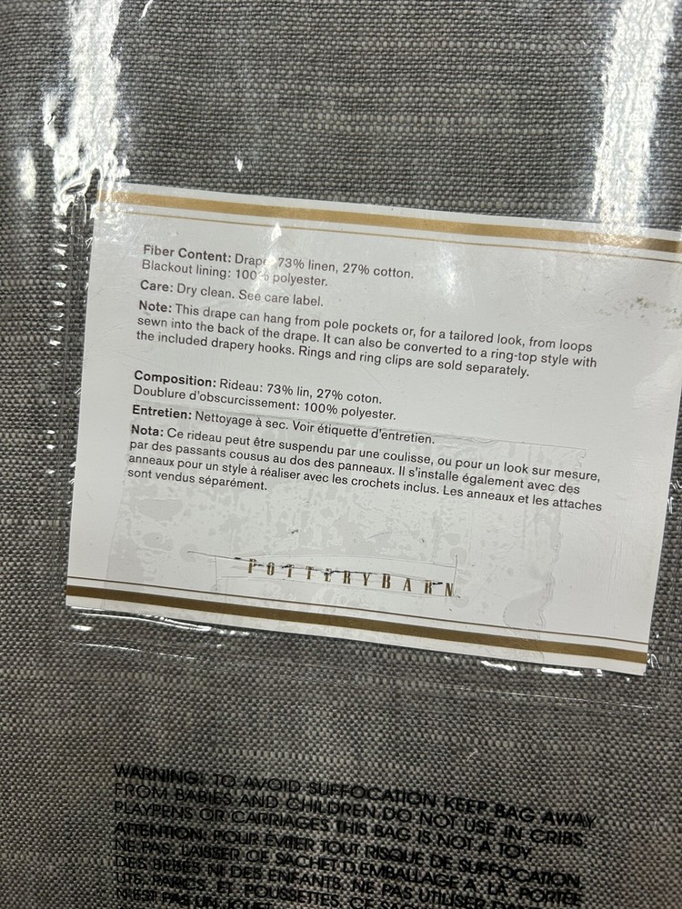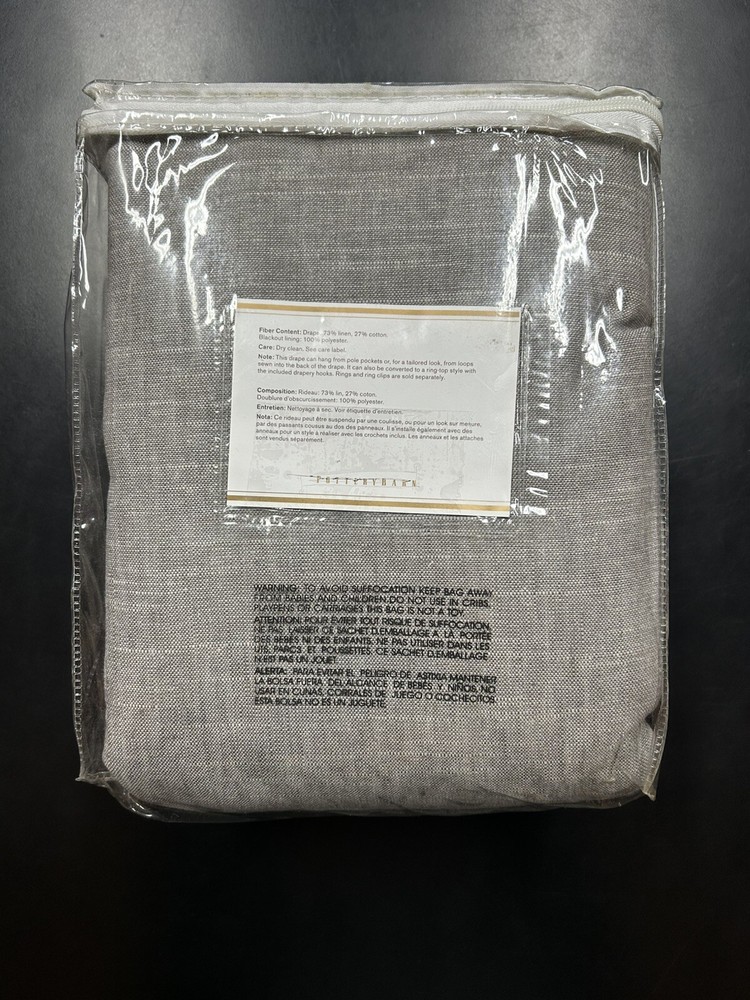 Beautiful curtain panel from Pottery Barn's Emery Linen drapery collection in 'gray' which is a nice neutral with some tone-on-tone variation in the weave. The linen blend fabric has a classic, clean, crisp feel. The fabric is medium weight and features blackout lining and a 3-in-1 style top so you can use as a pole top, tab top or with hooks. New in package. Opened to confirm contents and quality and resealed. Includes hanging instructions and drapery hooks. 1 panel Gray Blackout lining 3-in-1 style top 96" long by 100" wide Original retail price $369