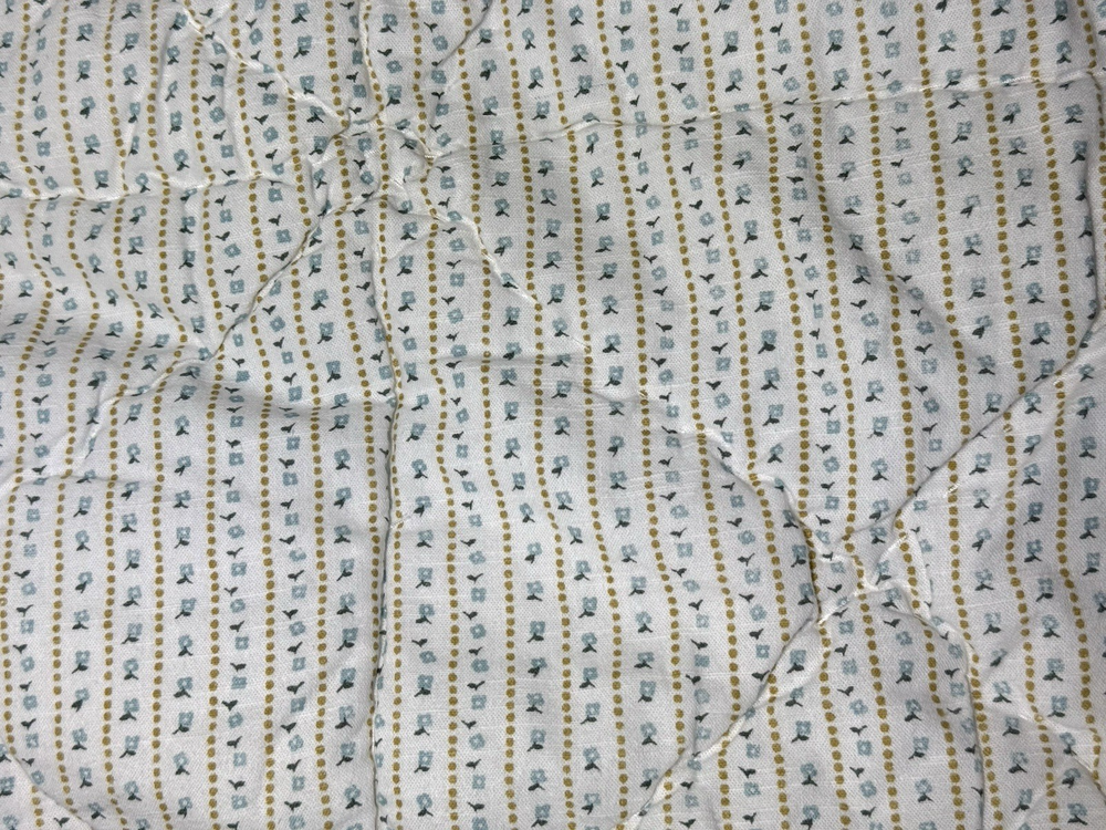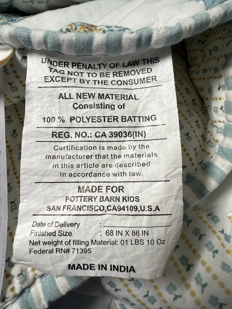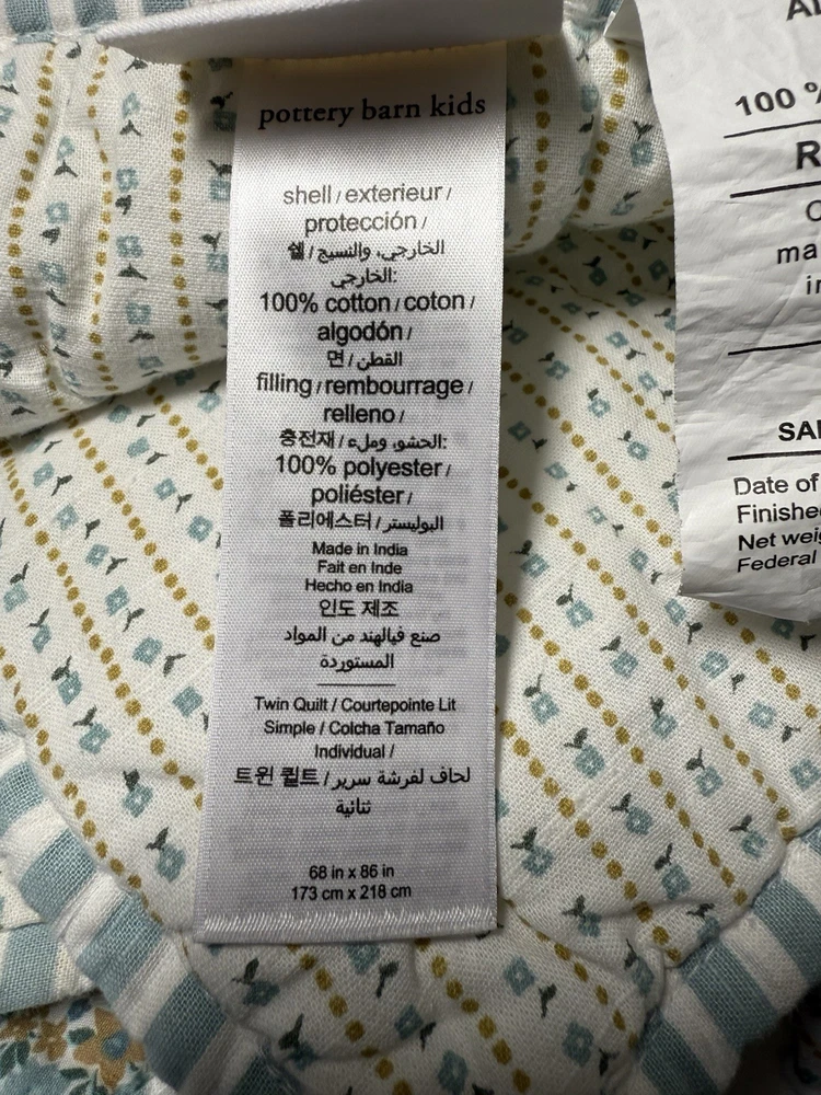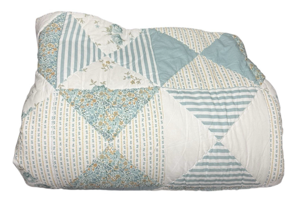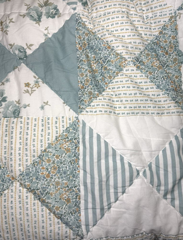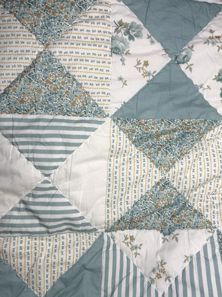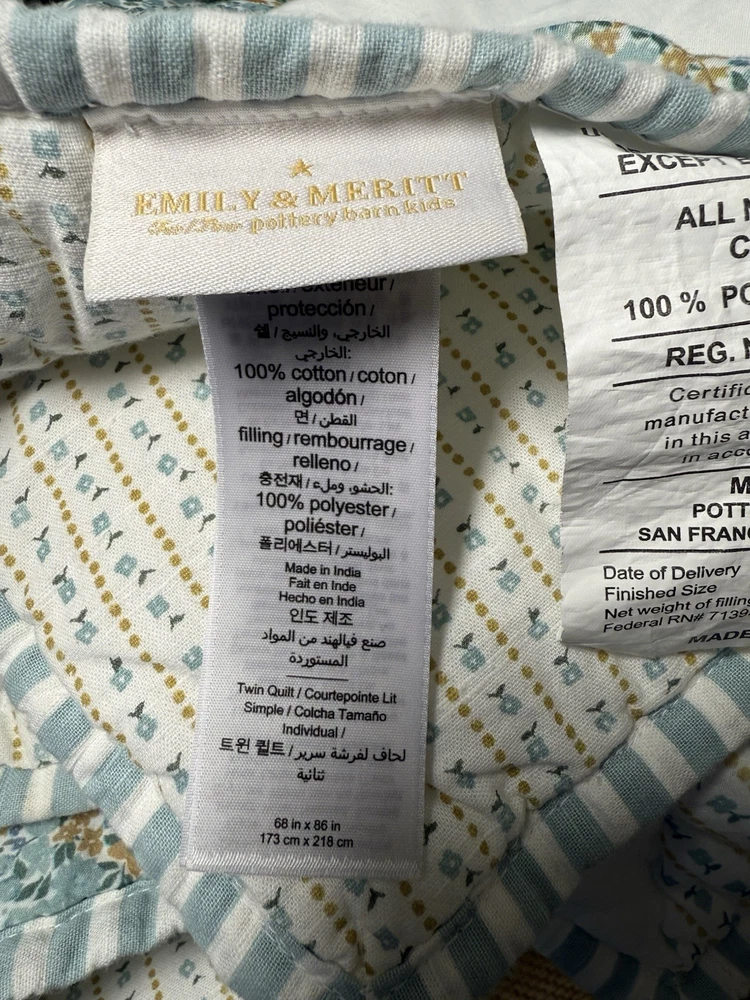 Pottery Barn Emily Meritt Quilt TWIN Triangle Patchwork Floral Comforter Blanket Pottery Barn Kids Emily and Meritt Quilt Triangle Patchwork Floral Twin size Reversible, Hand quilted Made of 100% cotton voile Filled with 200-gram weight 100% polyester Measures approx 86" x 68" Triangles in cool shades of blue take shape on our reversible quilt, adding pretty patchwork style to your little one’s bed. It’s handwoven from pure cotton so it’s a lasting addition to their sleep space. What’s more, the included floral sham complements the layer beautifully, allowing you to reverse both designs and change the look of their bedding. Imagined exclusively for Pottery Barn Kids by fashion designers Emily Current and Meritt Elliott, it captures their adventurous yet chic aesthetic. Preowned good condition